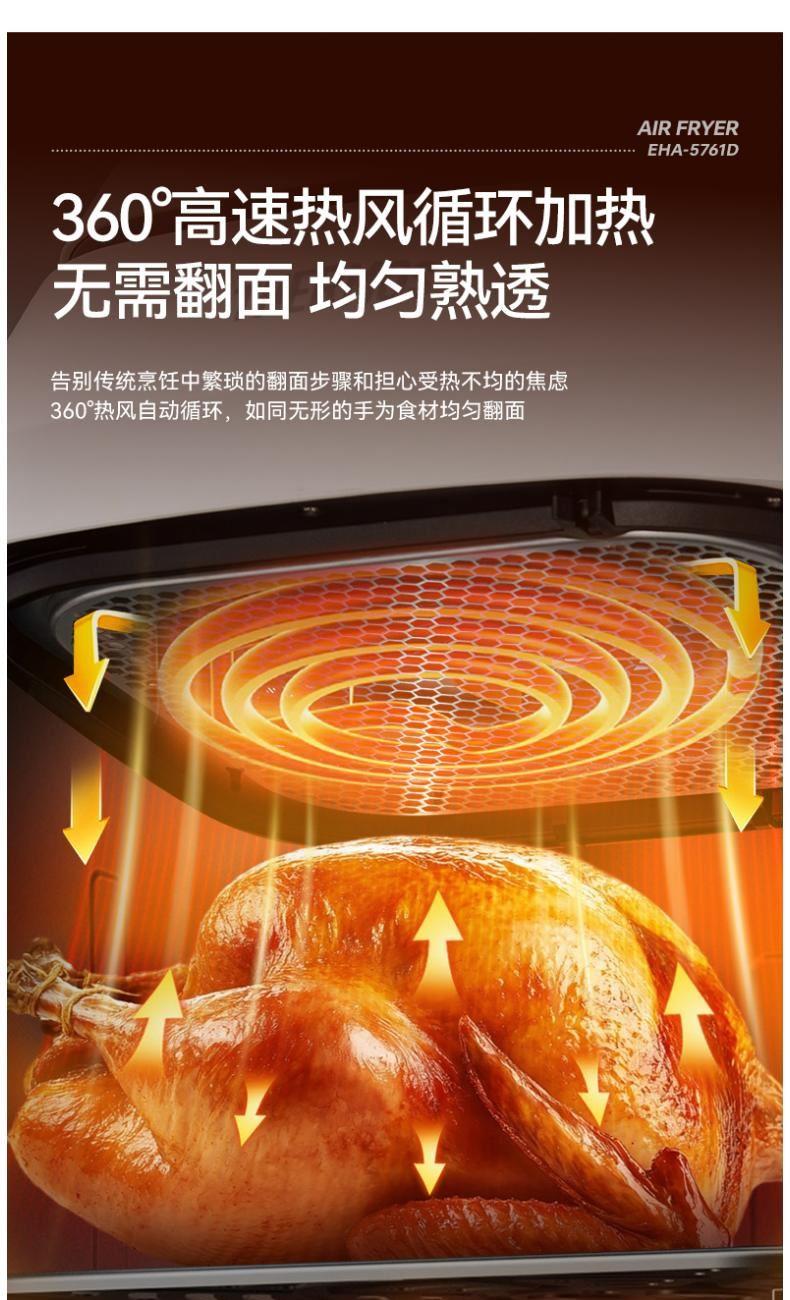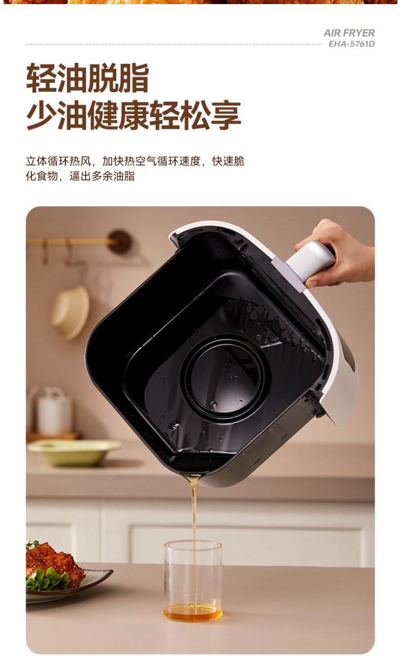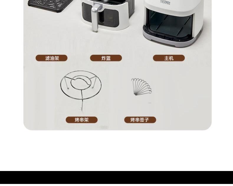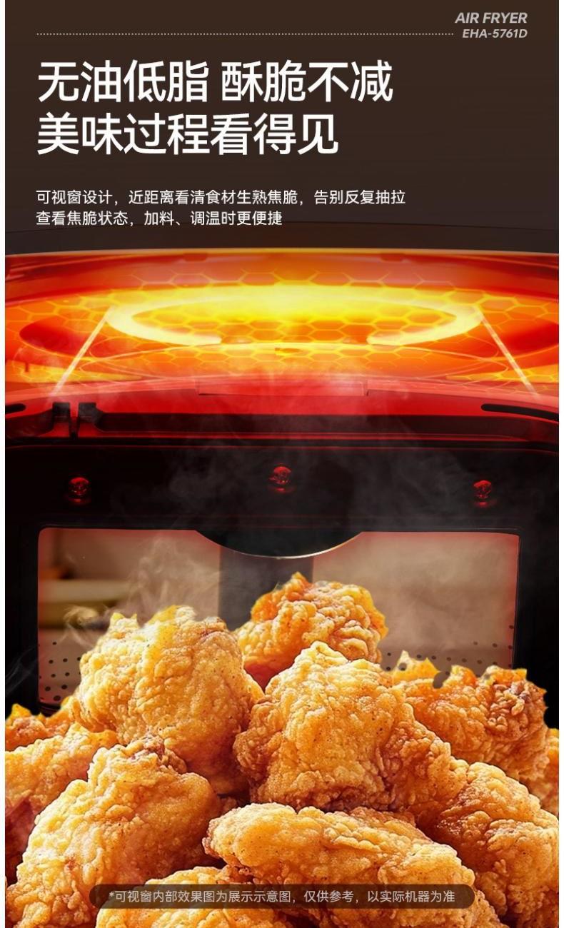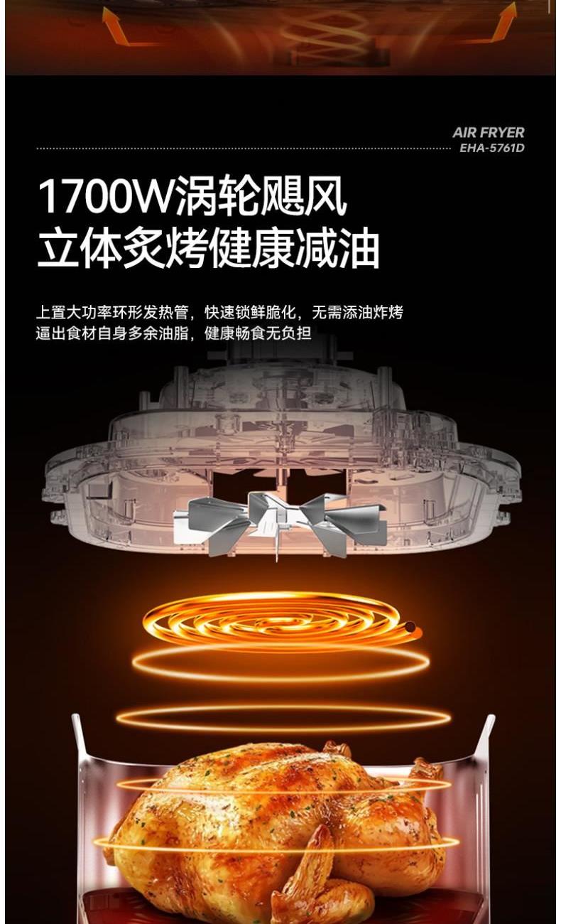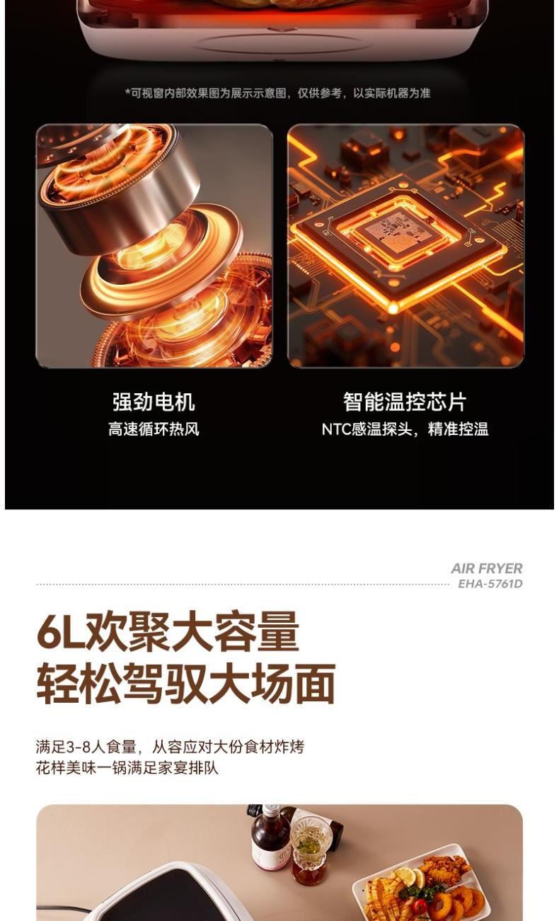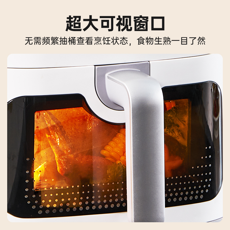 产品功率:1700W 产品容量:6L 材质:金属材质内胆(不粘涂层) 操作方式:触屏控制 产品净重:4.7kg 毛重:5.3kg 产品尺寸:322*280*295mm 包装尺寸:350*365*365mm 配置清单:主机,滤油架,博串架,炸篮,烤串签子 1、6L大容量:轻松满足4-6人用餐需求,一锅搞定全家美食,告别分批烹饪的等待 2、大屏视窗:大屏可视窗口,食材均匀上色、美味演变过程一目了然 3、8档菜单:鸡翅、排骨、大虾、整鸡、红薯、复热、薯条、面包 多功能轻松覆盖各类美食4、涡轮聚风烘烤:360°立体热风循环,大大提高烘烤速度,做到快而不柴,免翻面也能烤得鲜嫩多汁。5、清洗更方便:全金属内腔设计,油污不易粘附,一冲即净,打理省时省力