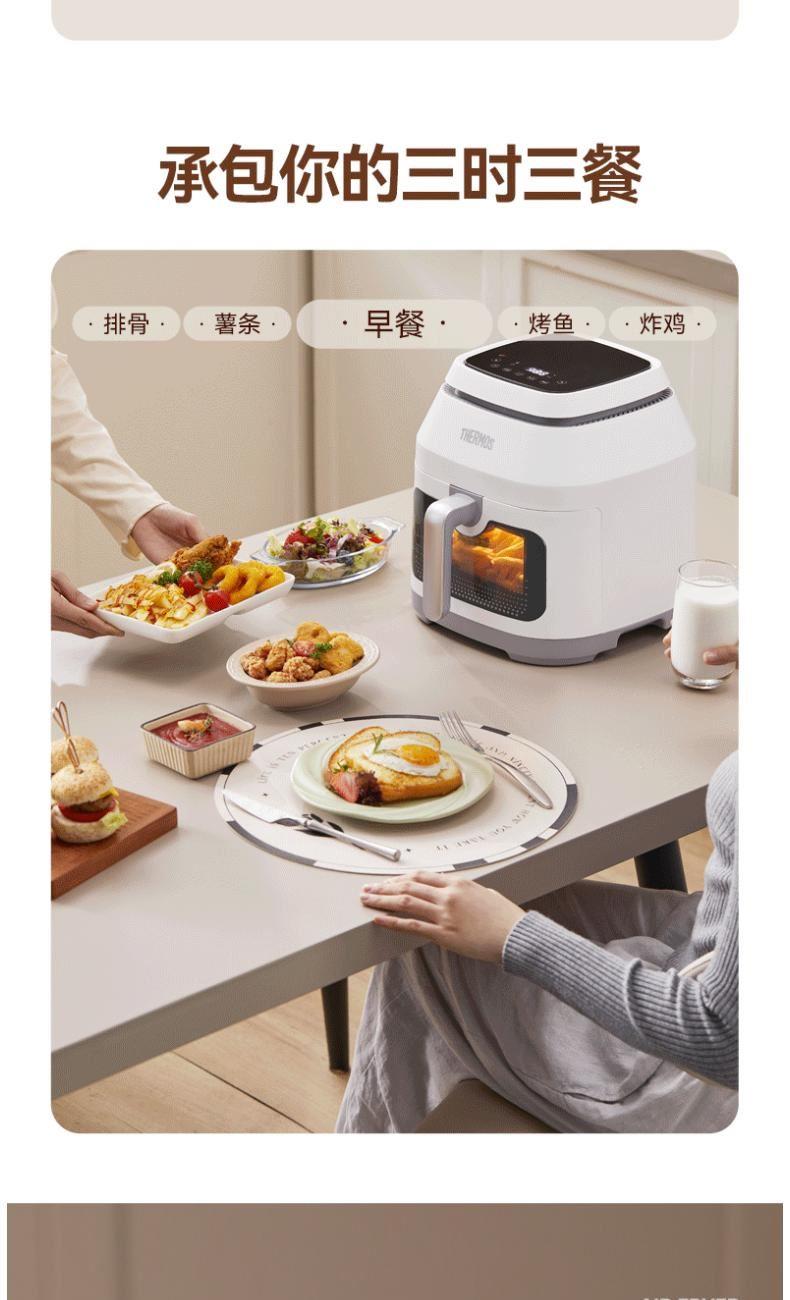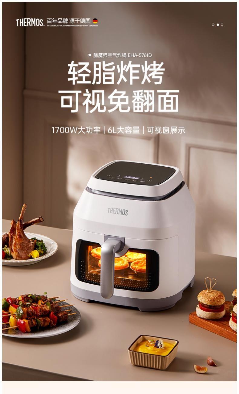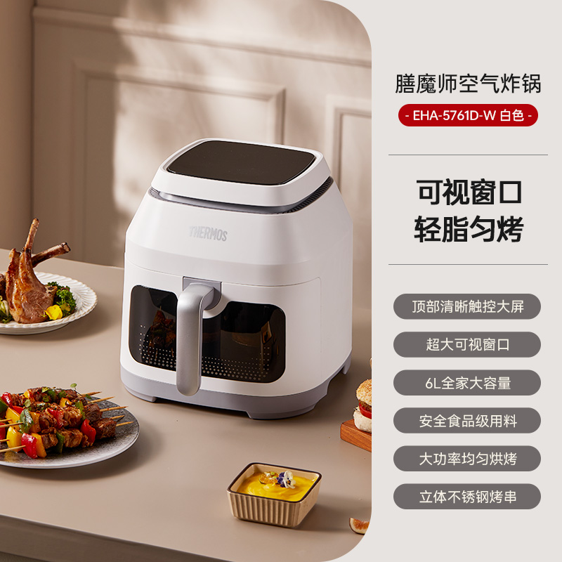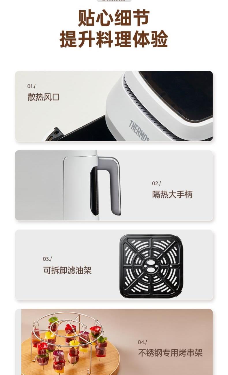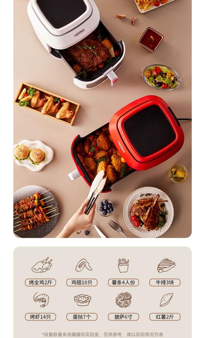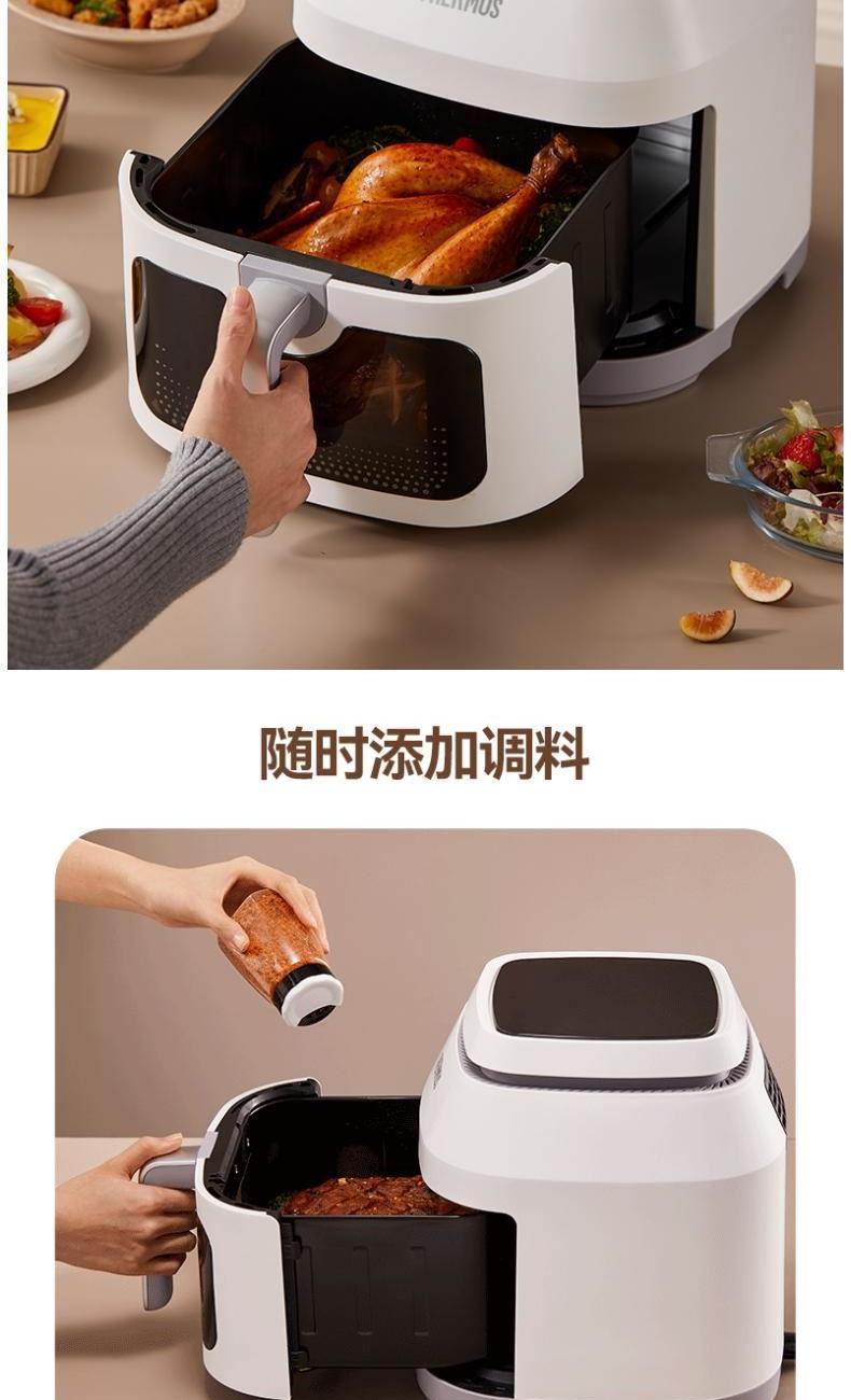 产品功率:1700W 产品容量:6L 材质:金属材质内胆(不粘涂层) 操作方式:触屏控制 产品净重:4.7kg 毛重:5.3kg 产品尺寸:322*280*295mm 包装尺寸:350*365*365mm 配置清单:主机,滤油架,博串架,炸篮,烤串签子 1、6L大容量:轻松满足4-6人用餐需求,一锅搞定全家美食,告别分批烹饪的等待 2、大屏视窗:大屏可视窗口,食材均匀上色、美味演变过程一目了然 3、8档菜单:鸡翅、排骨、大虾、整鸡、红薯、复热、薯条、面包 多功能轻松覆盖各类美食4、涡轮聚风烘烤:360°立体热风循环,大大提高烘烤速度,做到快而不柴,免翻面也能烤得鲜嫩多汁。5、清洗更方便:全金属内腔设计,油污不易粘附,一冲即净,打理省时省力