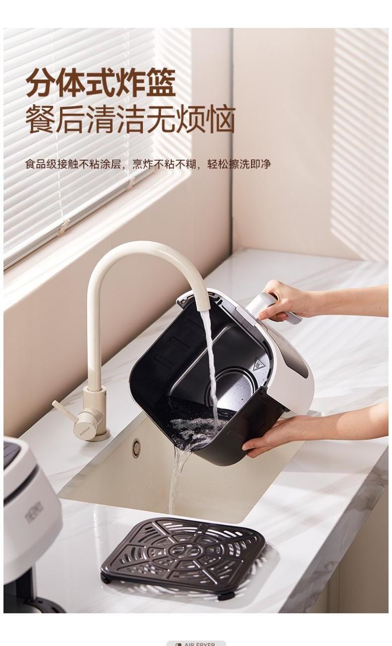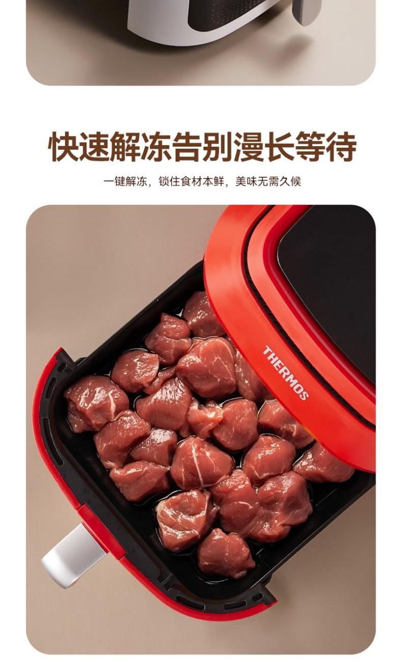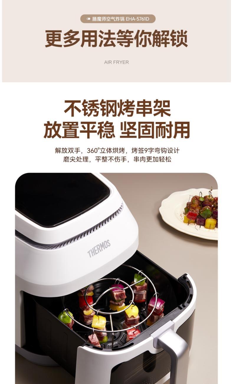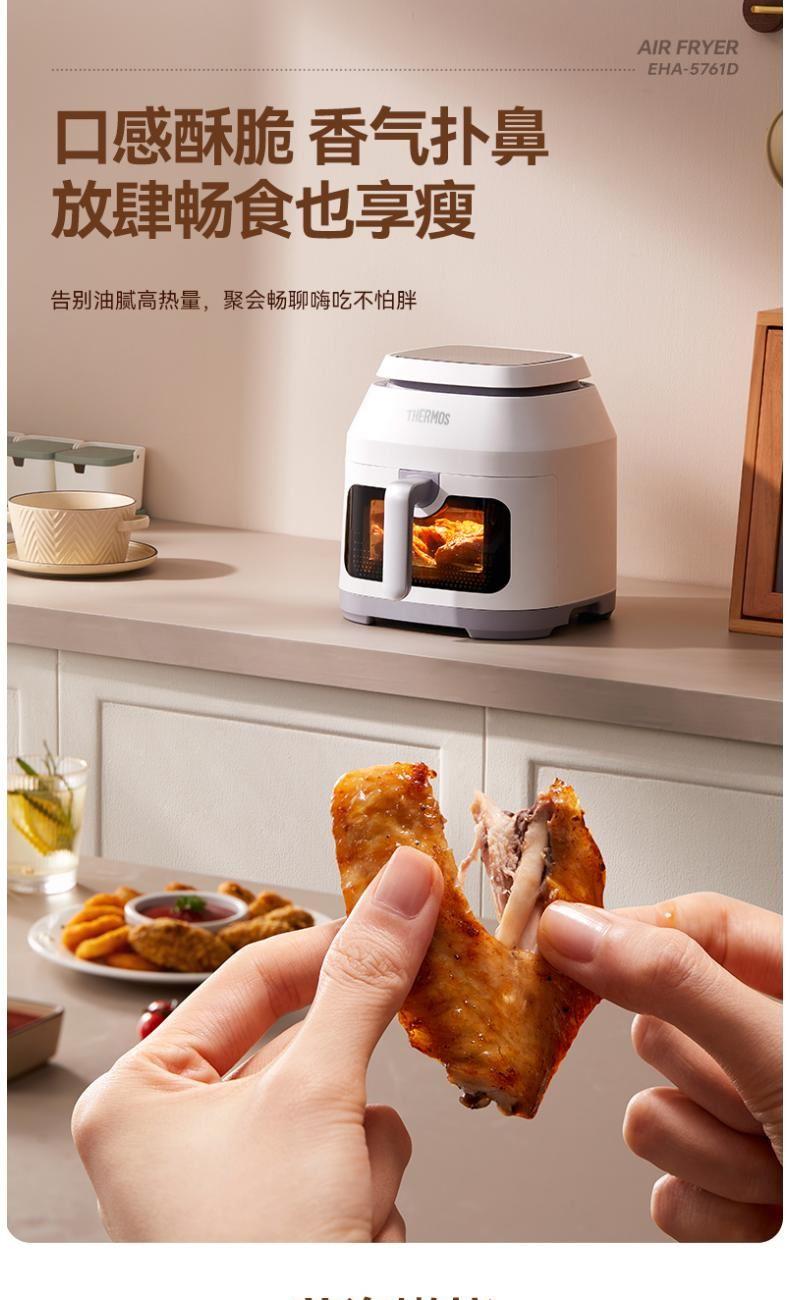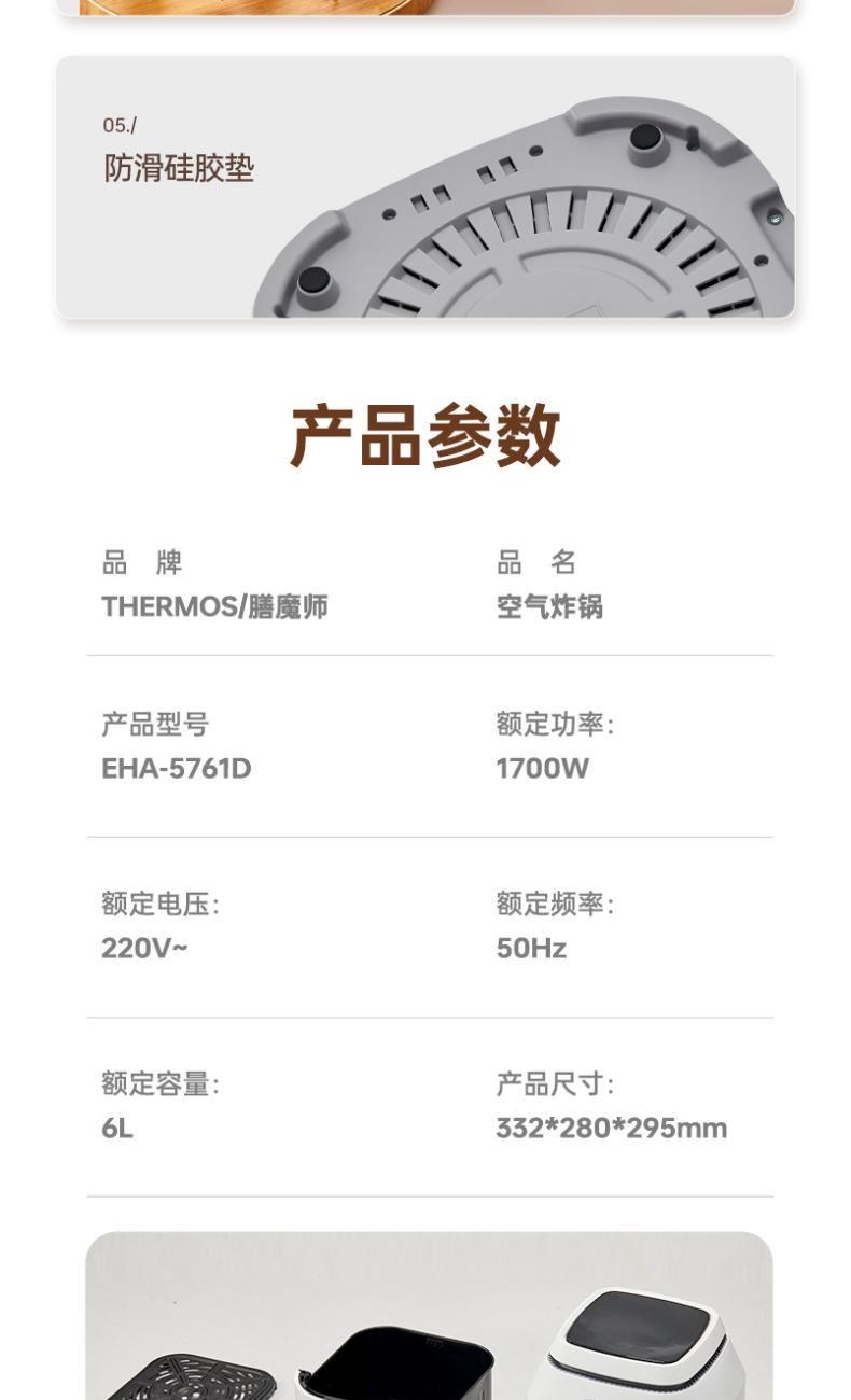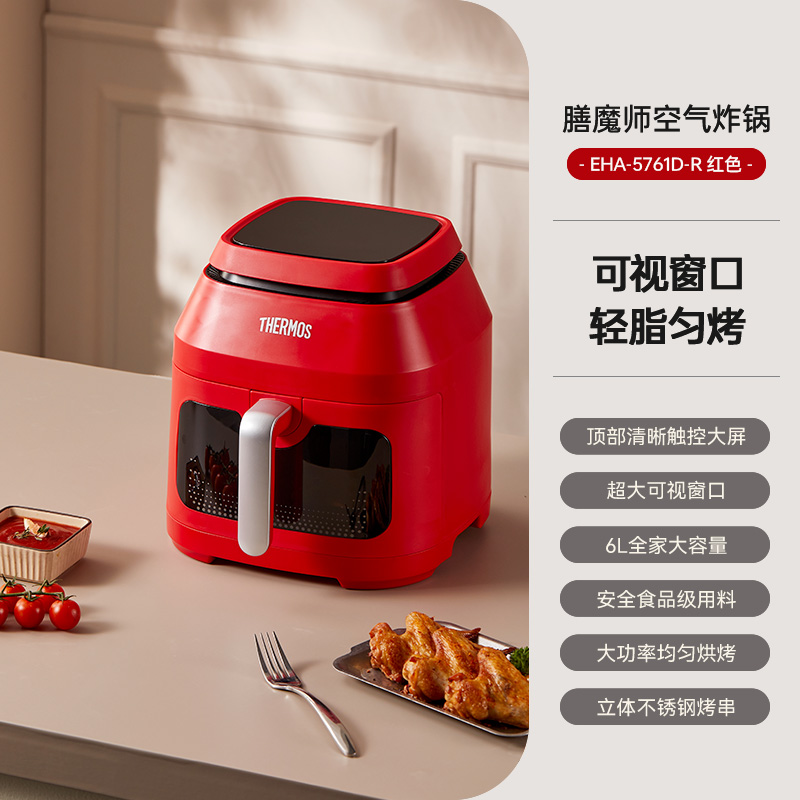 产品功率:1700W 产品容量:6L 材质:金属材质内胆(不粘涂层) 操作方式:触屏控制 产品净重:4.7kg 毛重:5.3kg 产品尺寸:322*280*295mm 包装尺寸:350*365*365mm 配置清单:主机,滤油架,博串架,炸篮,烤串签子 1、6L大容量:轻松满足4-6人用餐需求,一锅搞定全家美食,告别分批烹饪的等待 2、大屏视窗:大屏可视窗口,食材均匀上色、美味演变过程一目了然 3、8档菜单:鸡翅、排骨、大虾、整鸡、红薯、复热、薯条、面包 多功能轻松覆盖各类美食4、涡轮聚风烘烤:360°立体热风循环,大大提高烘烤速度,做到快而不柴,免翻面也能烤得鲜嫩多汁。5、清洗更方便:全金属内腔设计,油污不易粘附,一冲即净,打理省时省力