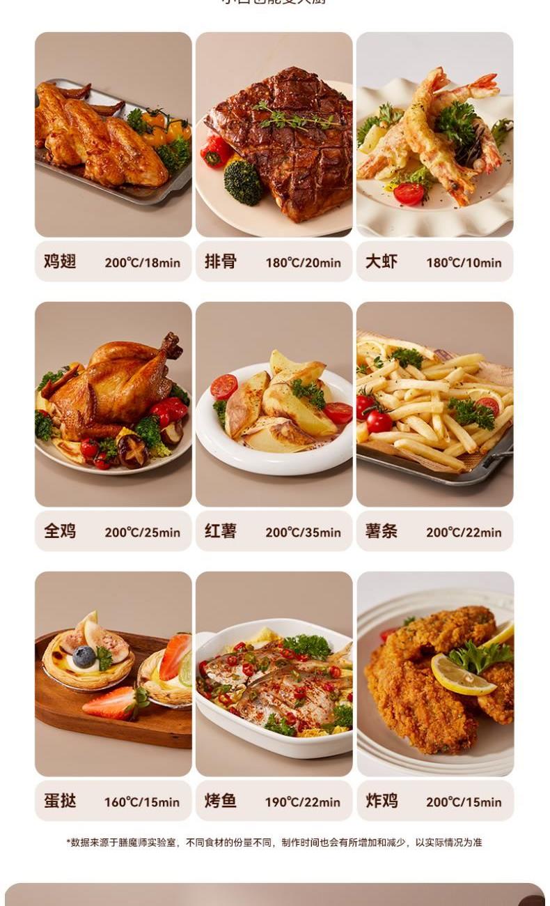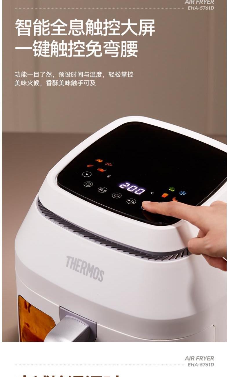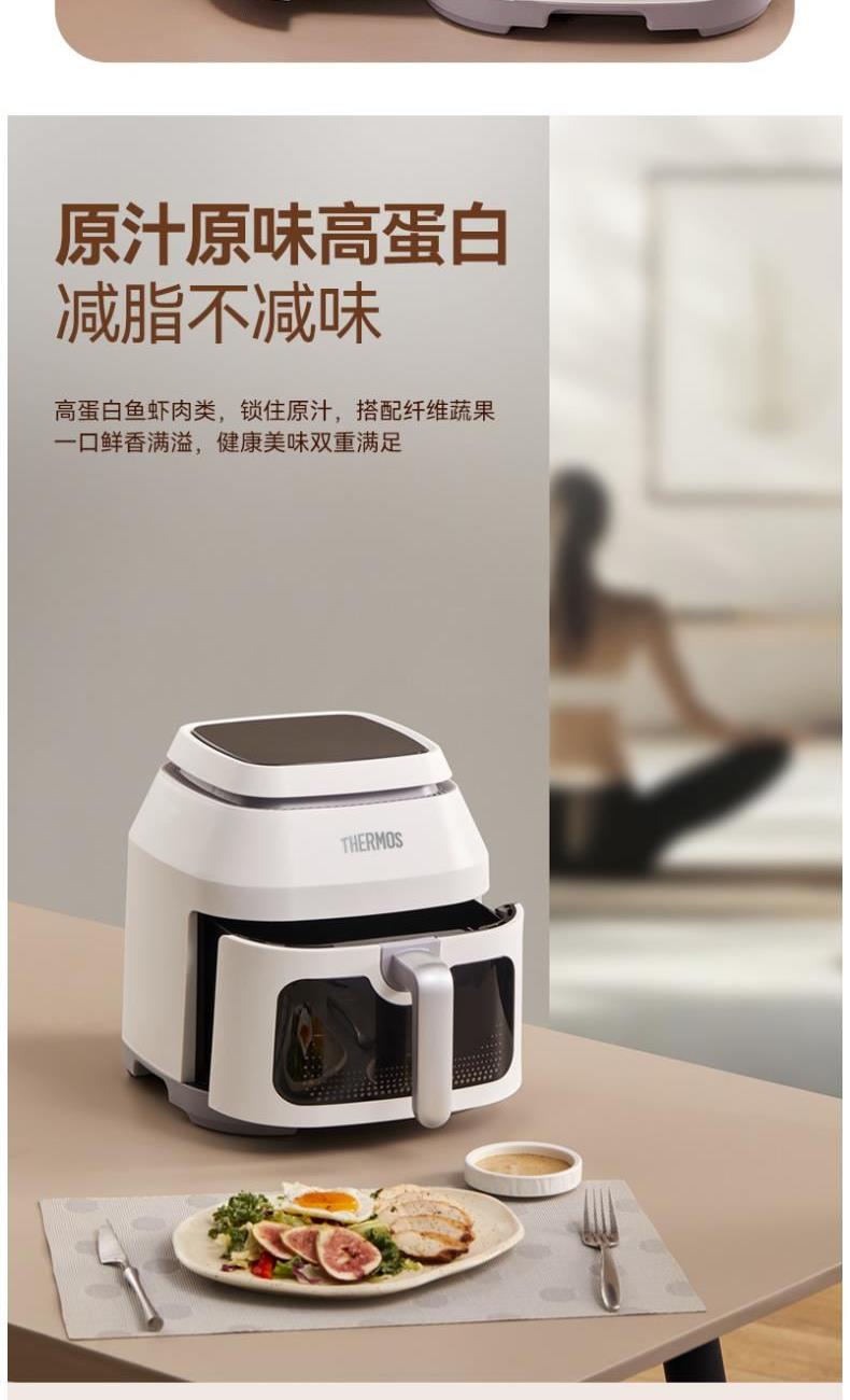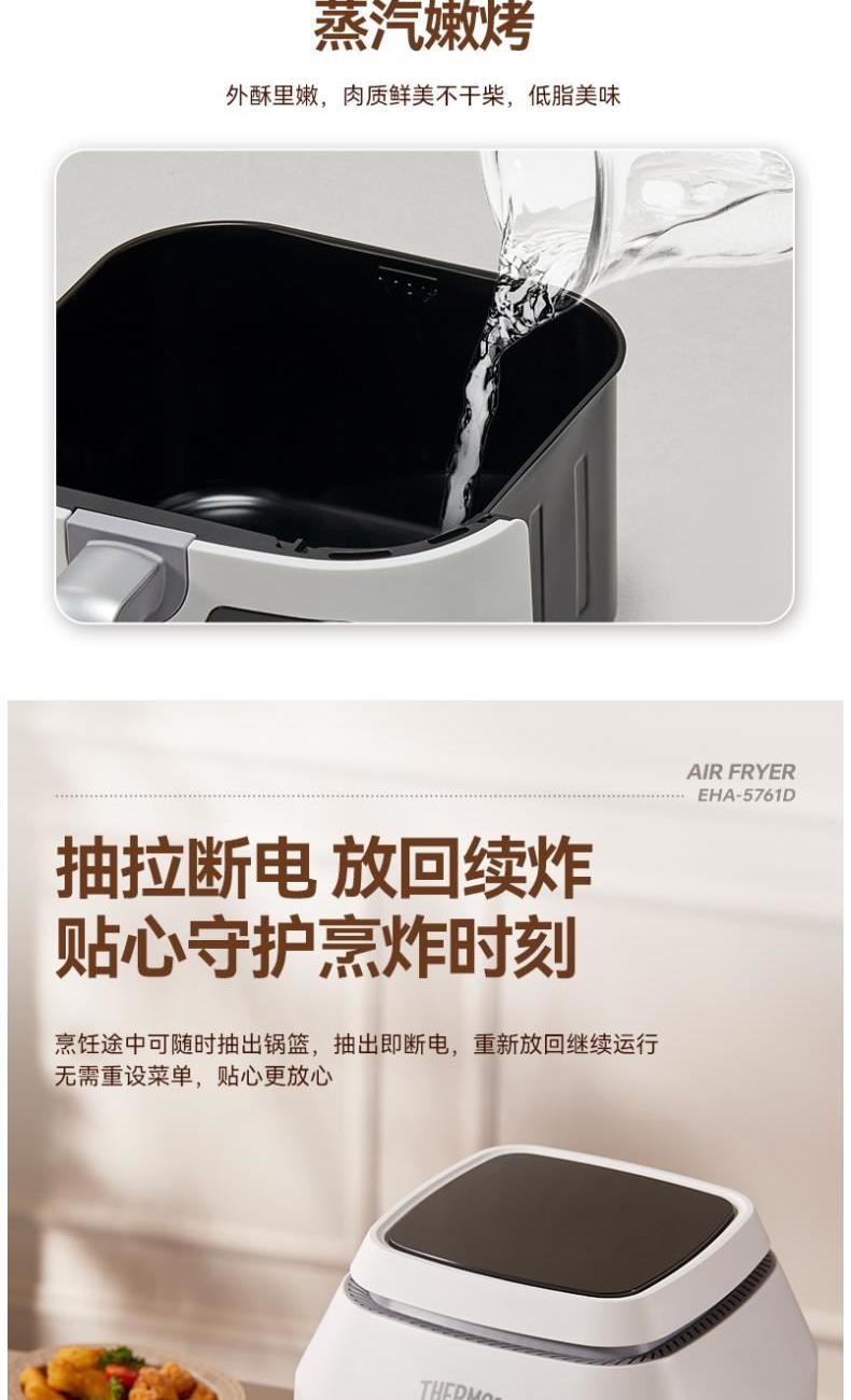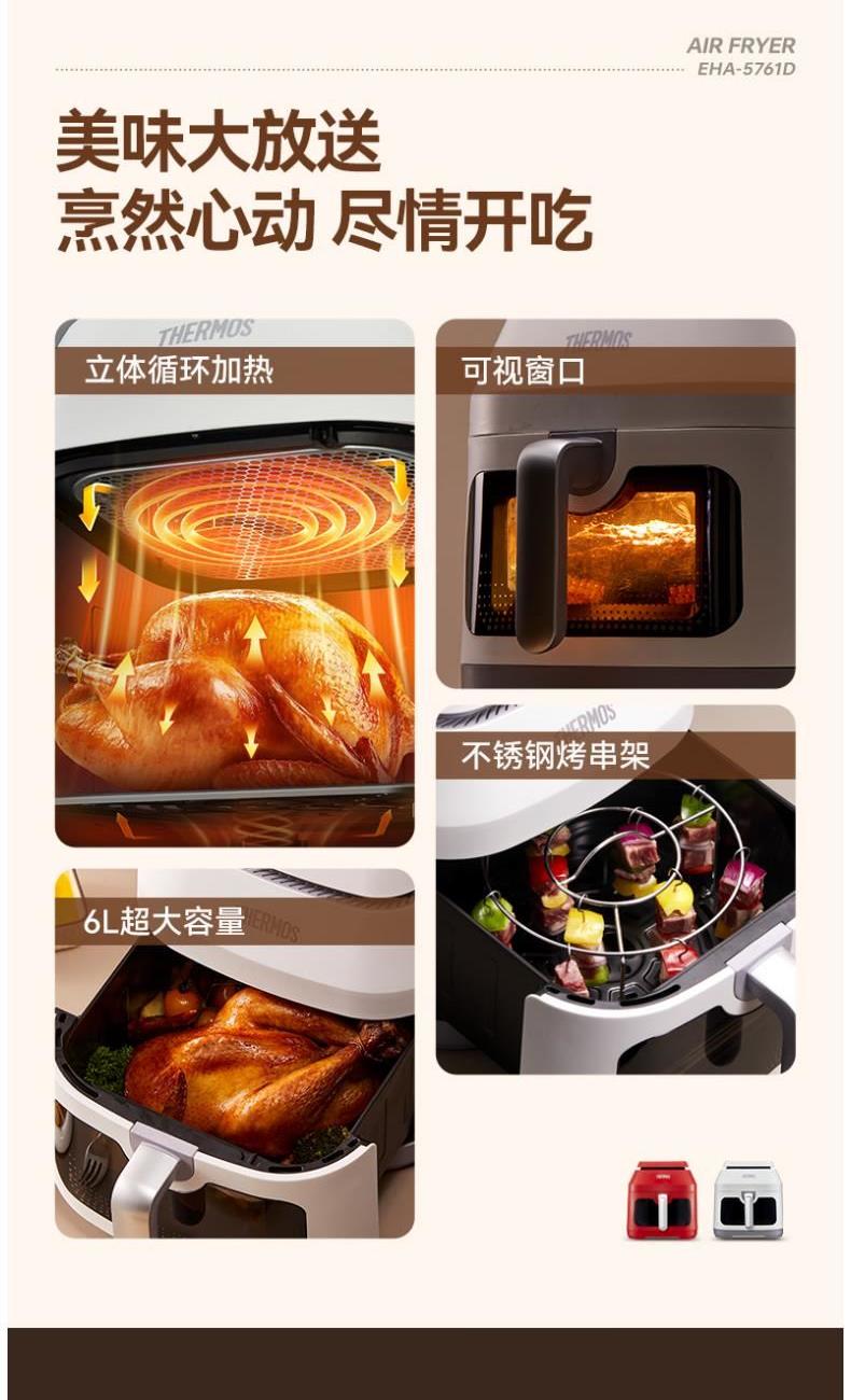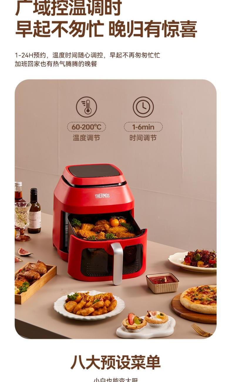 产品功率:1700W 产品容量:6L 材质:金属材质内胆(不粘涂层) 操作方式:触屏控制 产品净重:4.7kg 毛重:5.3kg 产品尺寸:322*280*295mm 包装尺寸:350*365*365mm 配置清单:主机,滤油架,博串架,炸篮,烤串签子 1、6L大容量:轻松满足4-6人用餐需求,一锅搞定全家美食,告别分批烹饪的等待 2、大屏视窗:大屏可视窗口,食材均匀上色、美味演变过程一目了然 3、8档菜单:鸡翅、排骨、大虾、整鸡、红薯、复热、薯条、面包 多功能轻松覆盖各类美食4、涡轮聚风烘烤:360°立体热风循环,大大提高烘烤速度,做到快而不柴,免翻面也能烤得鲜嫩多汁。5、清洗更方便:全金属内腔设计,油污不易粘附,一冲即净,打理省时省力