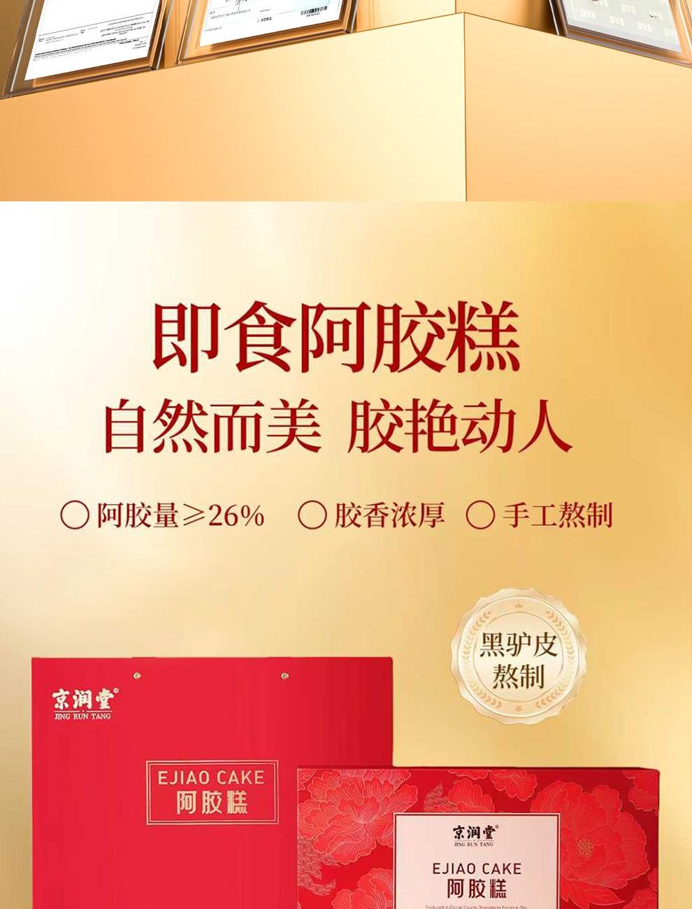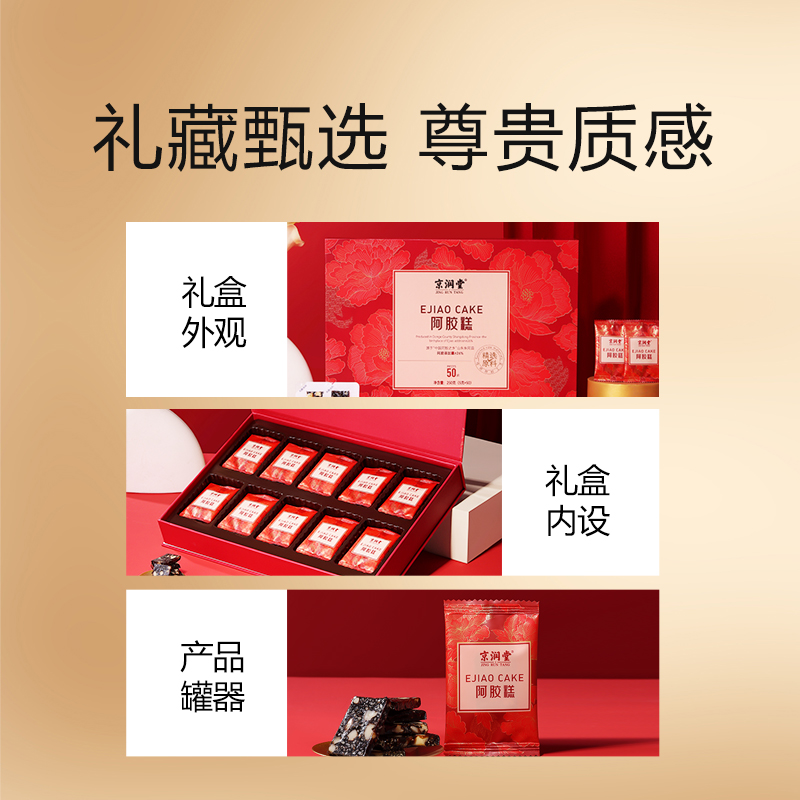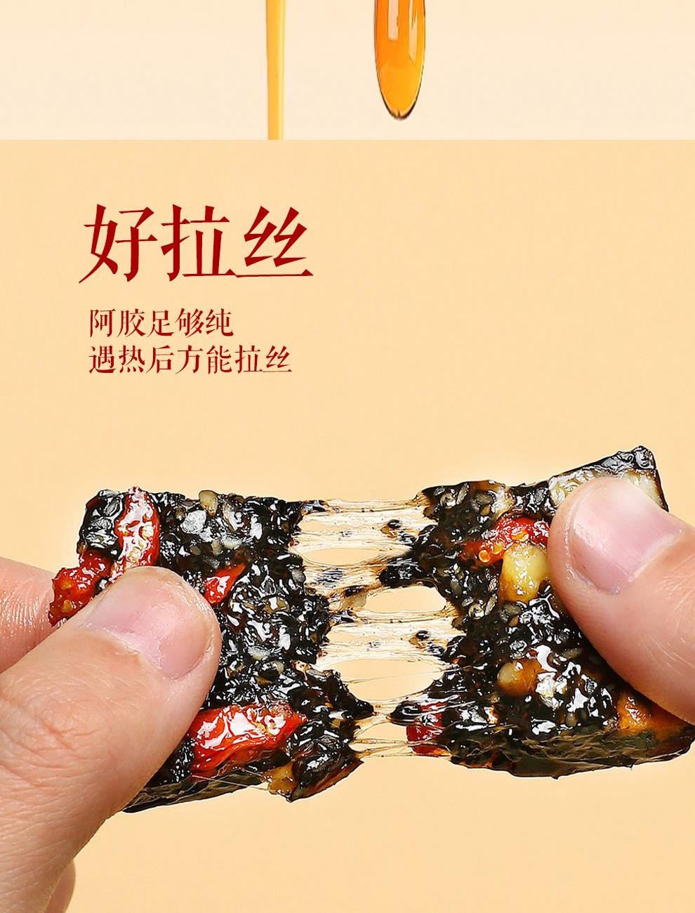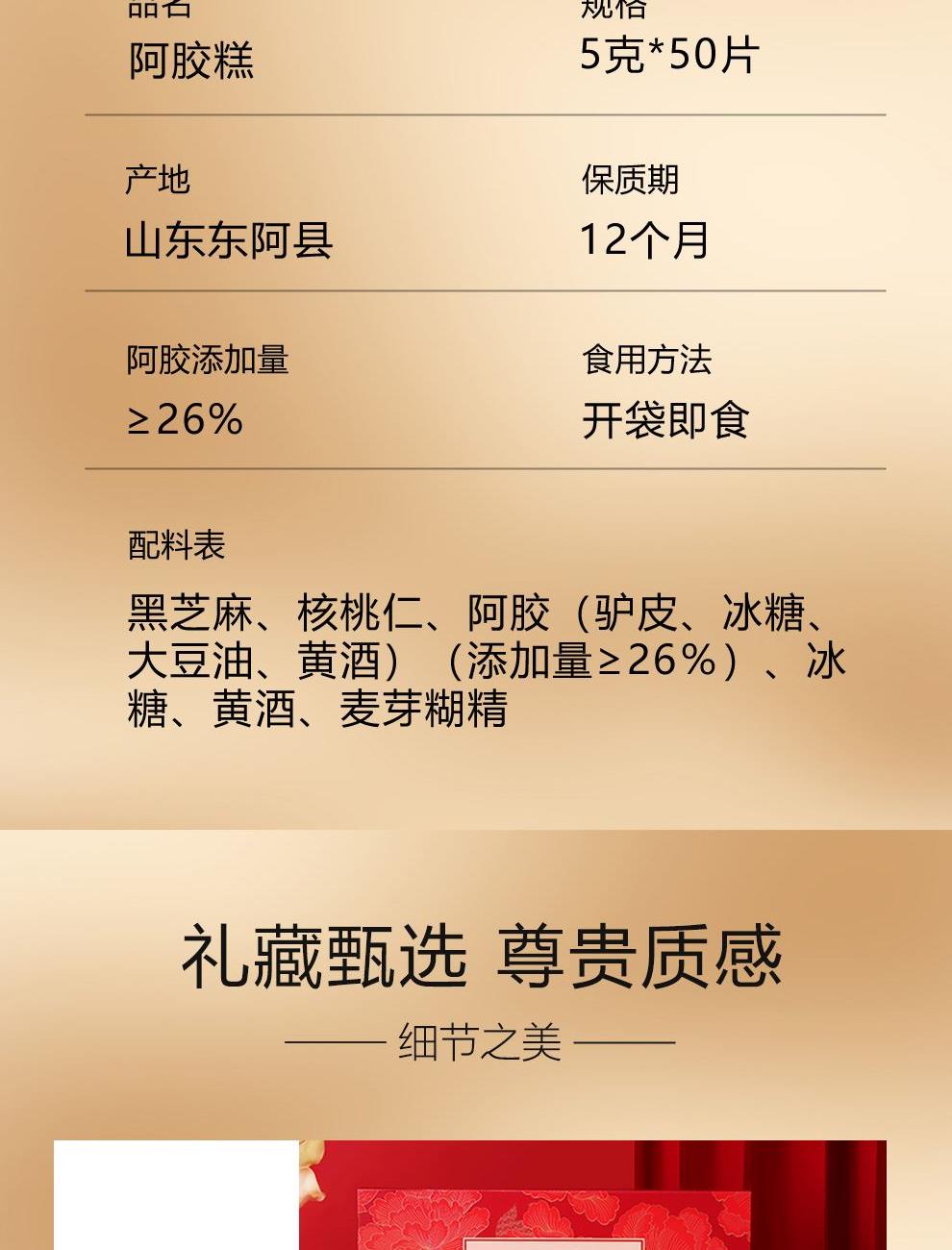规格:250克(5克*50片)、阿胶添加量≥26% 卖点: 阿胶糕的核心在于阿胶,而优质的阿胶源自道地原料与传统工艺。我们严选山东东阿的上等驴皮,这里的驴皮质地厚实、营养丰富,为阿胶的高品质奠定了坚实基础。东阿独特的地理环境与水质,使得熬制出的阿胶纯度高、杂质少、药效佳,富含多种对人体有益的氨基酸和微量元素,如赖氨酸、精氨酸、组氨酸以及铁、锌、钙等。这些营养成分在补血、滋阴、润燥等方面功效显著,是其他产地阿胶难以比拟的。
