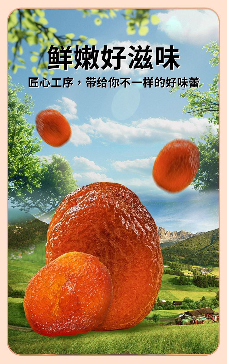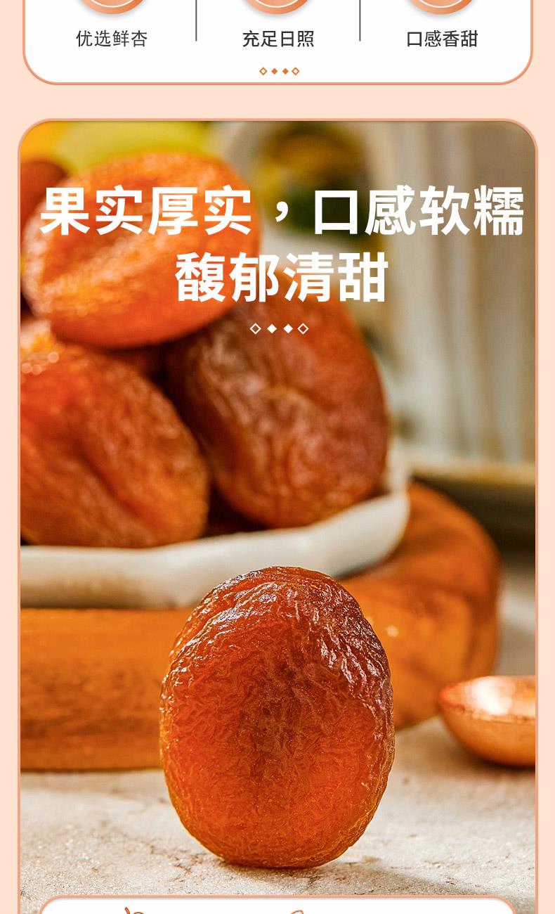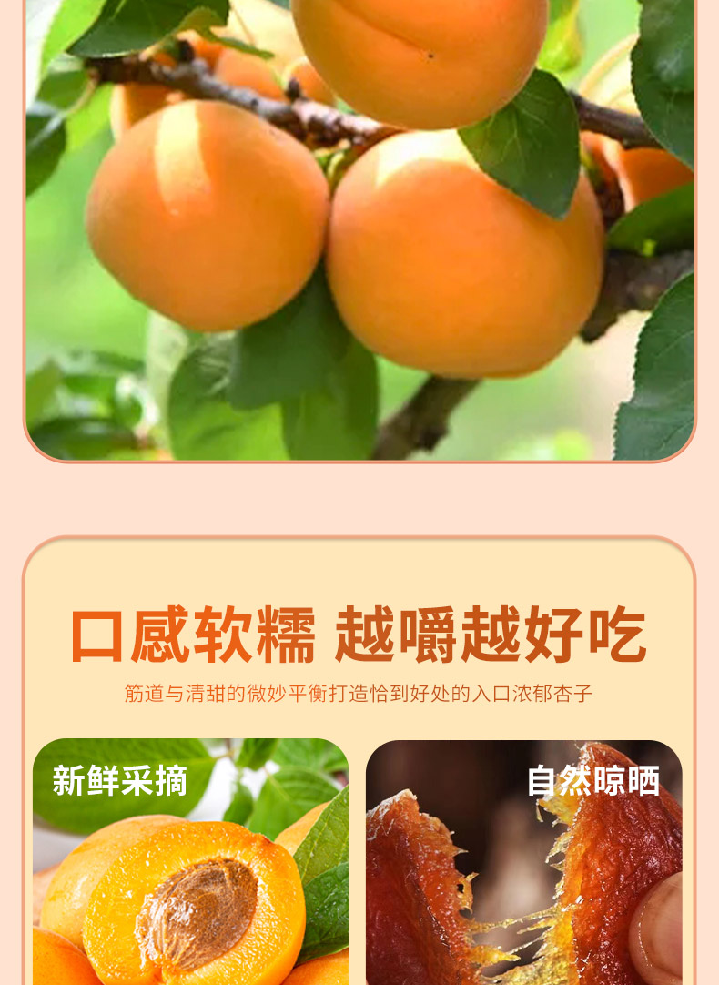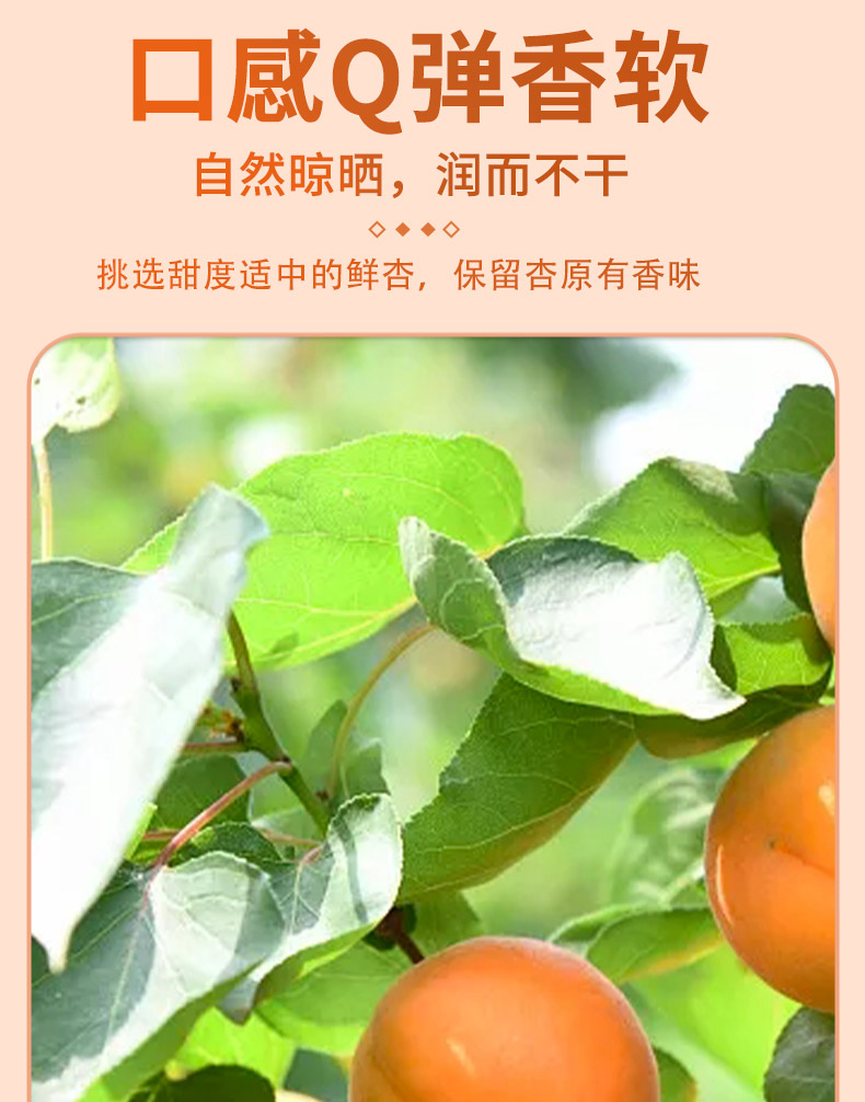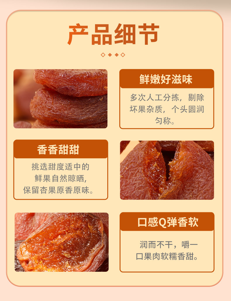 1:精选鲜杏,自然晾晒; 2:果肉厚实,口感软糯; 3:浓郁杏香,馥郁清甜。