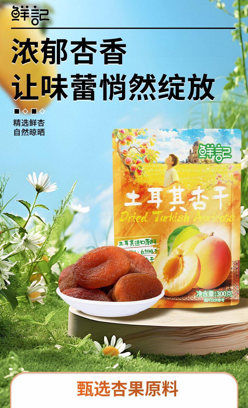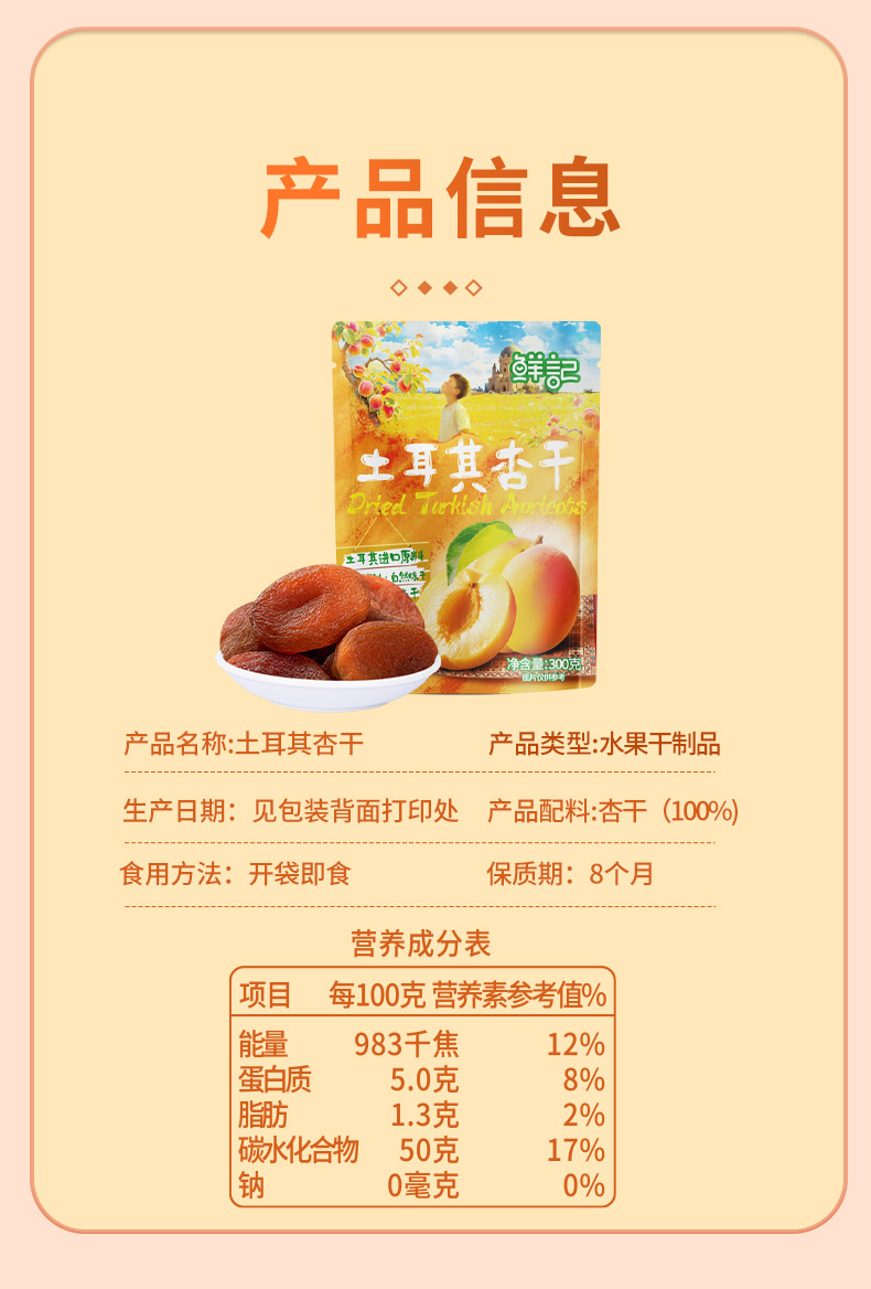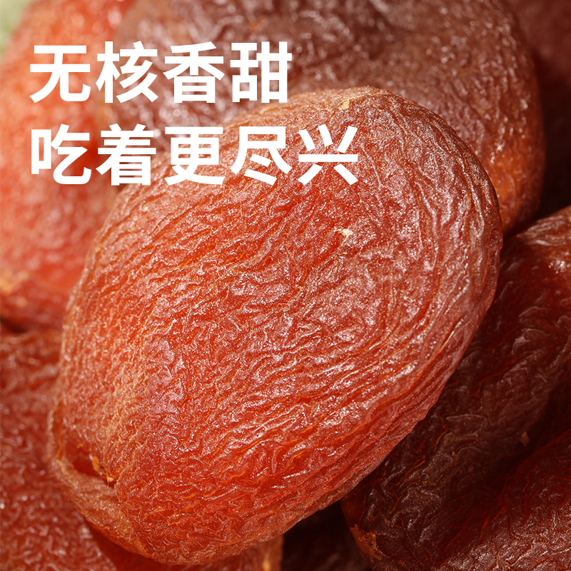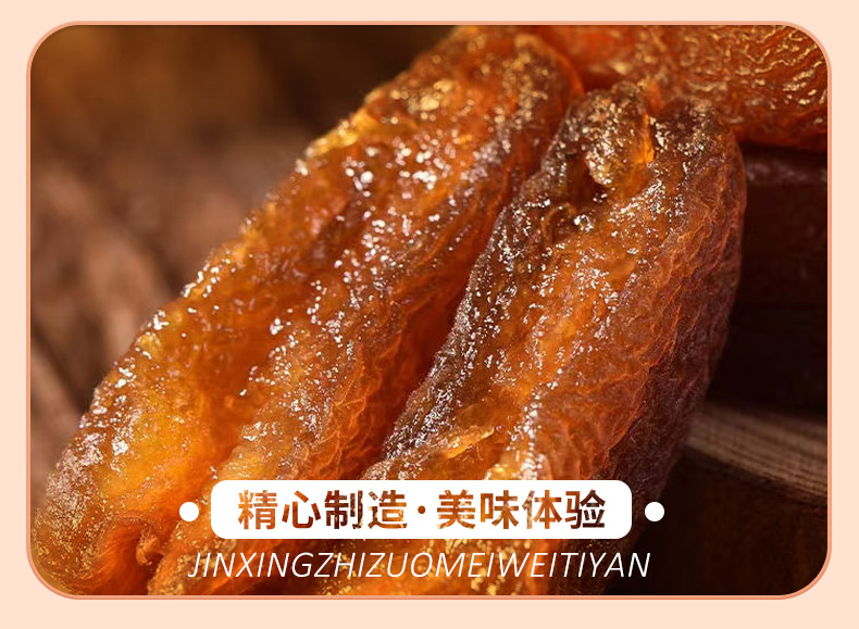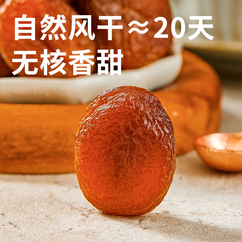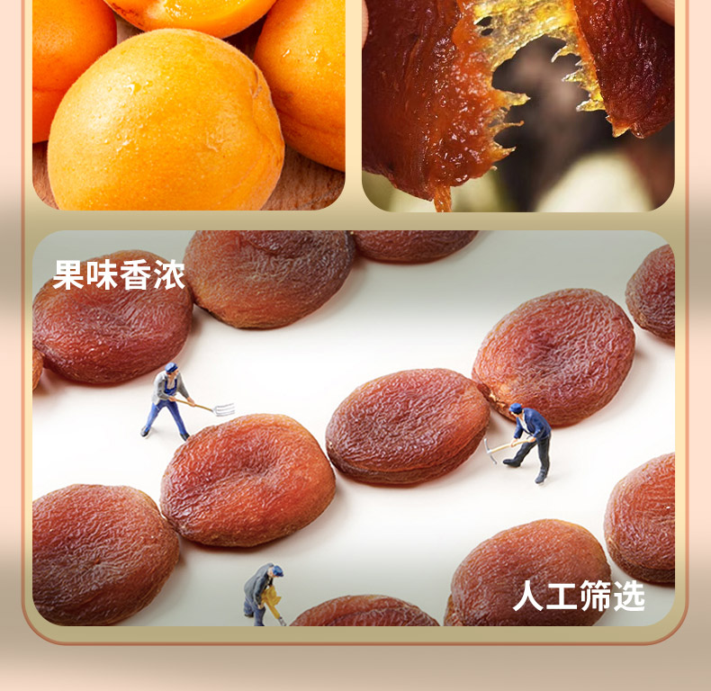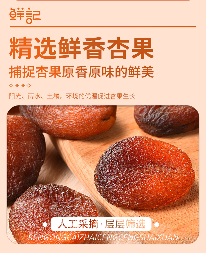 1:精选鲜杏,自然晾晒; 2:果肉厚实,口感软糯; 3:浓郁杏香,馥郁清甜。