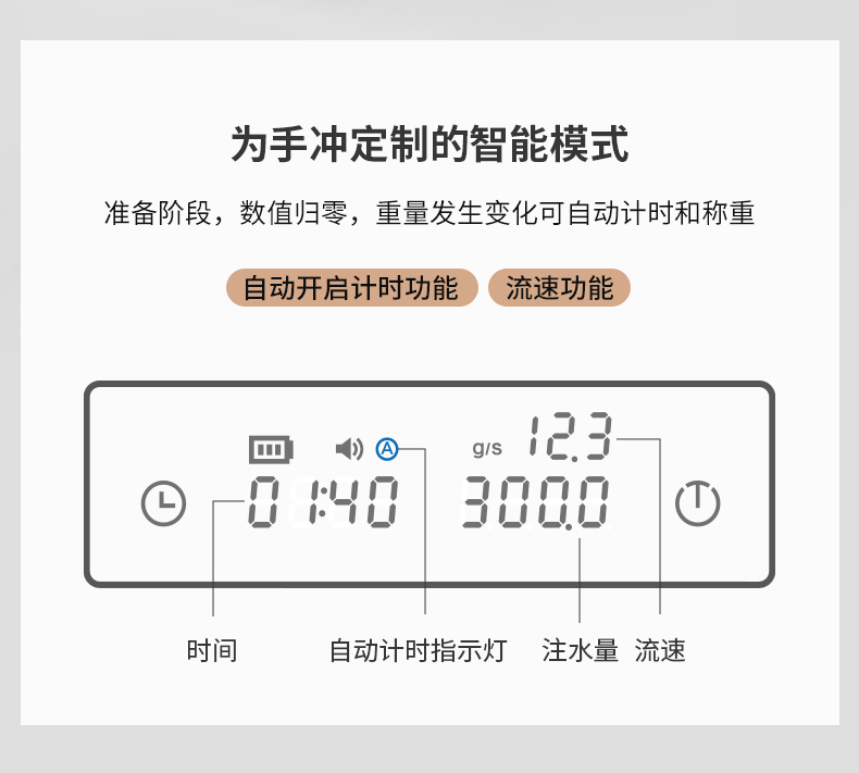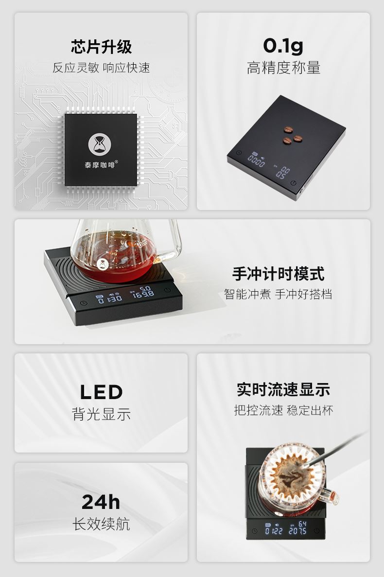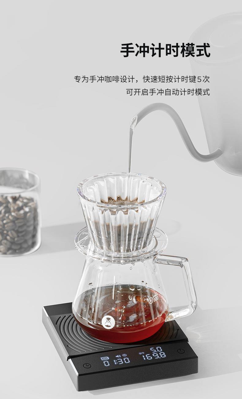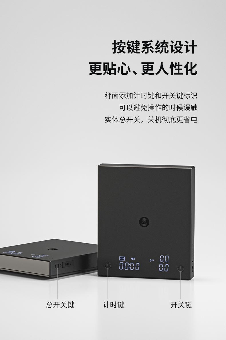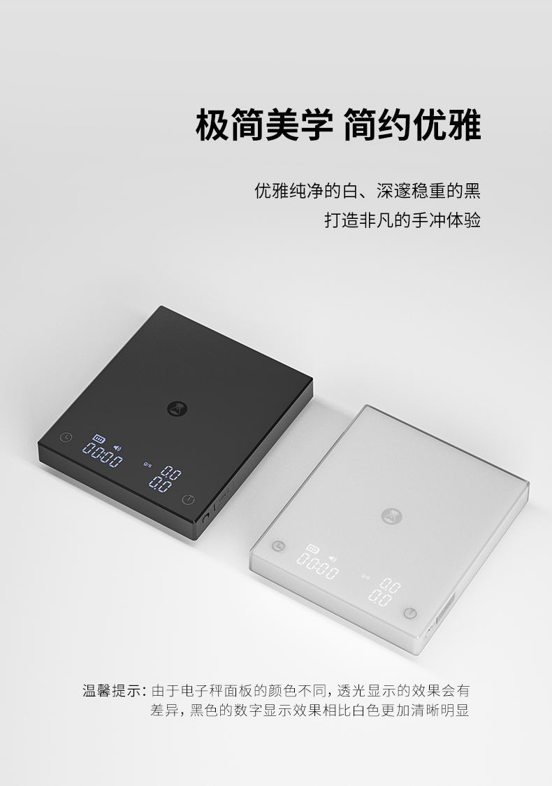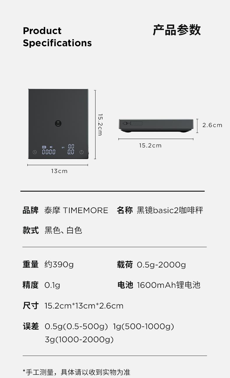 黑镜BASIC2+电子秤 重量:380g 载荷:2kg以内 电池:1600mAh 精度:0.1g(开机后起称之大于0.5g激活设备) 配件:滴水盘 Type-C充电线 说明书 保修卡 合格证 颜色:黑色 特点:冲煮自动计时;LED隐屏,简约轻奢 传感,快速称重 内置高度压力传感器 使秤的精度达到0.1克