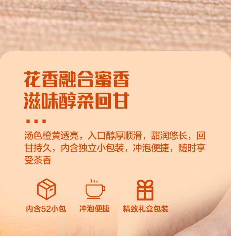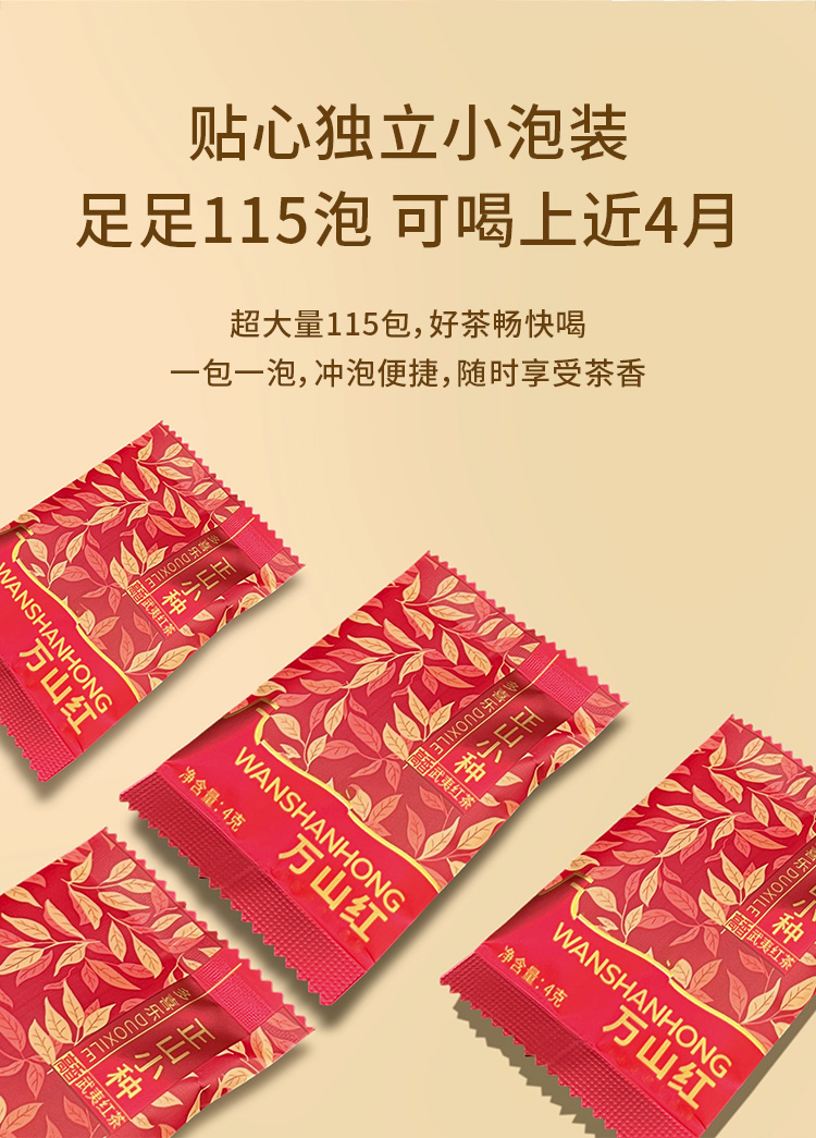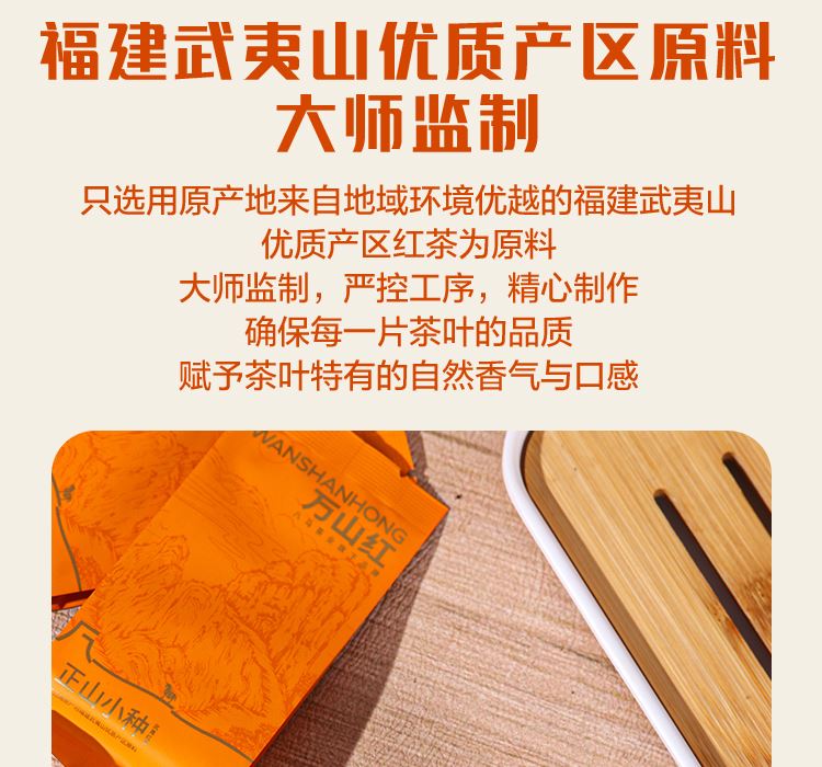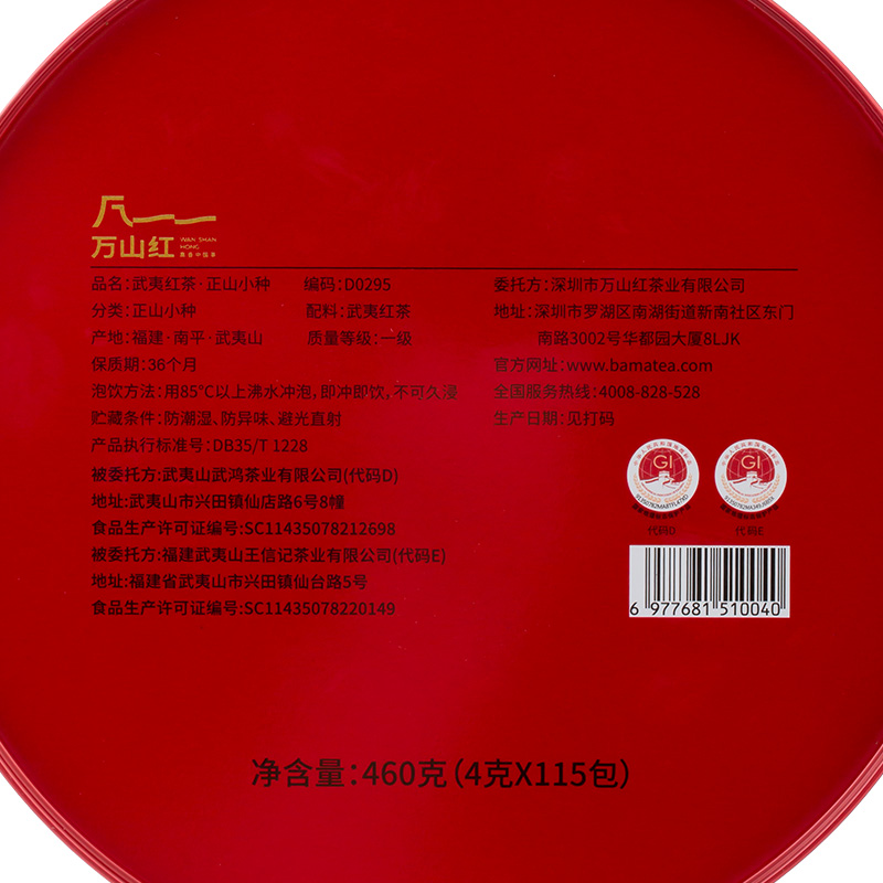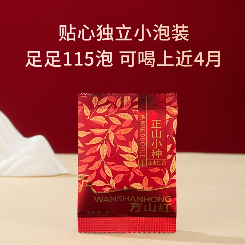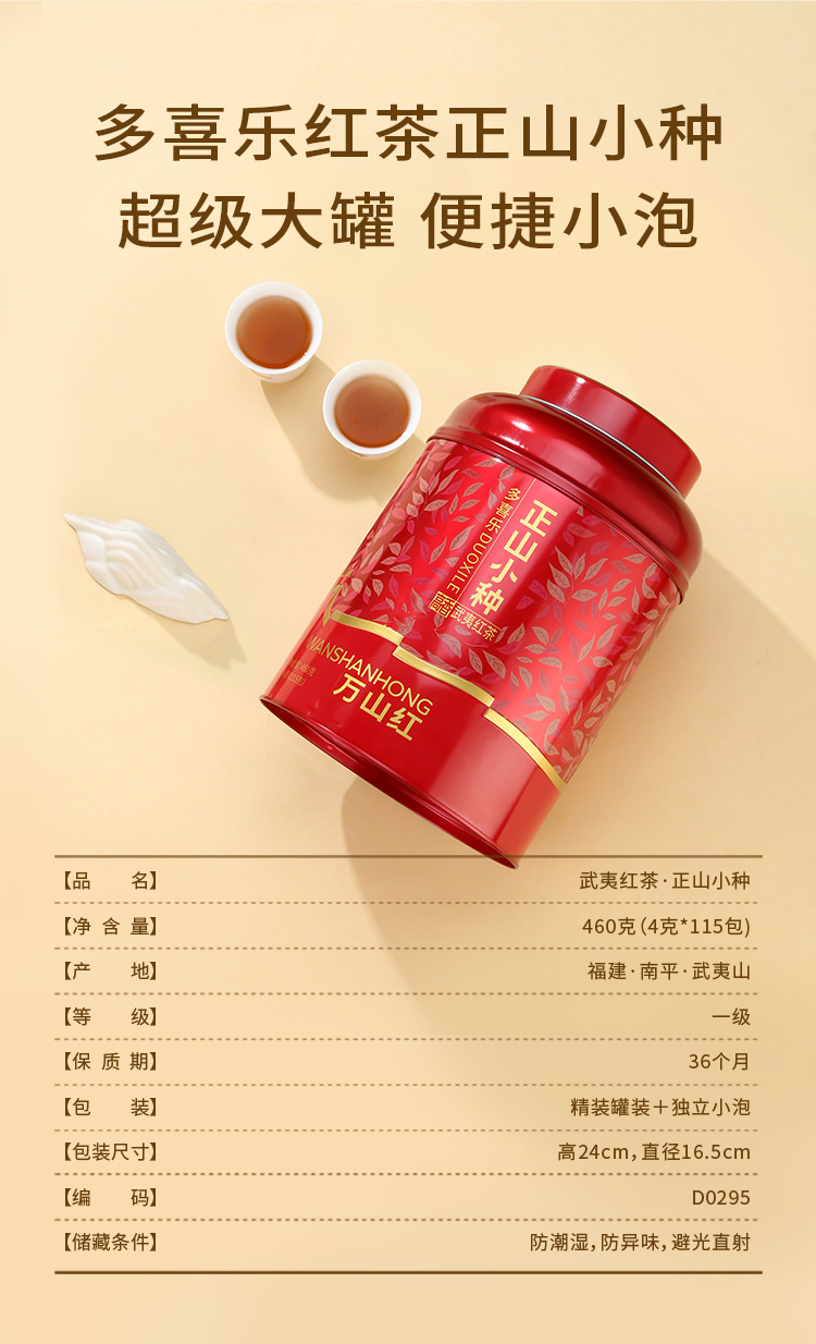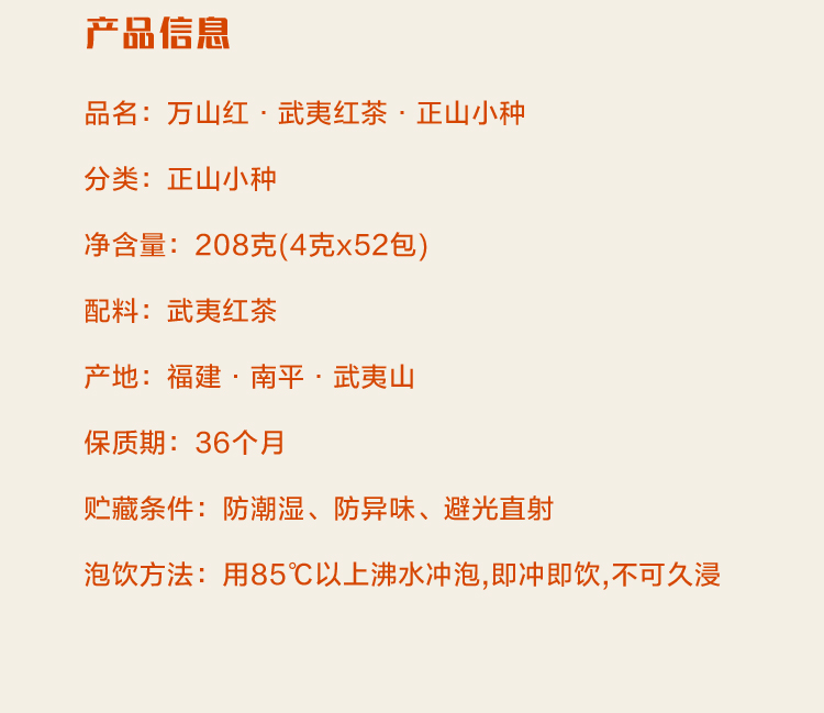 净含量:208克(4g*52包) 条形码:6977681511153 保质期:36个月 原料产地:福建·南平·武夷山 贮藏条件:防潮湿、防异味、避光直射、冷藏为宜 净含量:正山小种单罐460克