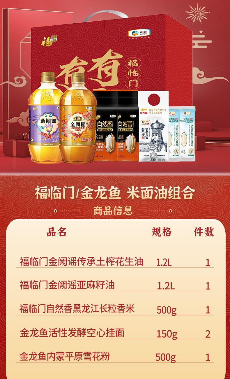 净含量:1800g+2400ml 配置组合: 福临门金阙谣土榨花生油1.2L*1瓶 福临门金阙谣亚麻籽油1.2L*1瓶 福临门自然香黑龙江长粒香米500g*1袋 福临门自然香黑龙江长粒香米500g*1袋 金龙鱼活性发酵空心挂面150g*2袋 金龙鱼内蒙平原雪花粉500g*1袋 福临门有礼有节包装盒*1个 (尺寸320mm*110mm*240mm) 推荐理由: 黄金产区原料 + 匠心工艺,口感营养兼具精选东北寒地黑土大米、黄金玉米带 / 沂蒙山区原料,采用物理压榨、黄金碾磨等工艺,保留食材原生营养与本味;兼顾健康与美味。内含大米、食用油、调味品等家庭日常必备品,拒绝闲置浪费;简约大气礼盒包装,适配企业福利、商务馈赠等场景,性价比高 + 实用性强,员工满意、采购省心。