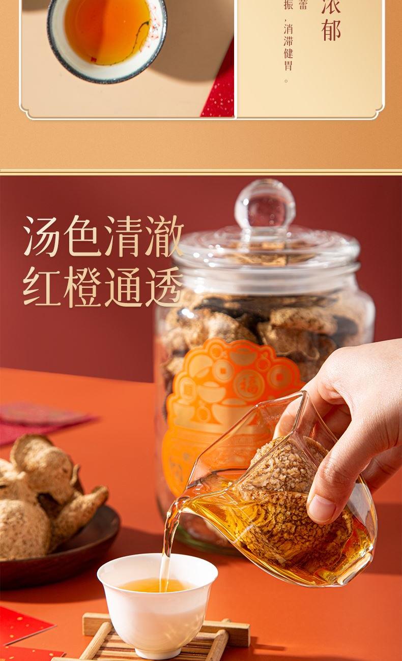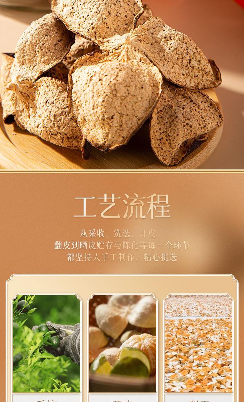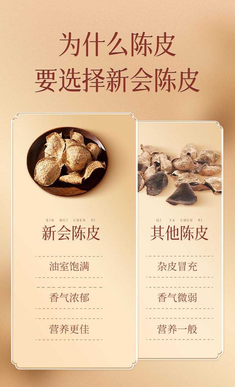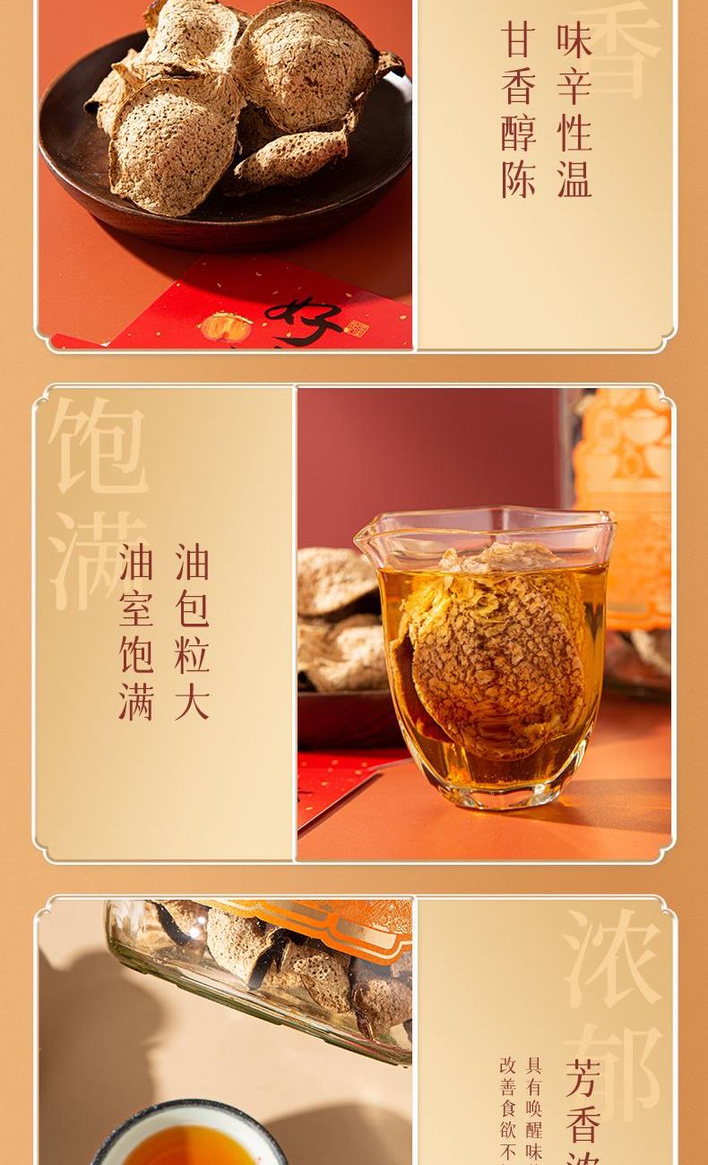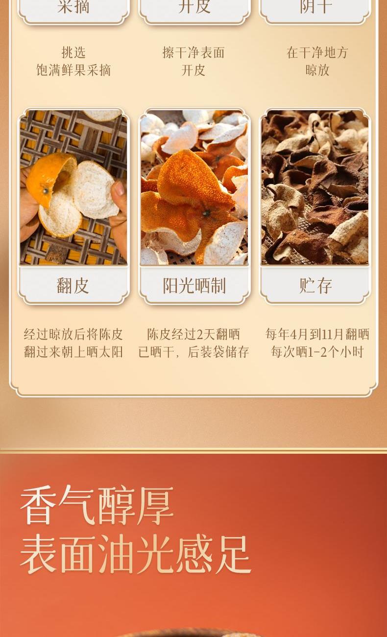 净含量:150g 毛重:2.9kg 产区:广东新会南坦核心产区 原料:新会干仓陈皮 规格:单瓶 1.选用广东新会南坦产区15年陈皮原料,香气醇厚,表面油光感足 2.从采收,洗选,开皮,翻皮到晒皮贮存与陈化等每一个环节都坚持人手工制作,精心挑选。 3.新会陈皮味辛性温,甘香醇陈,油包粒大,油室饱满,芳香浓郁,具有唤醒味蕾,改善食欲不振,消滞健胃。 4.新会陈皮不仅能单独泡茶,还可以用来与其他茶叶搭配冲泡,白茶,红茶,普洱等。