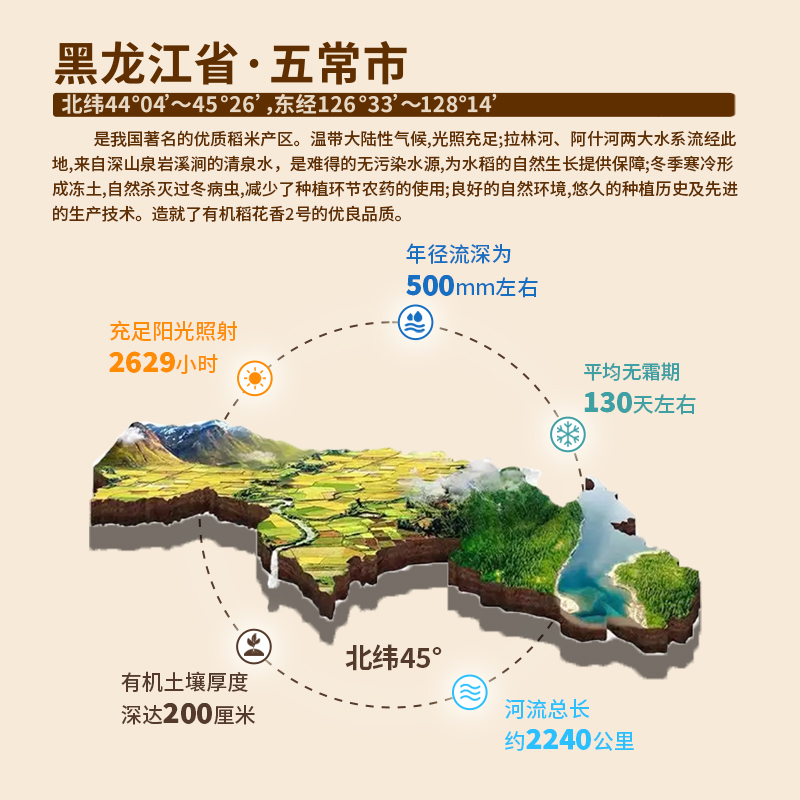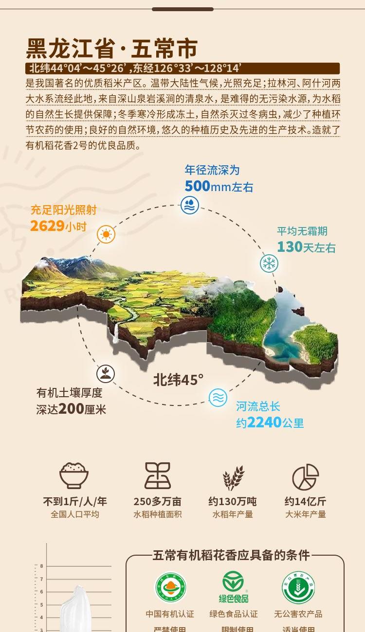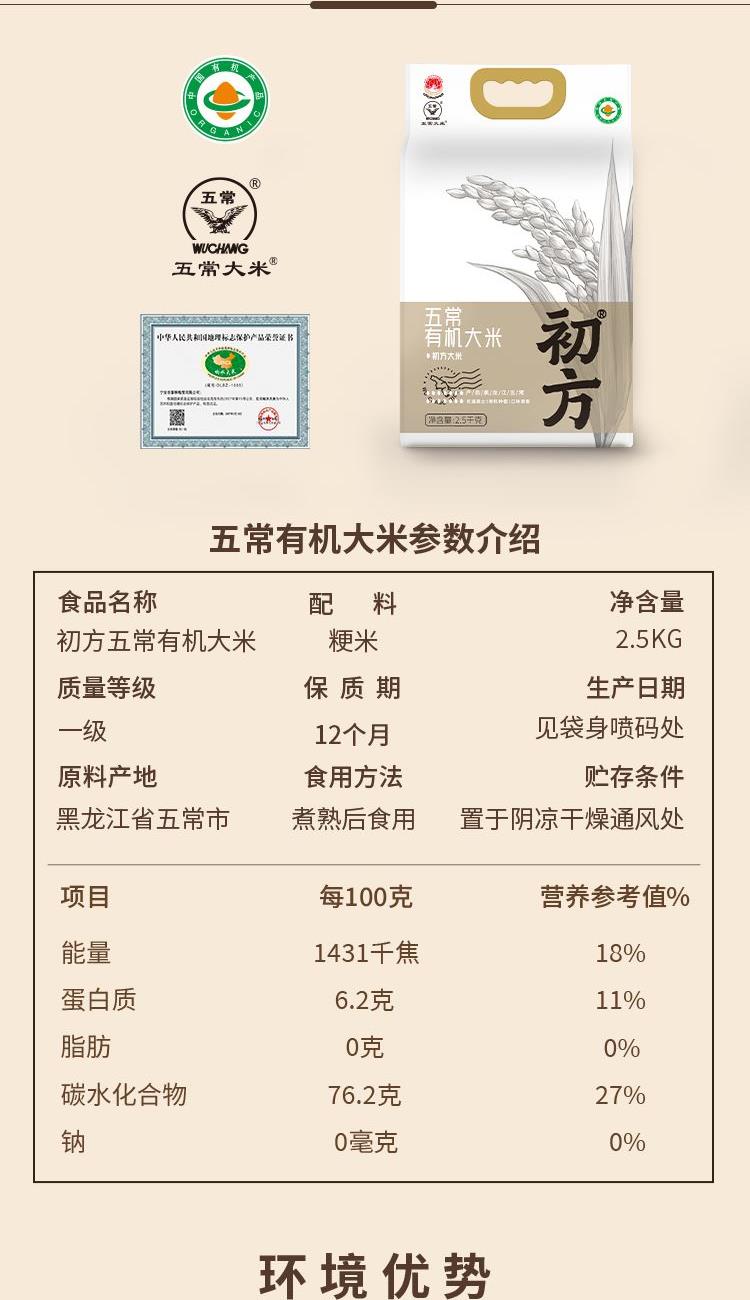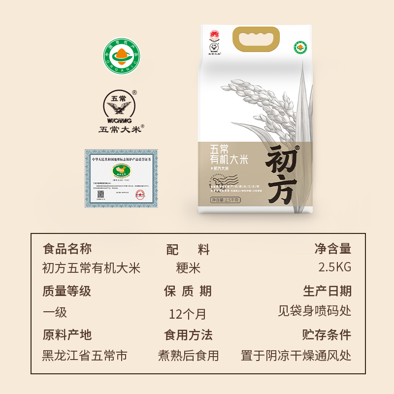 ①产地:五常 ②包装规格:2.5kg六面 ③保质期:12个月 ④贮存条件:常温保存 ⑤产品指标:蛋白质6.2g/100g; ⑥产品卖点: 通过有机认证和五常原产地认证; 产自五常核心产区的有机黑土地,土地肥沃,自然活水灌溉,水源充足; 色泽清白透明,颗粒饱满,饭粒油亮,香味浓郁
