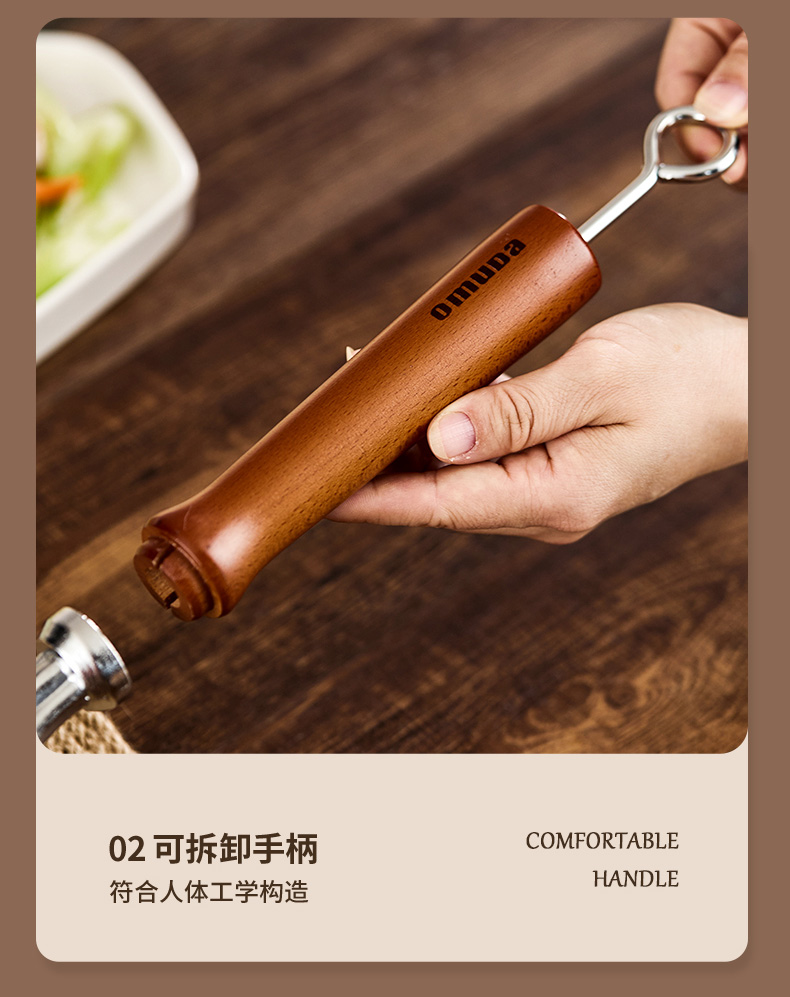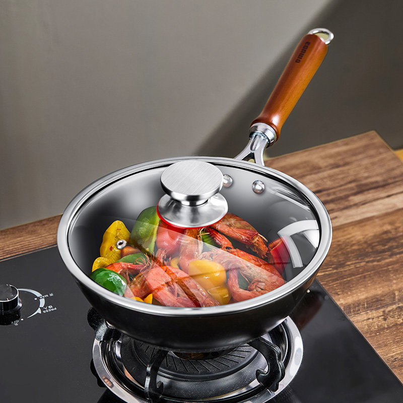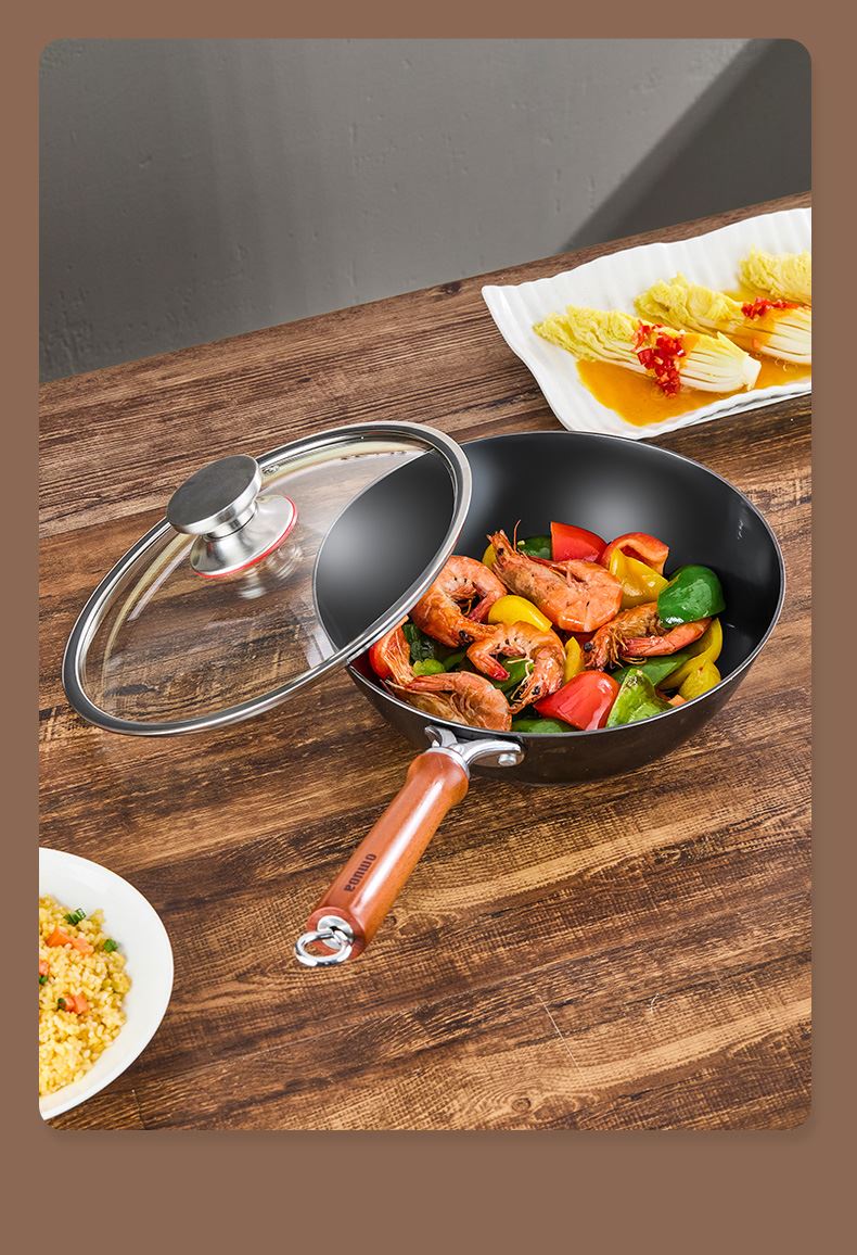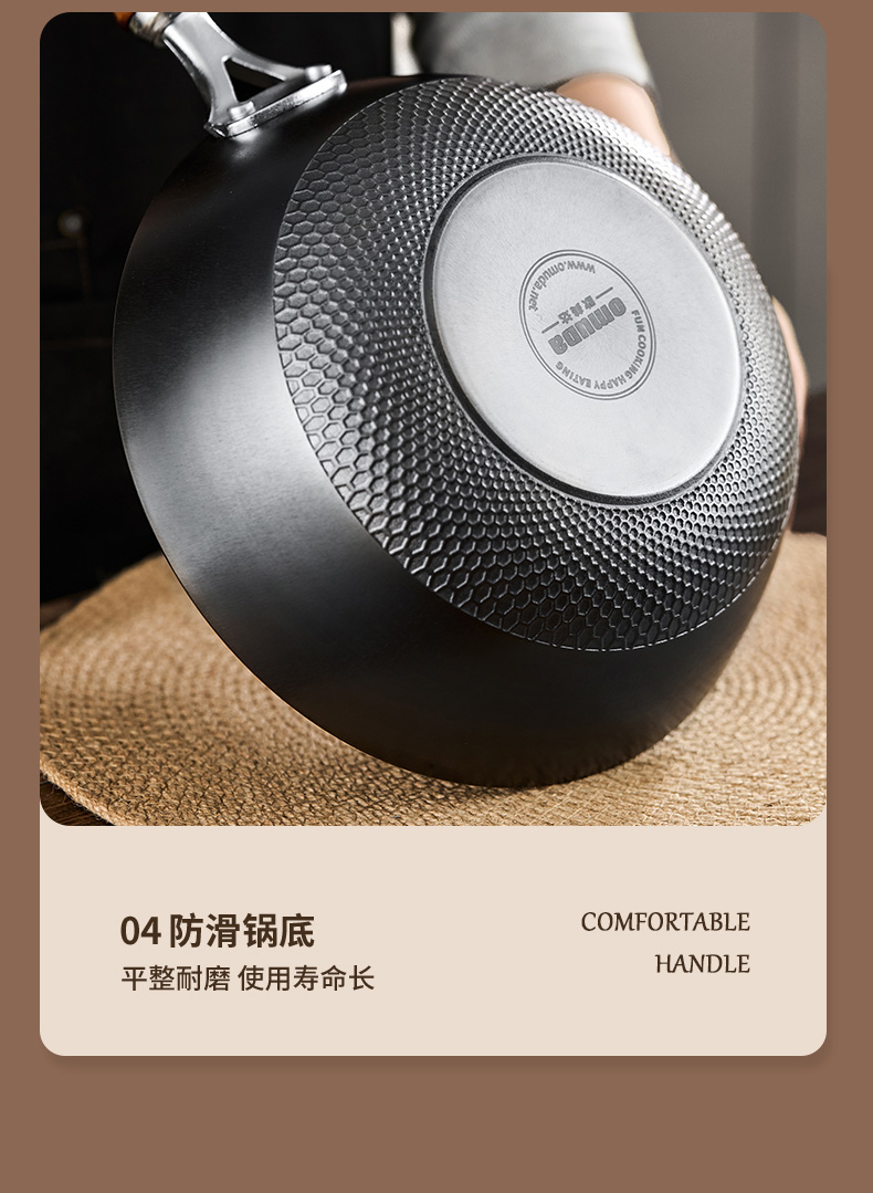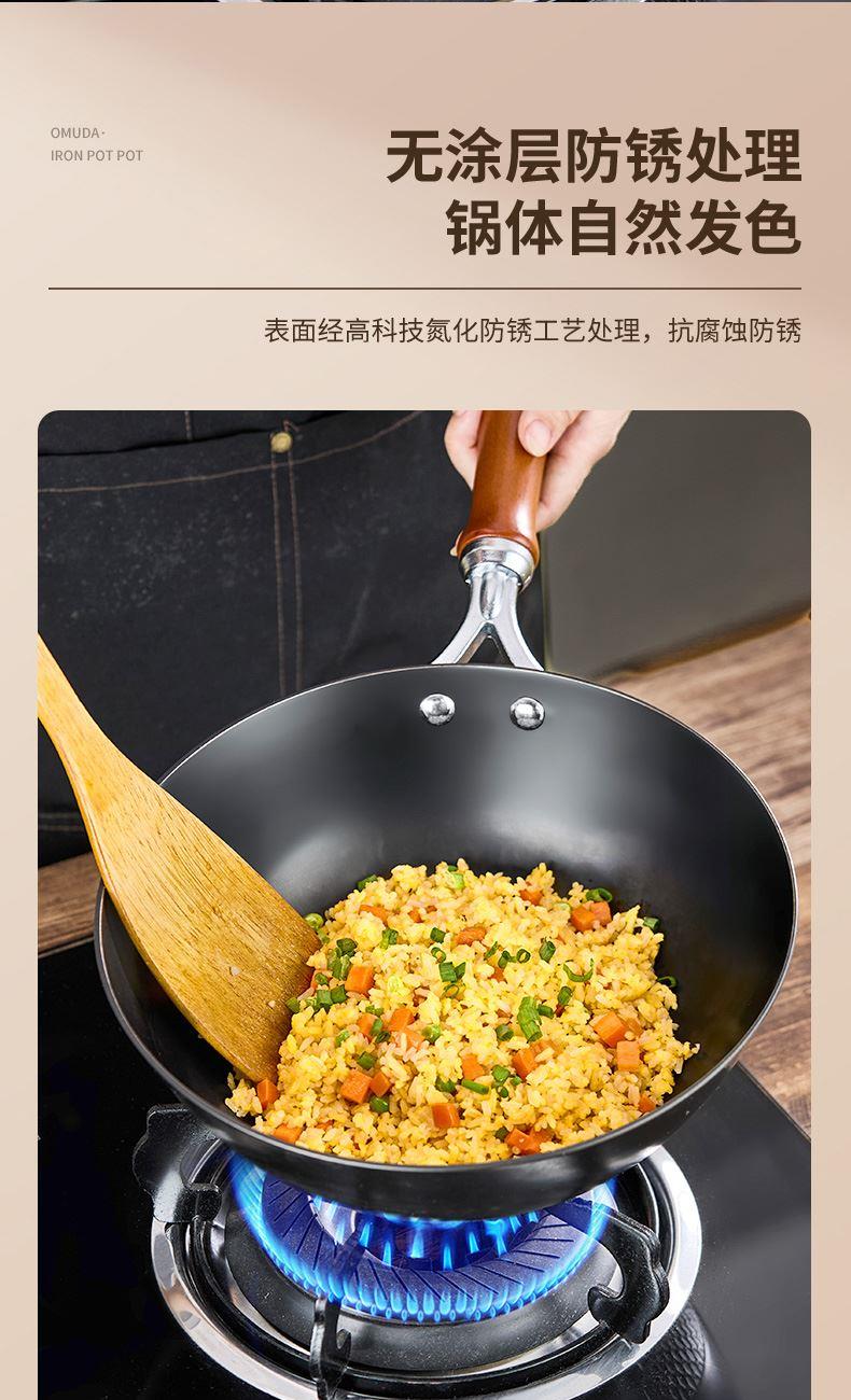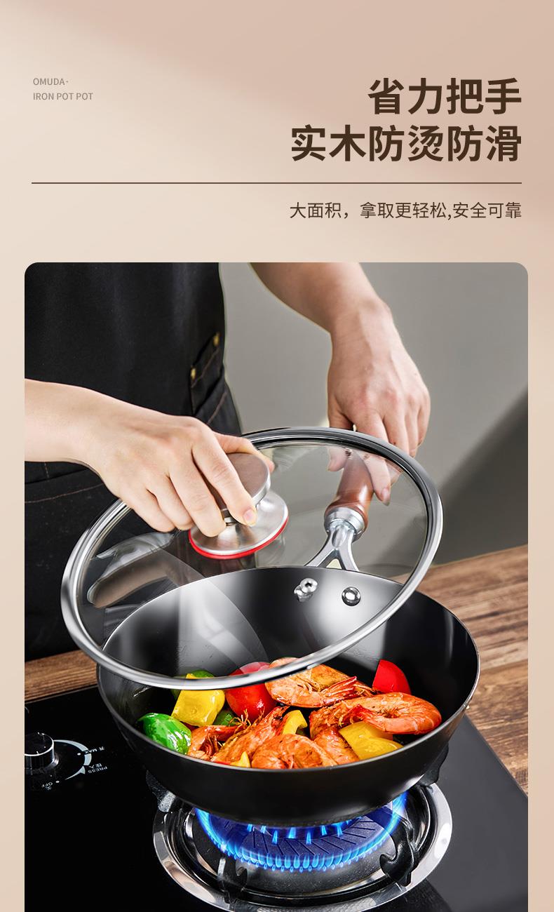 材质:灰生铁(铸铁) ① 原生态生铁锅,锅体采用深矿原生铁材质,经高温提炼、浇铸、切口、修边、抛光、氮化等多道工序匠心制作而成。 ②锅体自然发色,表面经高科技氮化防锈工艺处理,抗腐蚀防锈能力远高于行业标准。 ③铁材质导受热高,导热快速,旺火爆炒,让食材脆嫩爽口,口齿留香。 ④圆底设计,保留传统铁锅锅形,翻炒更顺心,底厚壁薄,储热性能强,传热快速均匀,不易焦糊,不含有对人体有害的重金属元素,健康安全。 ⑤进口防烫木柄,防烫更环保