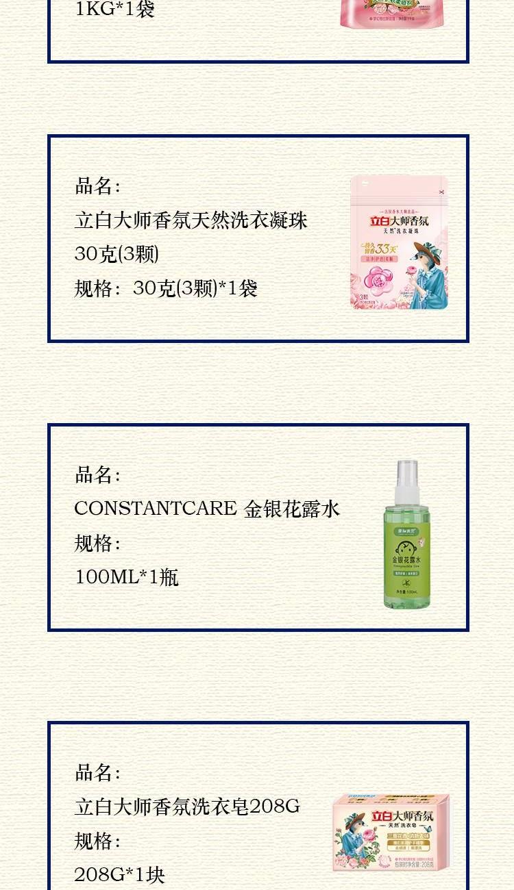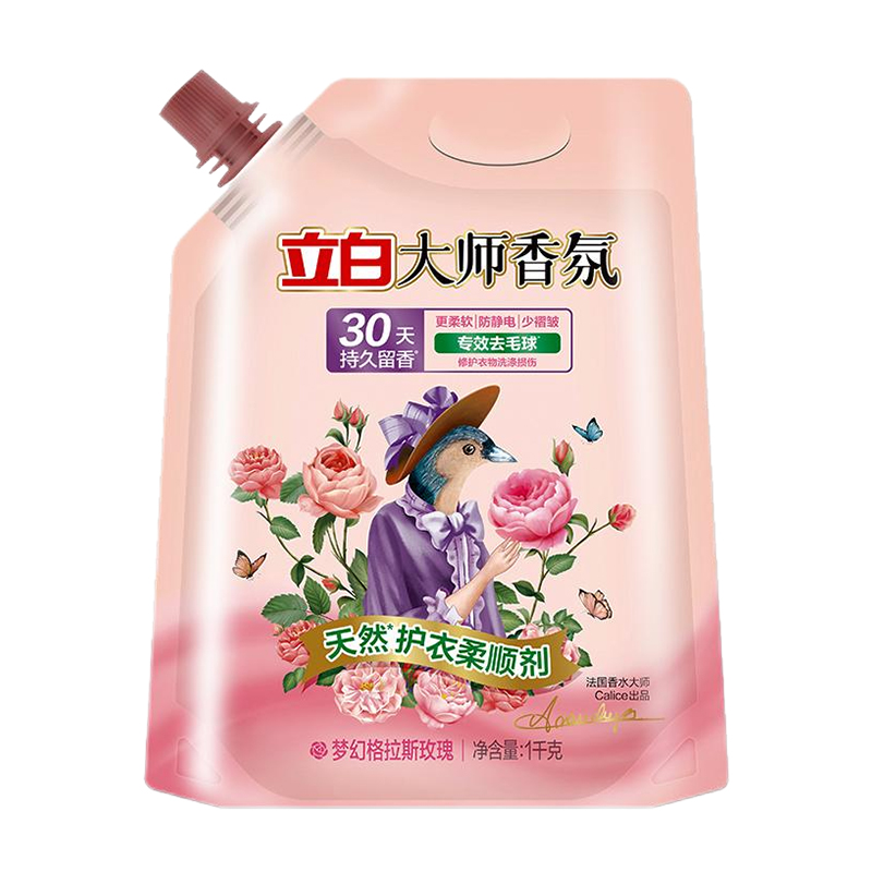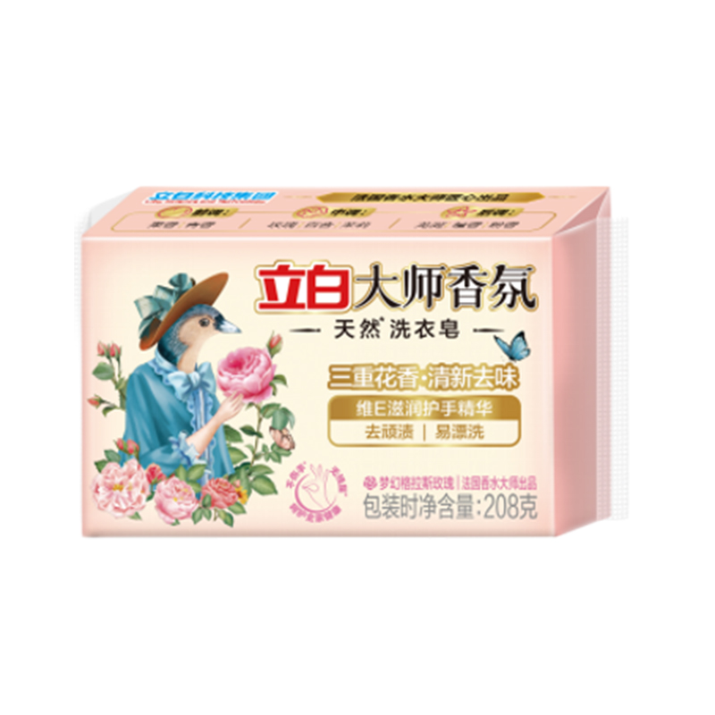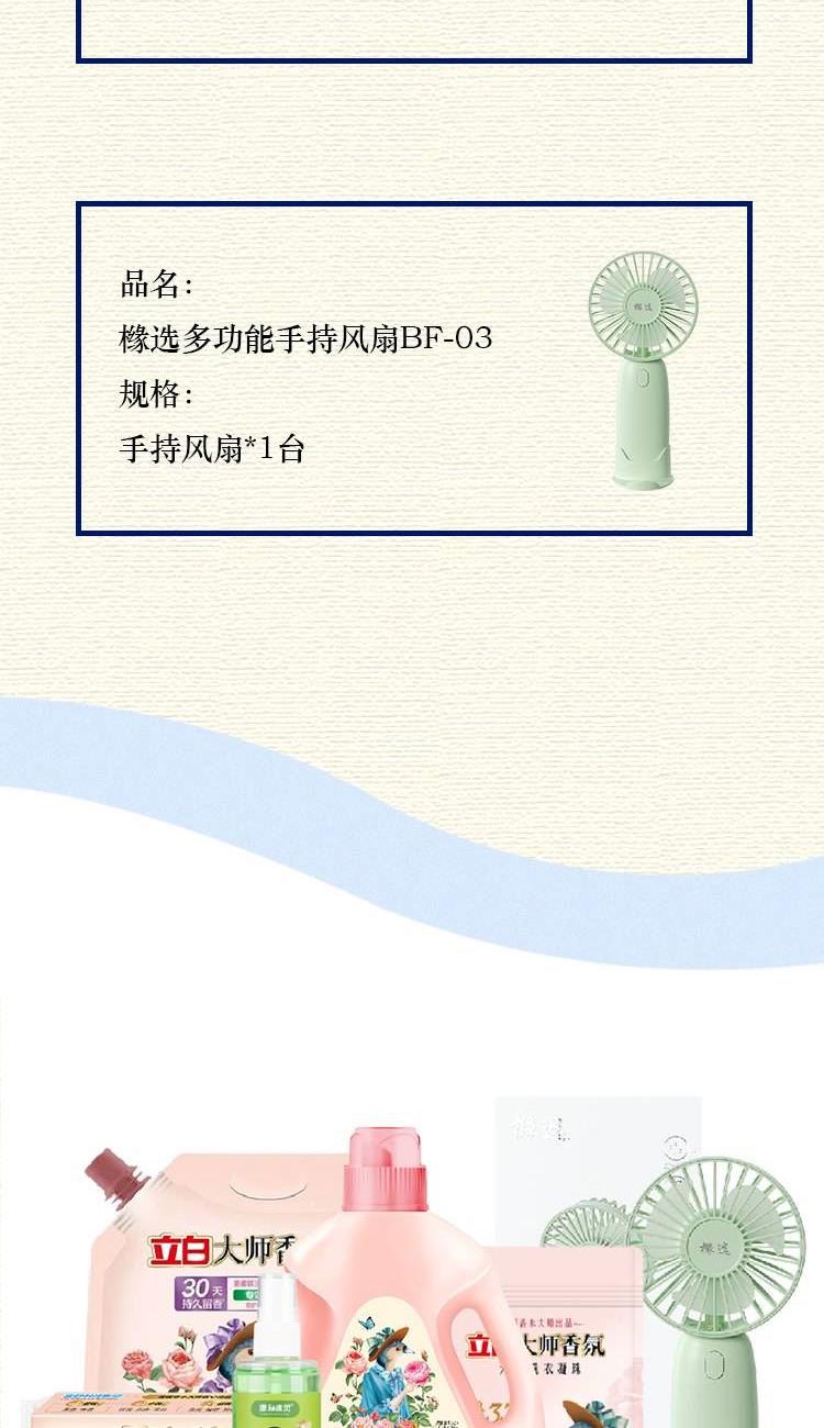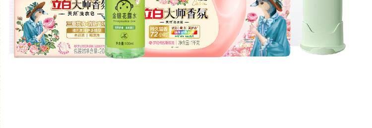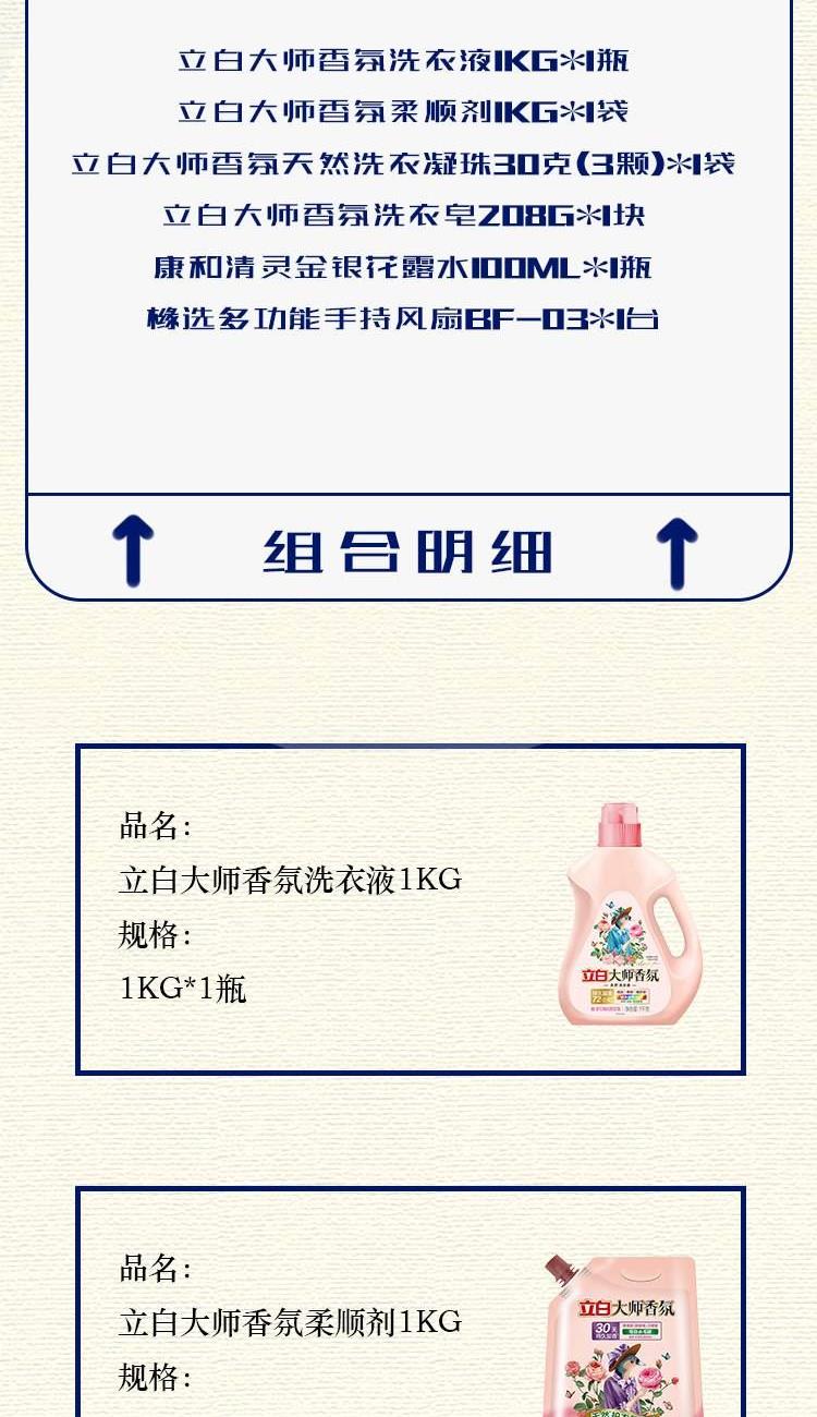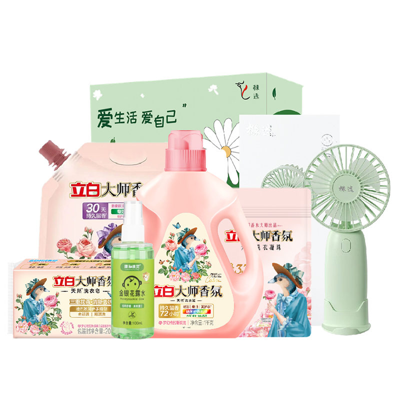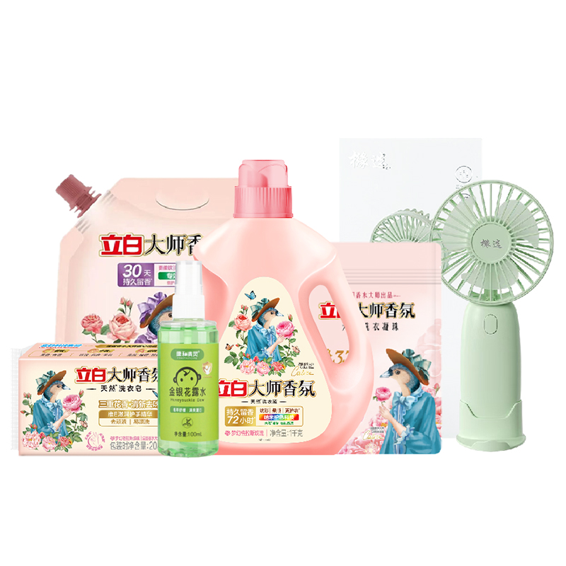 配置: 立白大师香氛洗衣液1kg*1瓶 立白大师香氛柔顺剂1kg*1袋 立白大师香氛天然洗衣凝珠30克(3颗)*1袋 立白大师香氛洗衣皂208g*1块 康和清灵金银花露水100mL*1瓶 橼选多功能手持风扇BF-03*1台 核心卖点: 立白爆品,大师香氛系列 国际香水大师调香 首创留香72小时。 法国格拉斯是世界闻名的香水之都,每年玫瑰盛放时香气四溢,连飞鸟都停下脚步,陶醉其中。法国香水大师Calice以此为灵感,融入玫瑰与飞鸟的自由浪漫气息,与锁香入瓶,献给优雅且热爱生活的您,立白大师香氛,让洗衣变成一种享受!