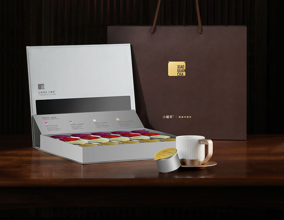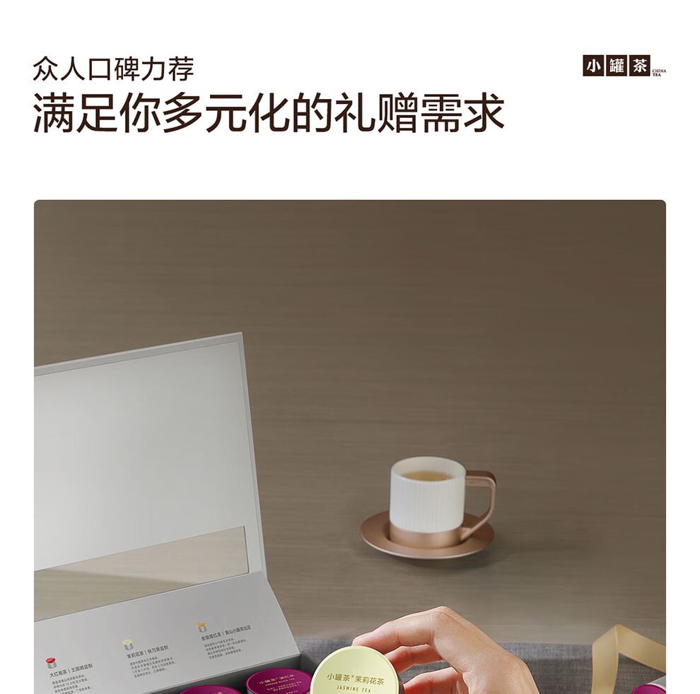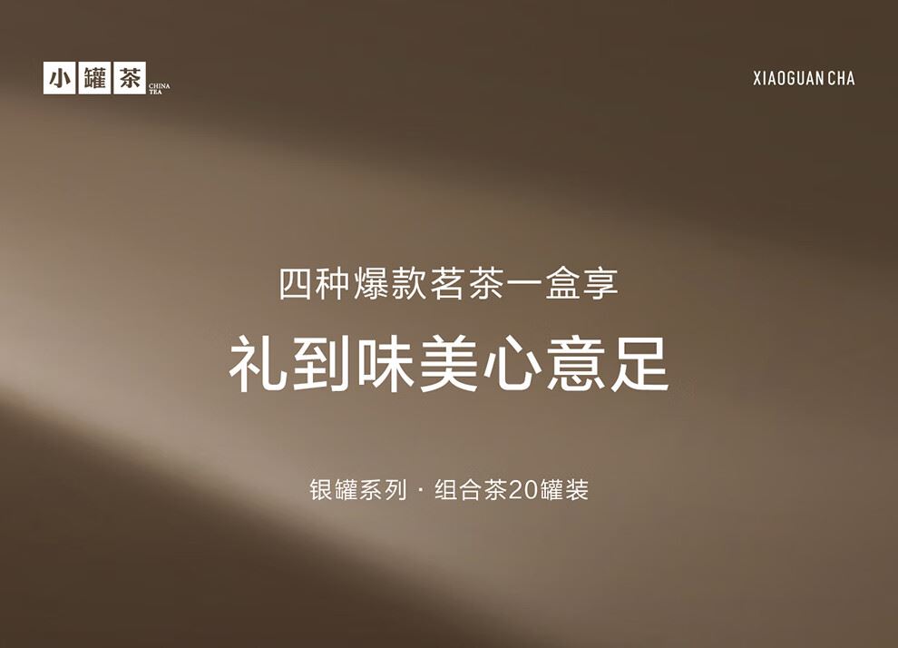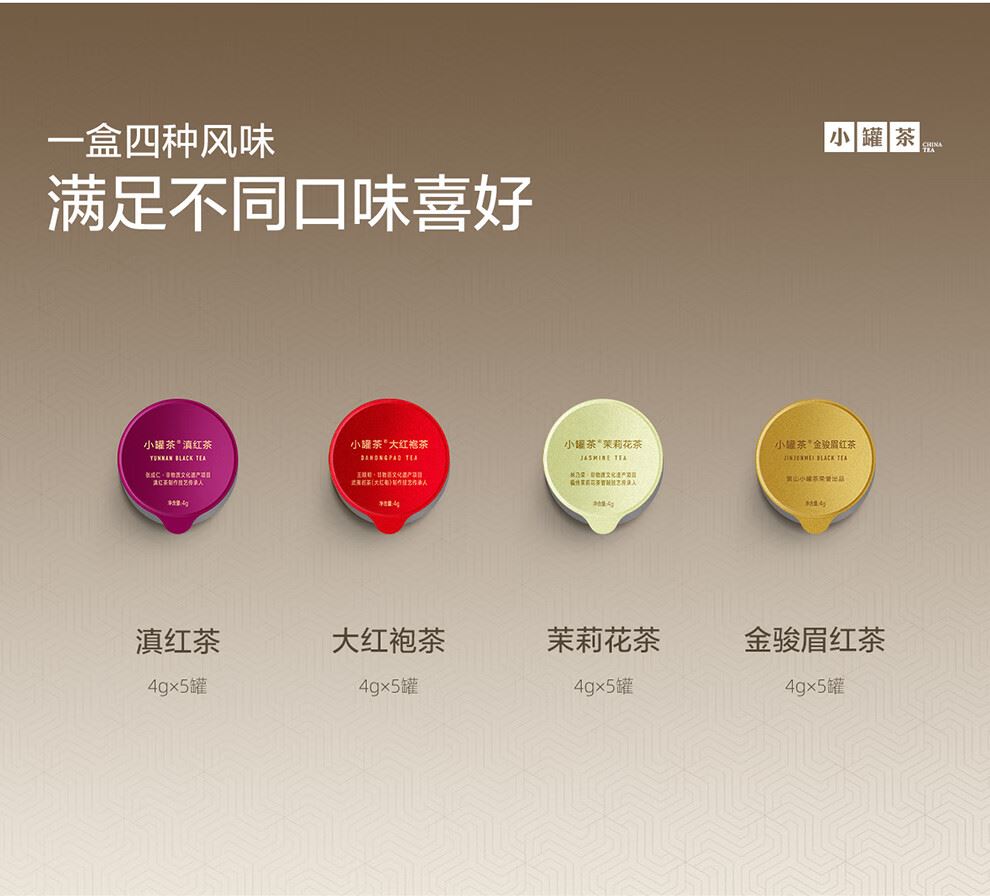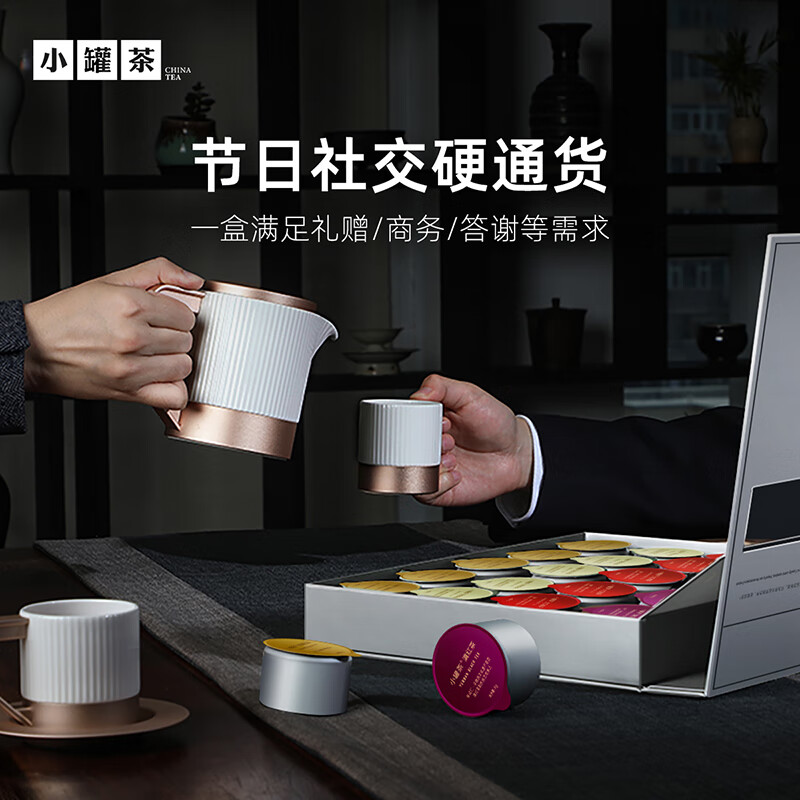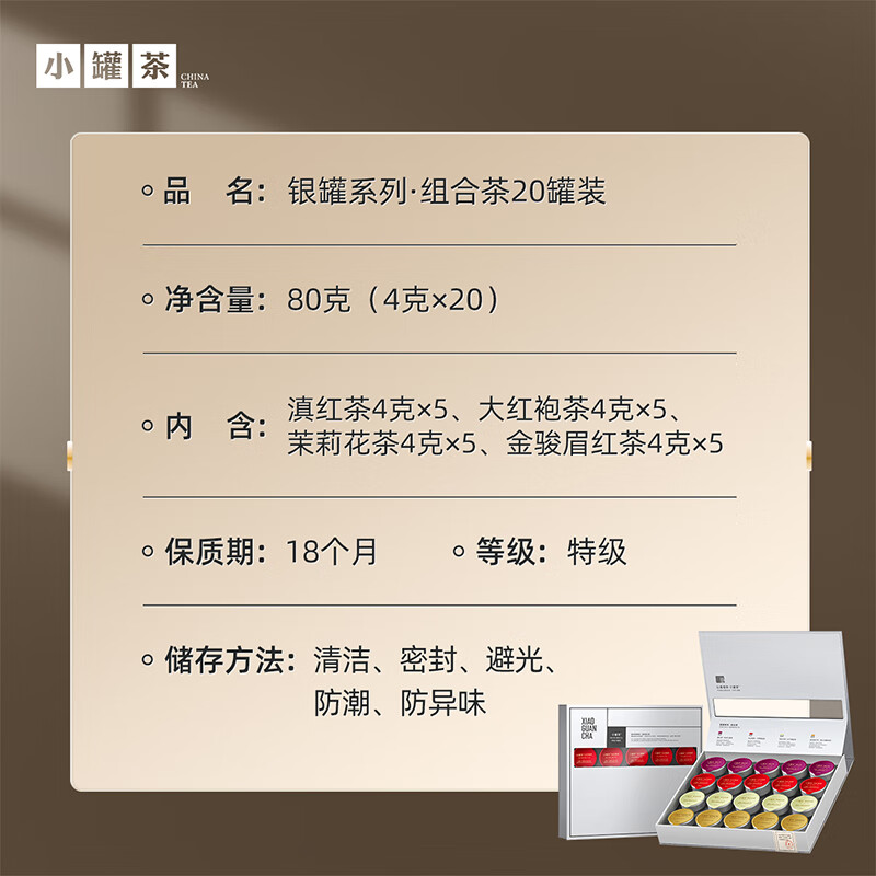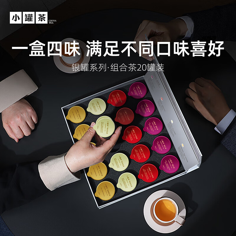 轻奢商务茶叶pinpai-小罐茶 小罐茶全国线下2000+实体门店 小罐茶 x 敢保真(产地保真、年份保真、安全保真) 档次商务送礼就送小罐茶 四种经典茗茶一盒享 礼到味美心意足 科学做茶 让好茶有标准 树立行业好茶标准 非遗大师监制 银罐系列·组合茶20罐装 净含量:80克(滇红茶4克x5、大红袍茶4克x5、茉莉花茶 4克x5、金骏眉红茶4克x5) - 精致礼盒包装,送礼体面彰显尊贵。20罐独立包装传递十全十美的祝福。一饮一罐,定量封装,手不沾茶,更显品位。 宜礼宜饮 适用多种社交场景传递美好情谊 一盒满足礼赠贵宾、商务会面、重要答谢等需求。