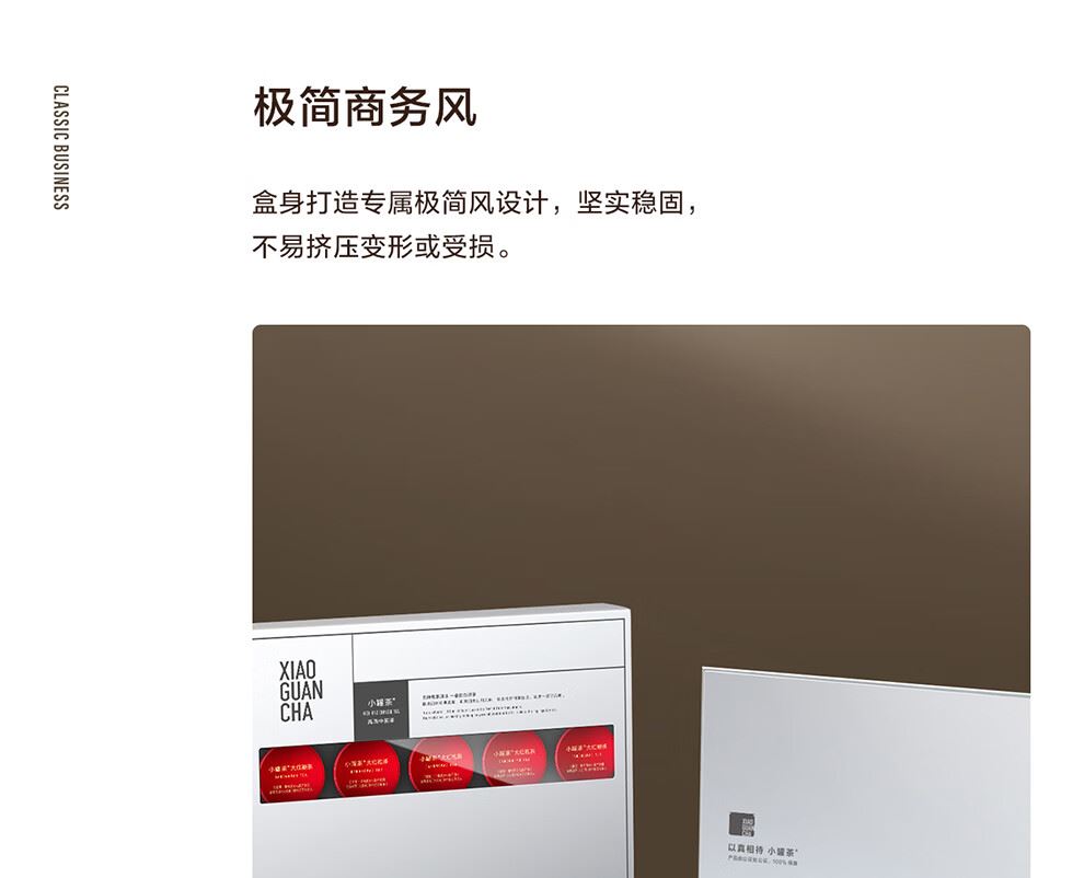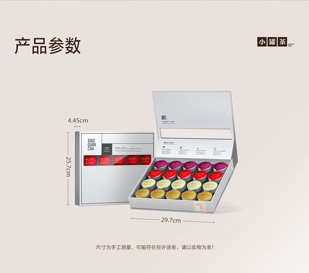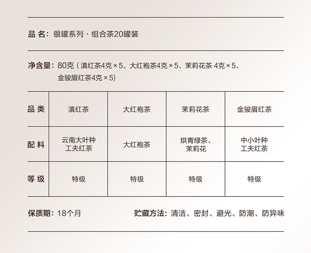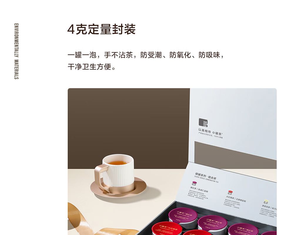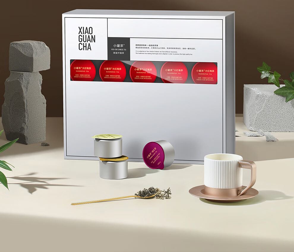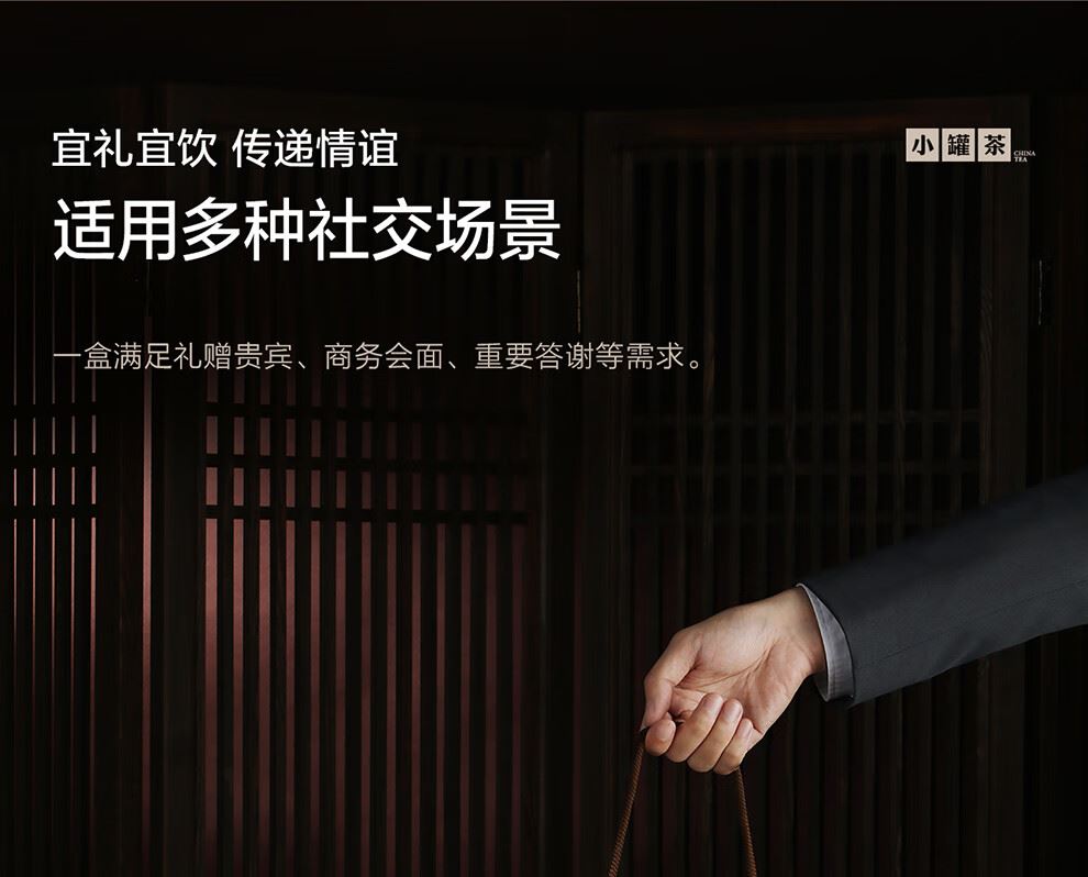 轻奢商务茶叶pinpai-小罐茶 小罐茶全国线下2000+实体门店 小罐茶 x 敢保真(产地保真、年份保真、安全保真) 档次商务送礼就送小罐茶 四种经典茗茶一盒享 礼到味美心意足 科学做茶 让好茶有标准 树立行业好茶标准 非遗大师监制 银罐系列·组合茶20罐装 净含量:80克(滇红茶4克x5、大红袍茶4克x5、茉莉花茶 4克x5、金骏眉红茶4克x5) - 精致礼盒包装,送礼体面彰显尊贵。20罐独立包装传递十全十美的祝福。一饮一罐,定量封装,手不沾茶,更显品位。 宜礼宜饮 适用多种社交场景传递美好情谊 一盒满足礼赠贵宾、商务会面、重要答谢等需求。