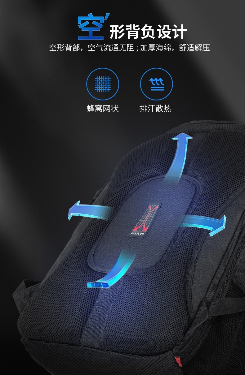 型 号:8112 大号 尺 寸: 250*350*480(MM)大号 材 质:聚酯纤维 颜 色:黑色 重 量:1.0kg 空型背负,空气流通无阻;加厚海绵,舒适解压。180°一体箱设计空间大,开合设计,便捷开合,节省时间。多功能搭载,大容量,商务出行