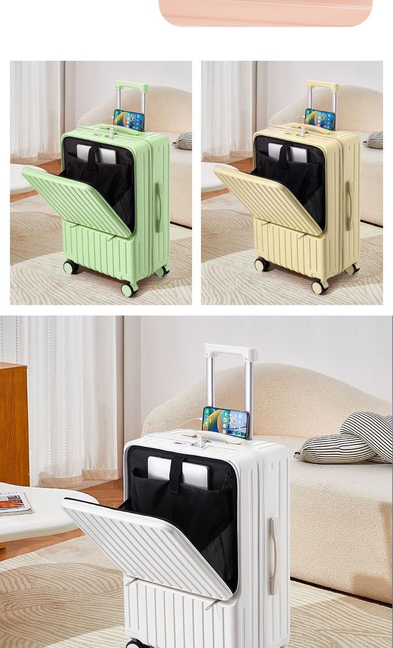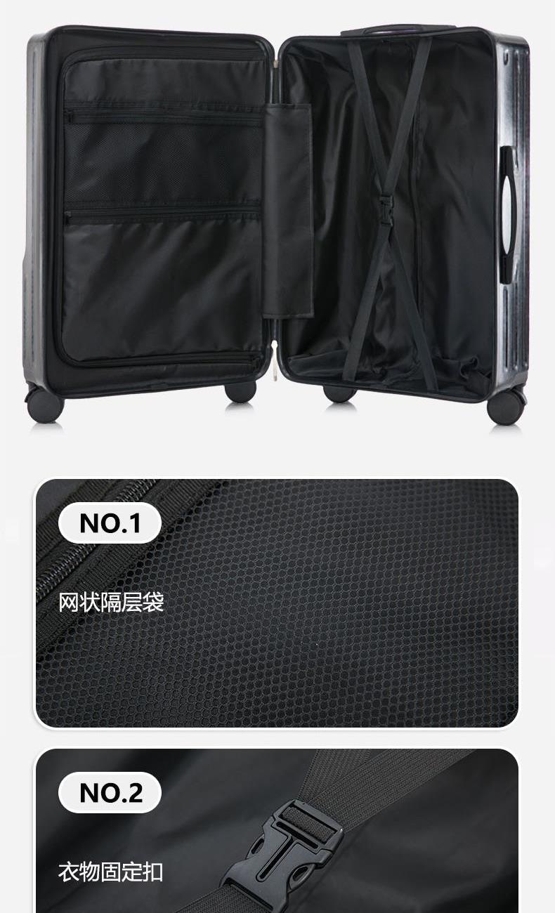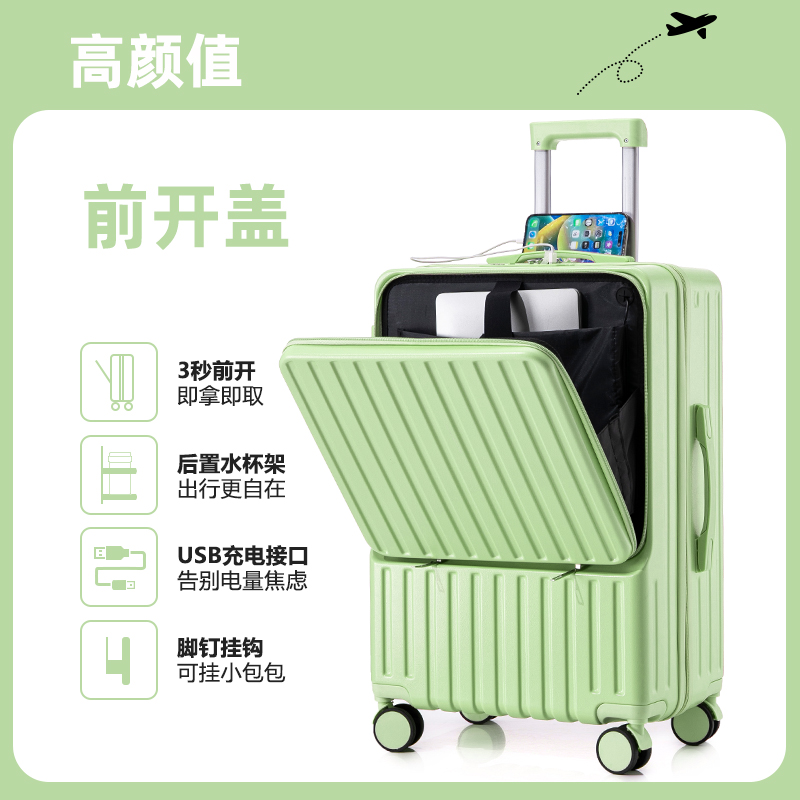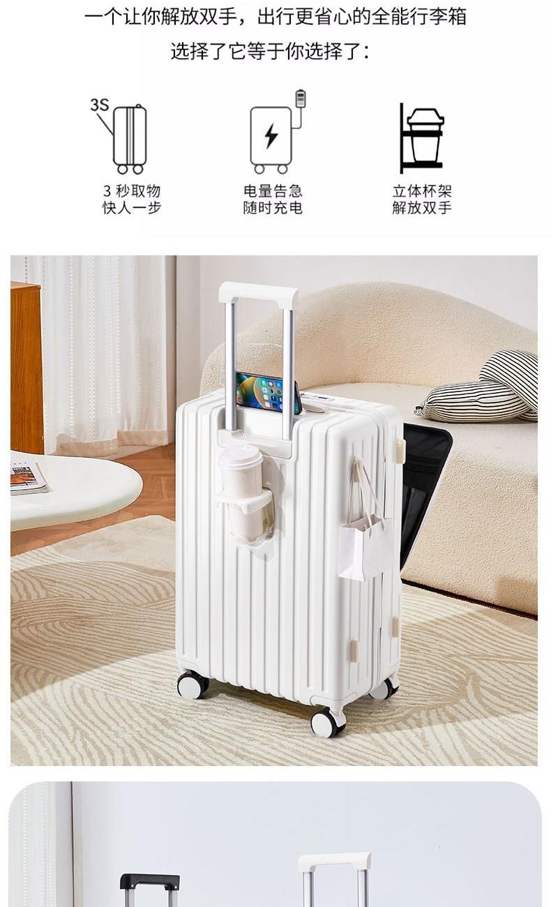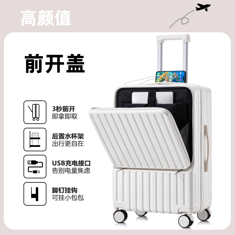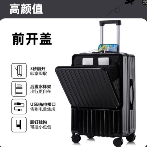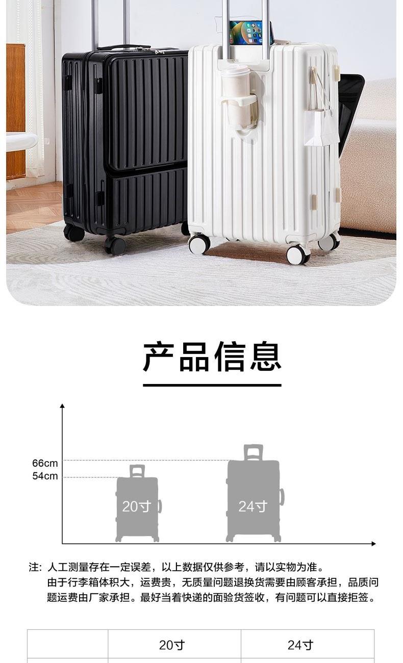 多功能前开仓,即用小物轻松拿取,箱体采用ABS+PC材料,防刮耐磨,凸显箱子质感的同时具备良好的耐磨损;后置可折叠便携杯架,咖啡、水杯、雨伞都可放这,外置USB充电接口,硅胶提手,三位密码锁,挂钩站脚,更多隐藏功能期待你的解锁,轻音万向轮,畅滑省力,旅途优雅不打扰;内置X型固定带,网状隔层袋分区收纳更合理,轻松出行无负担~ 新疆/西藏/内蒙不发,四川凉山彝族、攀枝花市、甘孜藏族、阿坝藏族羌族运费实际收,无7天无理由退货