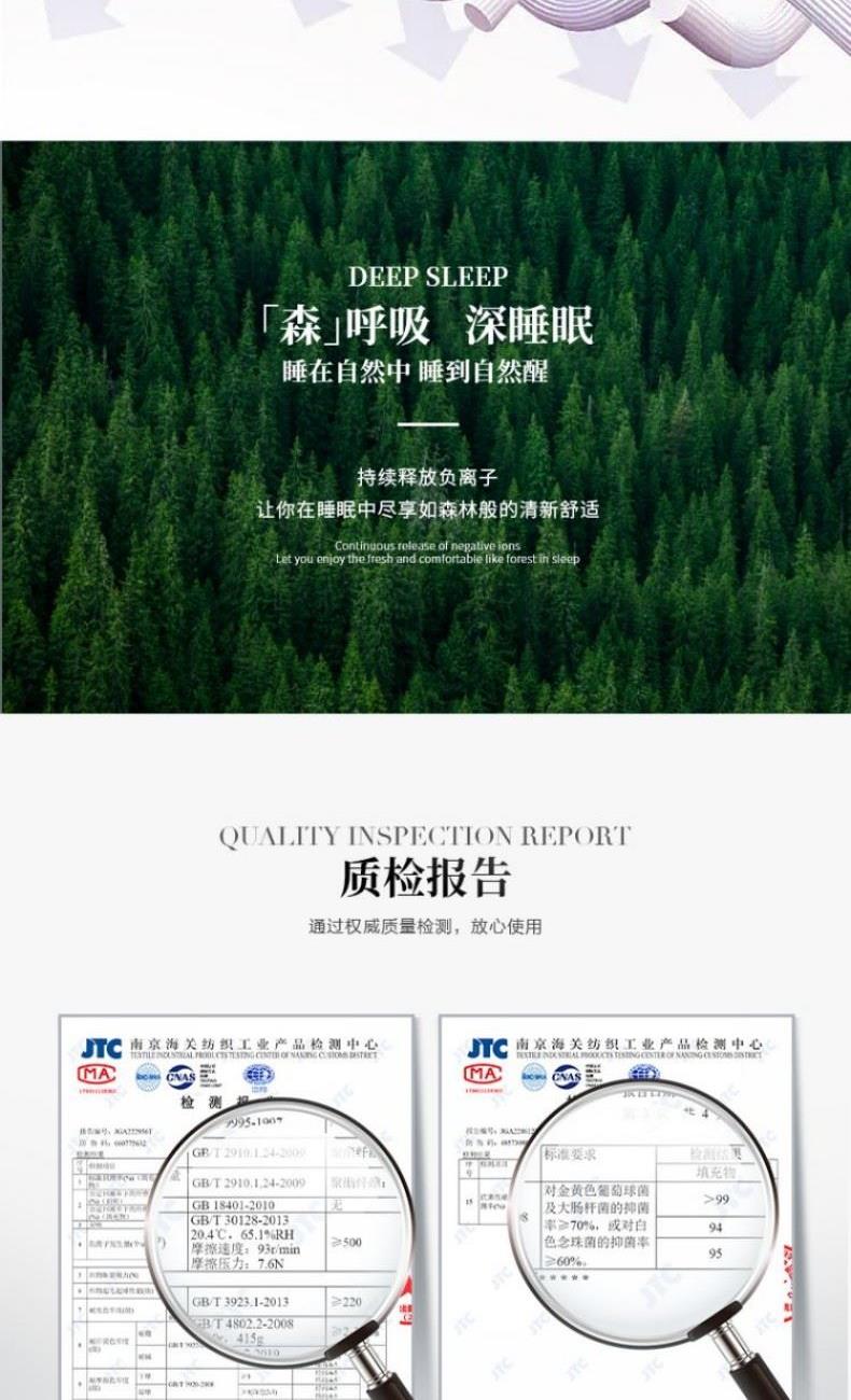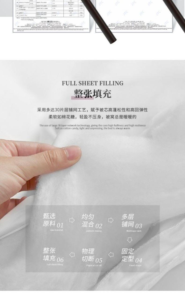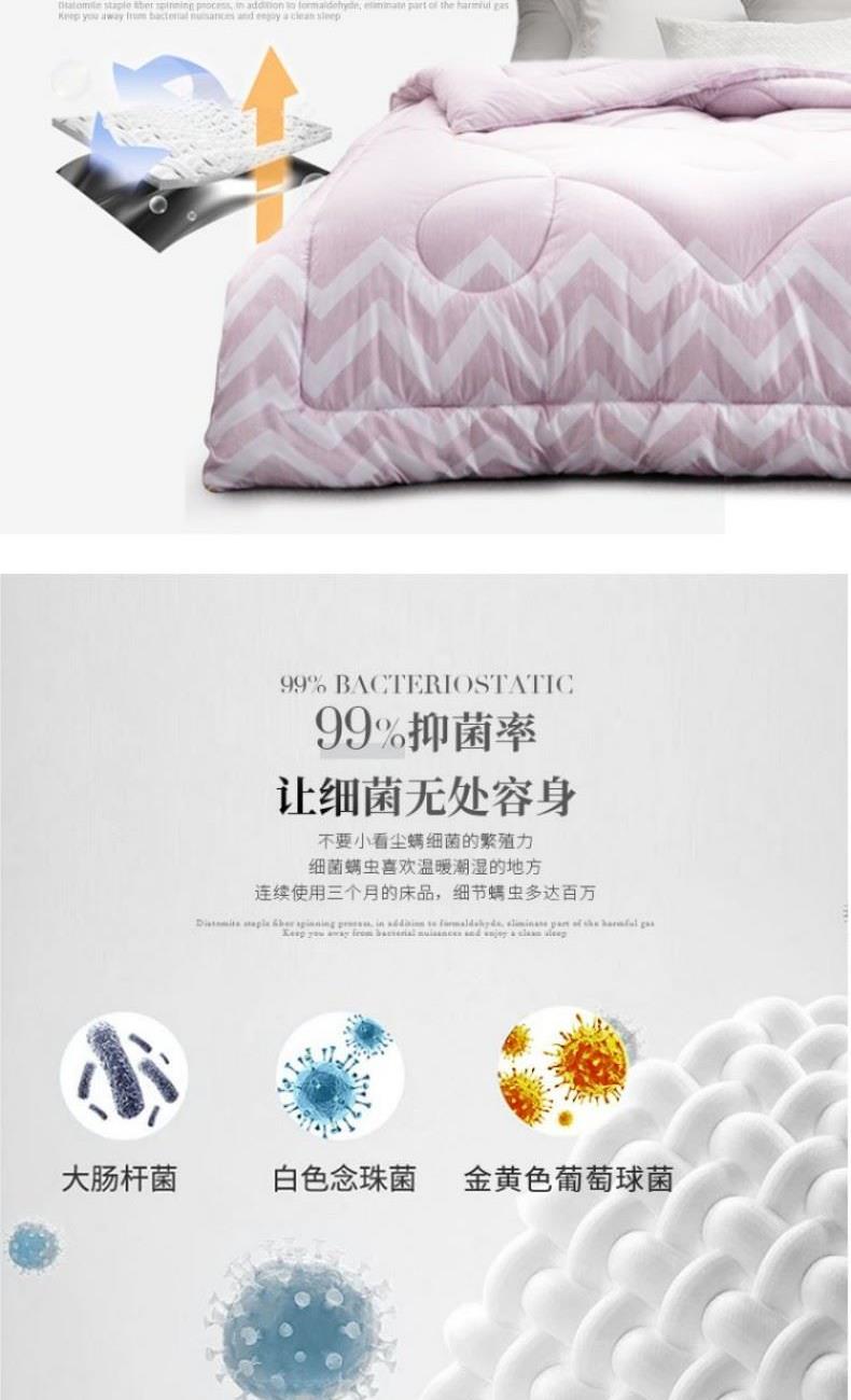 面料:聚酯纤维 规格:200*230cm 填充物:聚酯纤维(内含七孔聚酯纤维;50%硅藻土纤维) 填充克重:1200g