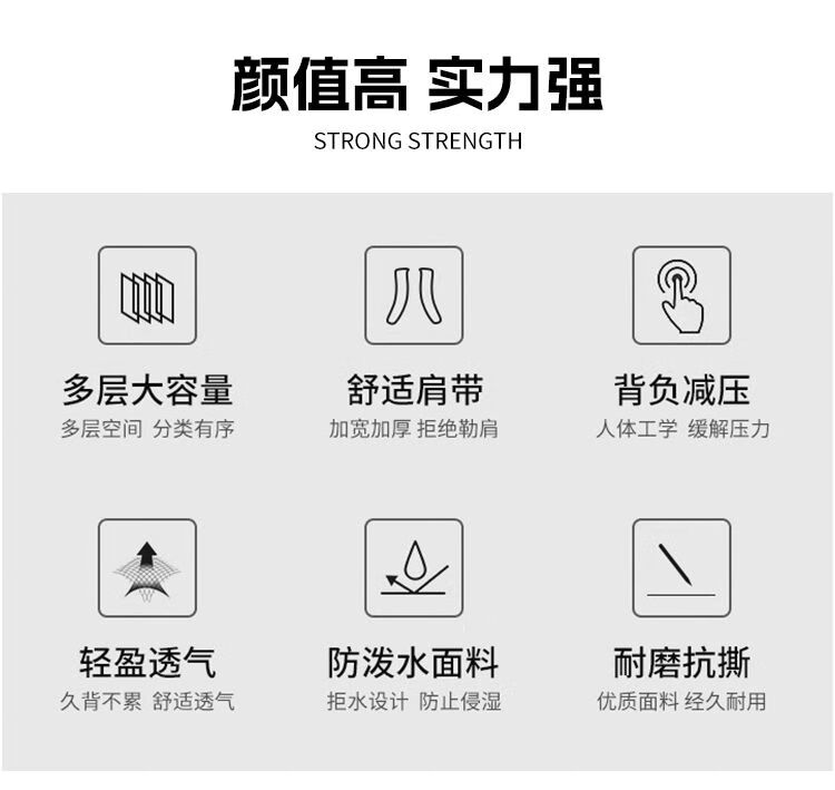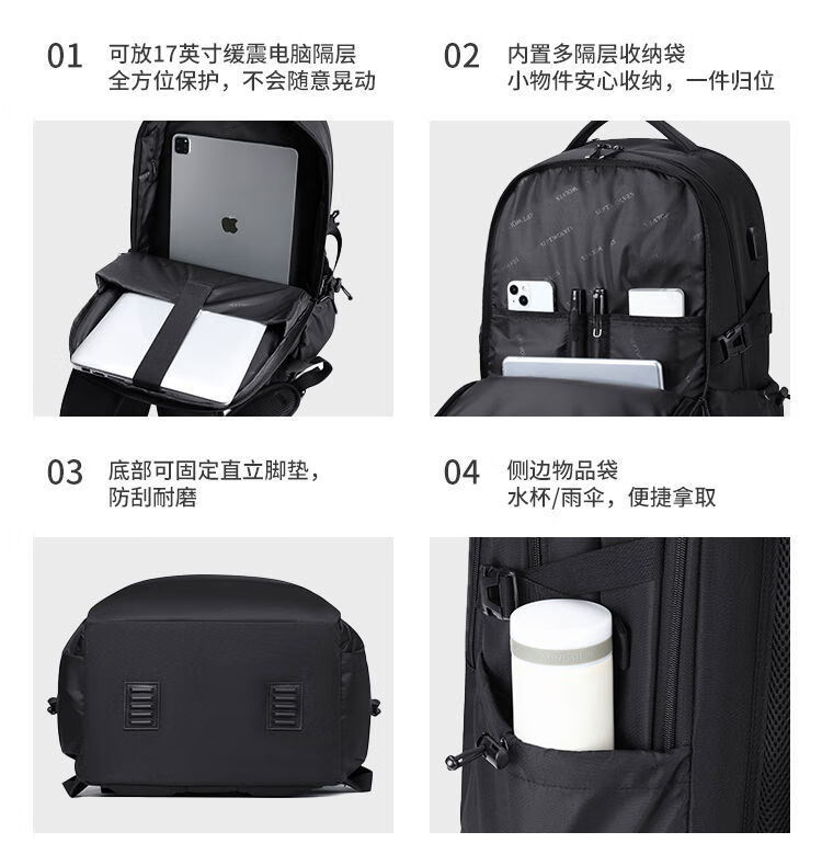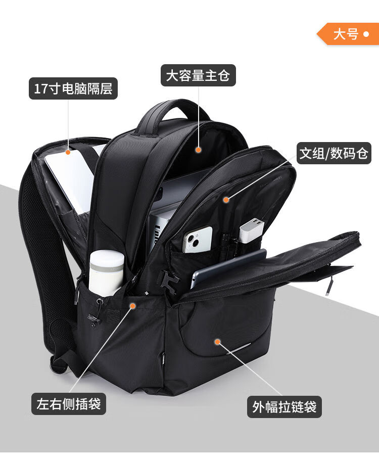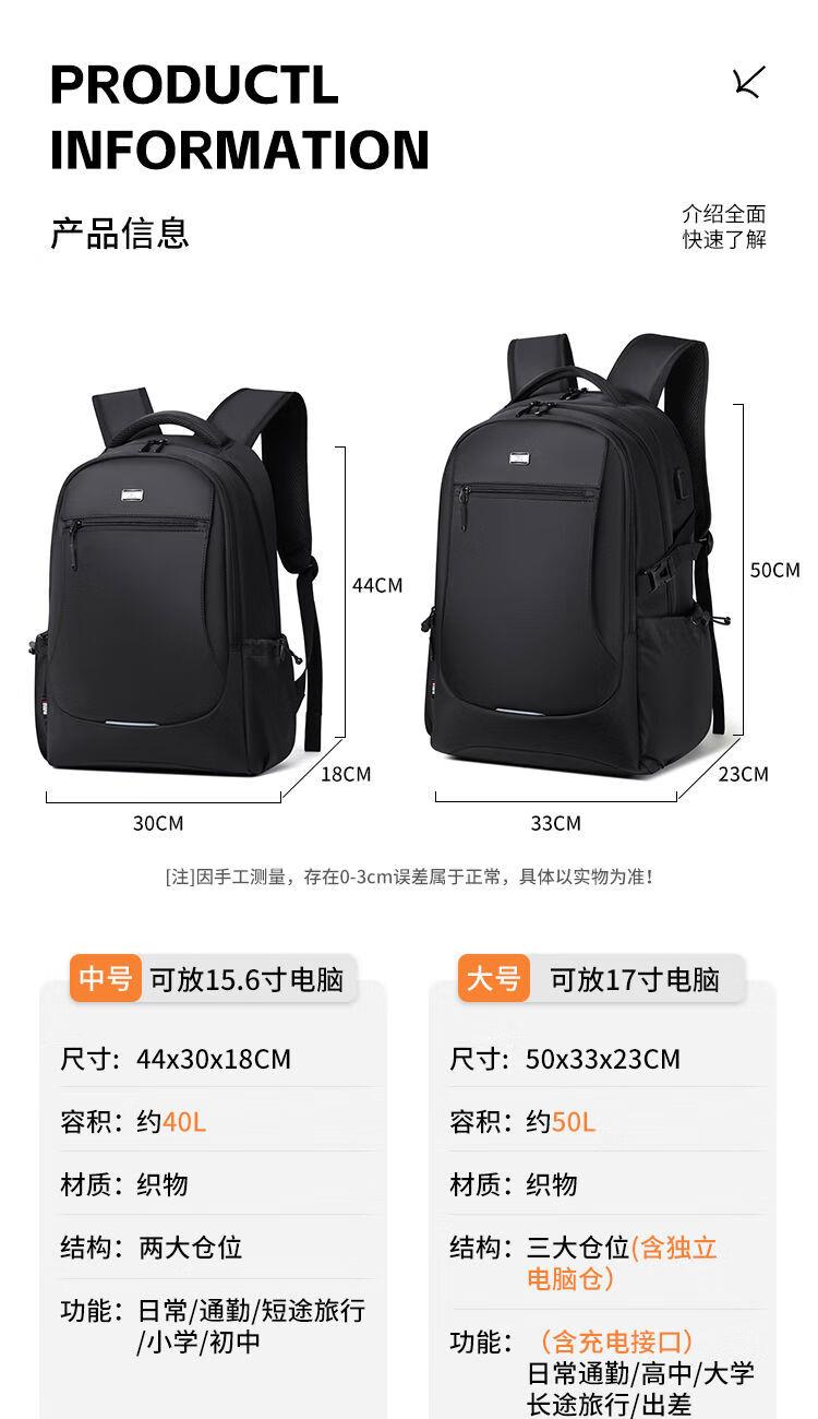 类别:背包 外部材质:织物 闭合方式:拉链 规格:500X330X230mm 容纳电脑尺寸:17寸 风格:通勤风 商务风 携包出行,旅途无忧,立体挺括包型兼顾时尚外观与功能性,轻松驾驭多种都市出行场景 内里大容装载,多层收纳空间,满足多样收纳需求,轻装出行,采用高密度织物面料,防刮耐用,防泼贱,轻松应对泼水,便携外置USB充电接口,3D透气蜂窝设计,柔软减压肩带