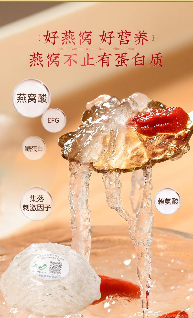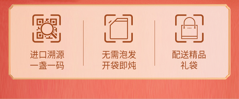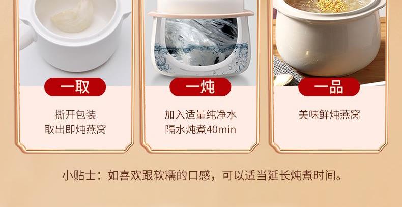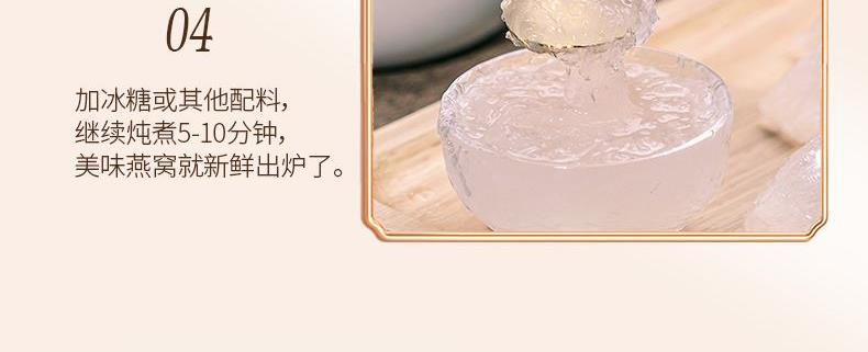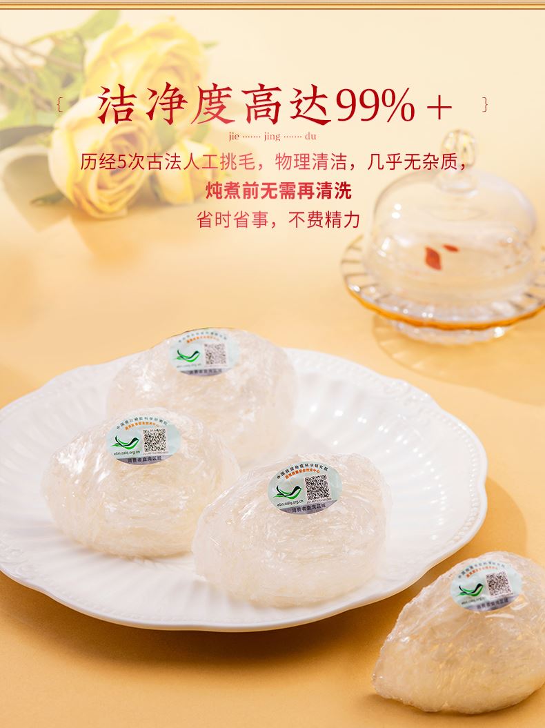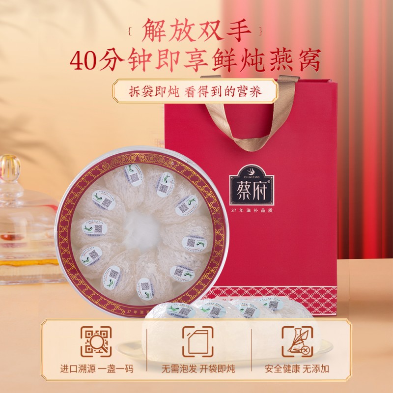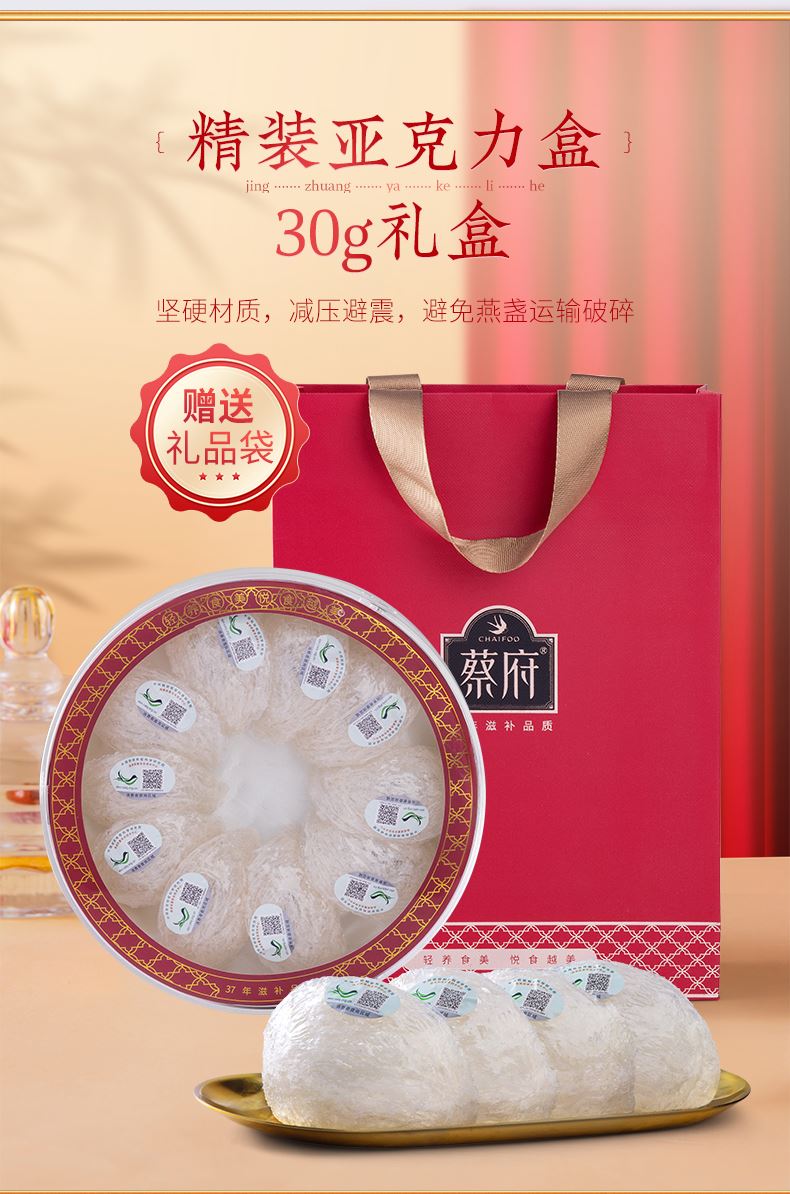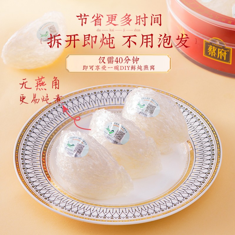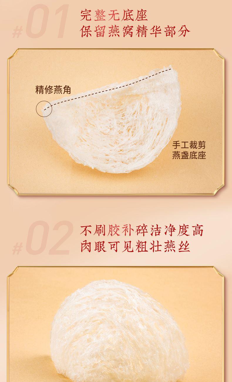 规格:30g 卖点: 免泡发,即炖燕盏燕窝礼盒, 花燕条的钱吃燕盏营养; 来自印尼红树林产地的洁净燕条; 条形完整营养高、干度高(轻捏即碎)、一包一码; 手工挑毛,缝隙自然。