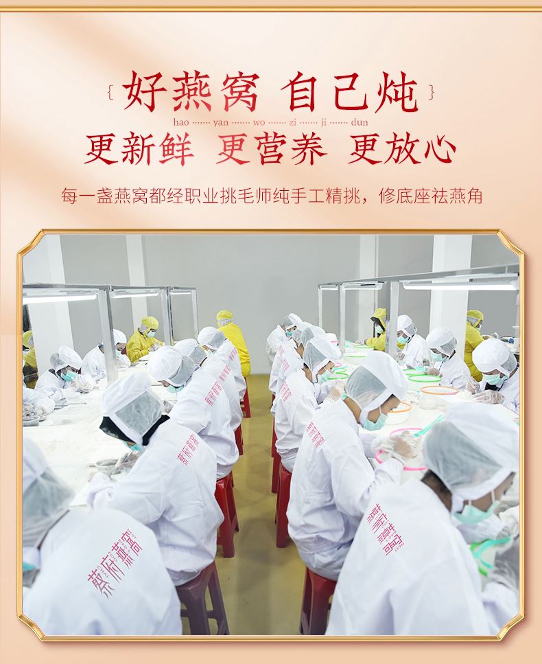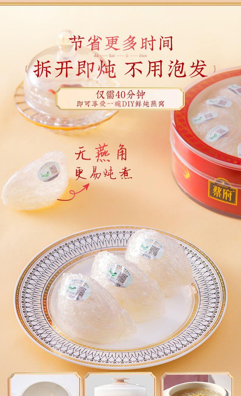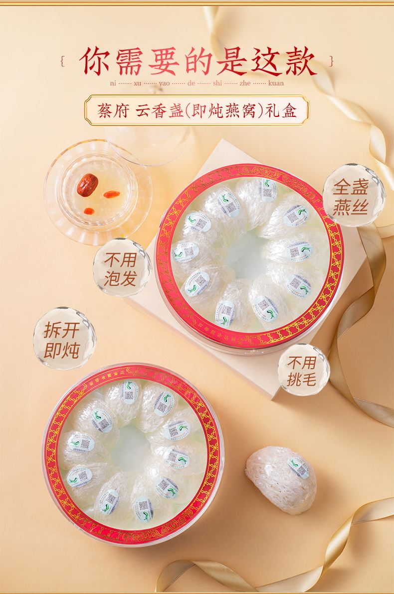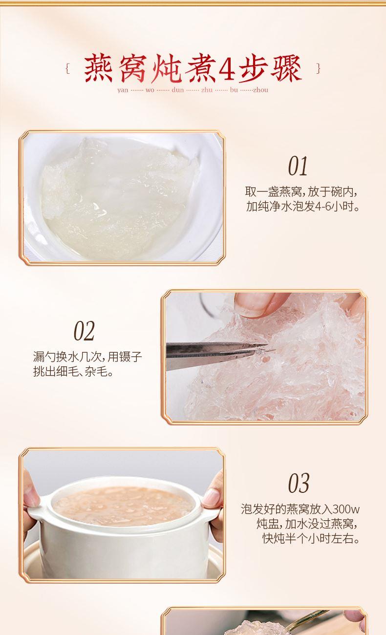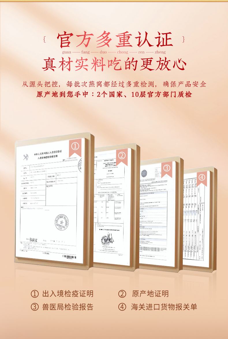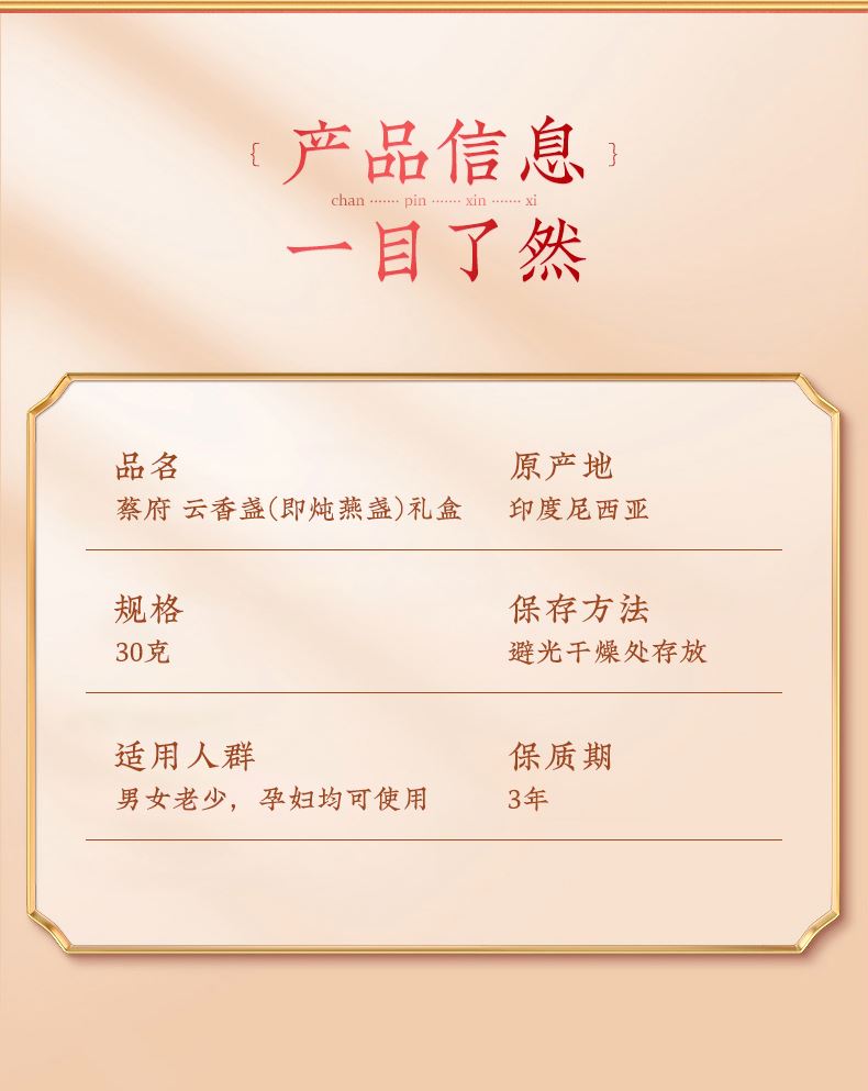 规格:30g 卖点: 免泡发,即炖燕盏燕窝礼盒, 花燕条的钱吃燕盏营养; 来自印尼红树林产地的洁净燕条; 条形完整营养高、干度高(轻捏即碎)、一包一码; 手工挑毛,缝隙自然。