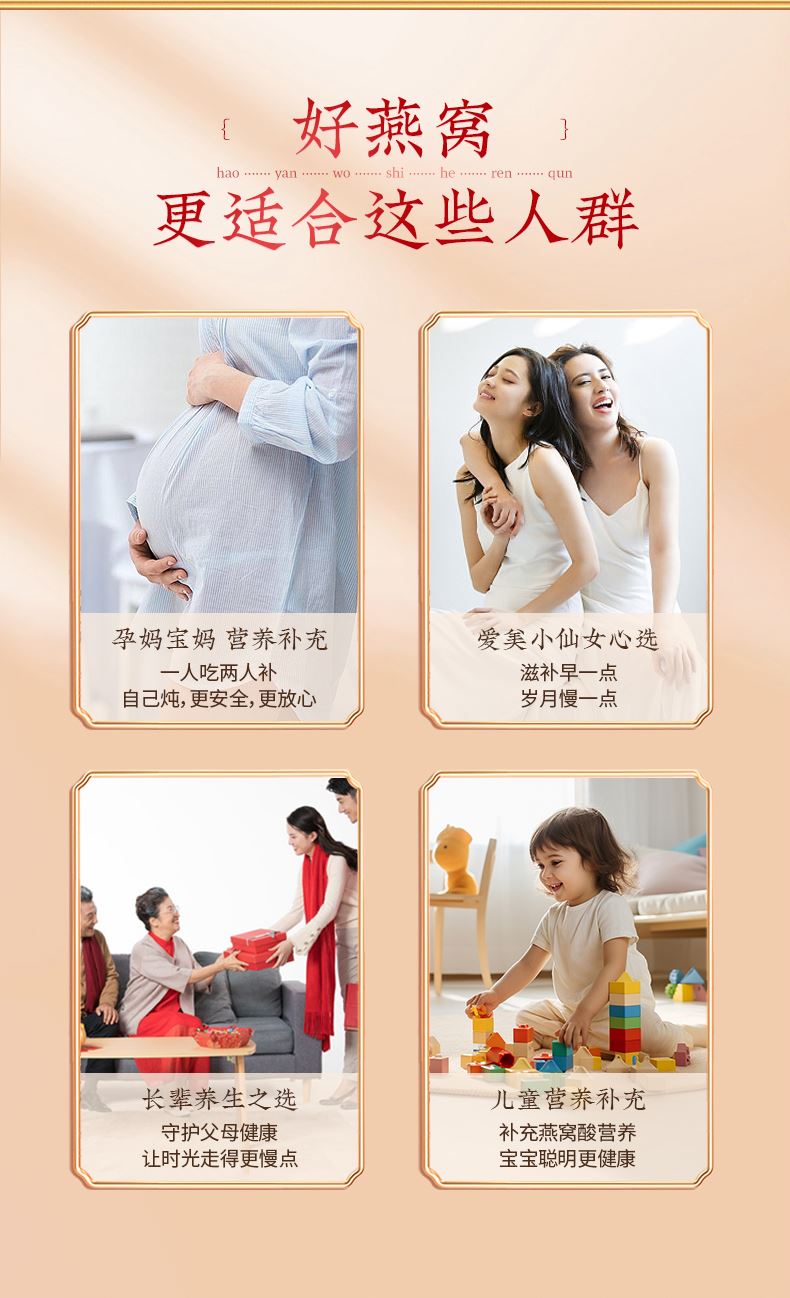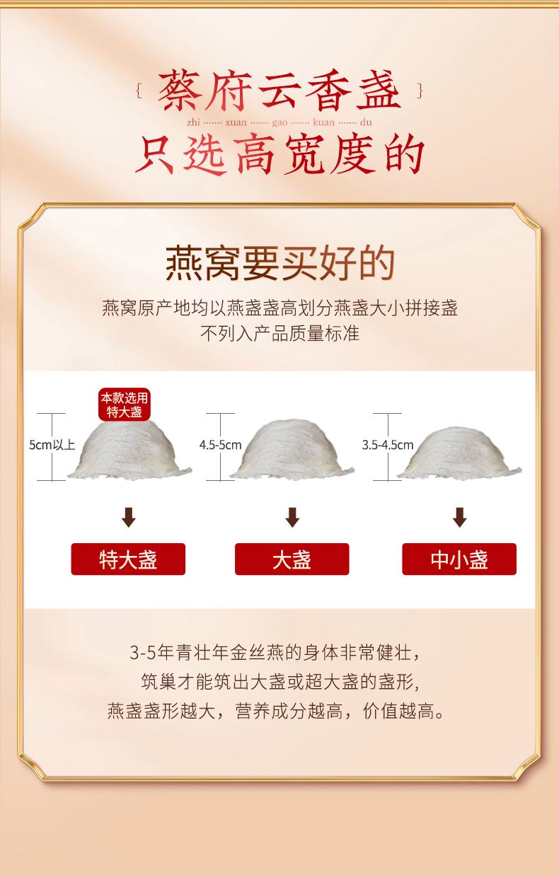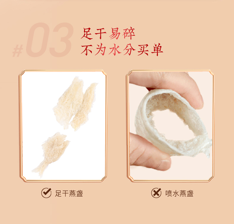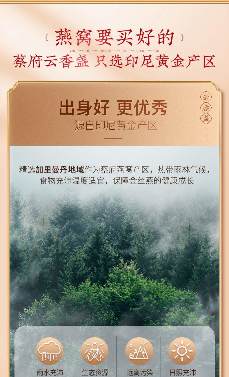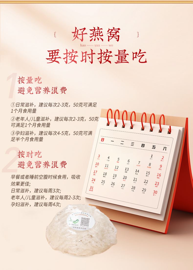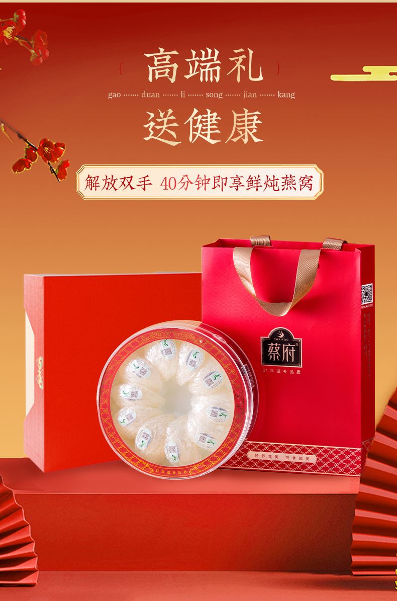 规格:30g 卖点: 免泡发,即炖燕盏燕窝礼盒, 花燕条的钱吃燕盏营养; 来自印尼红树林产地的洁净燕条; 条形完整营养高、干度高(轻捏即碎)、一包一码; 手工挑毛,缝隙自然。