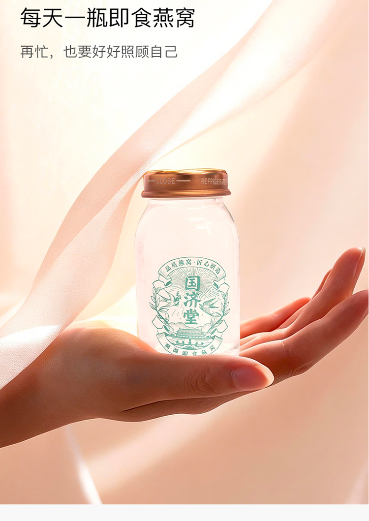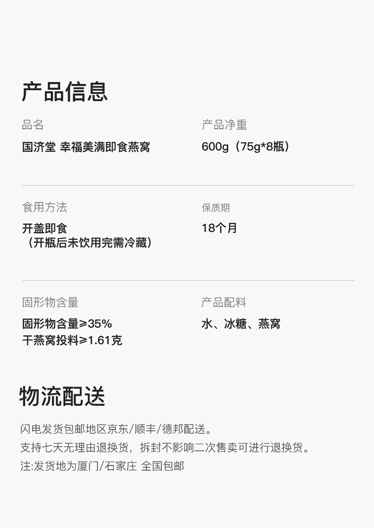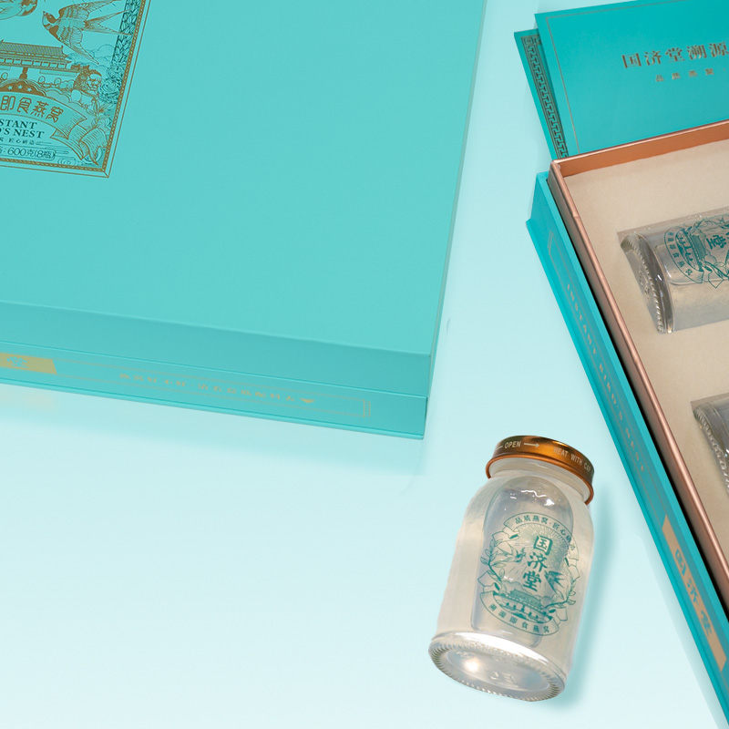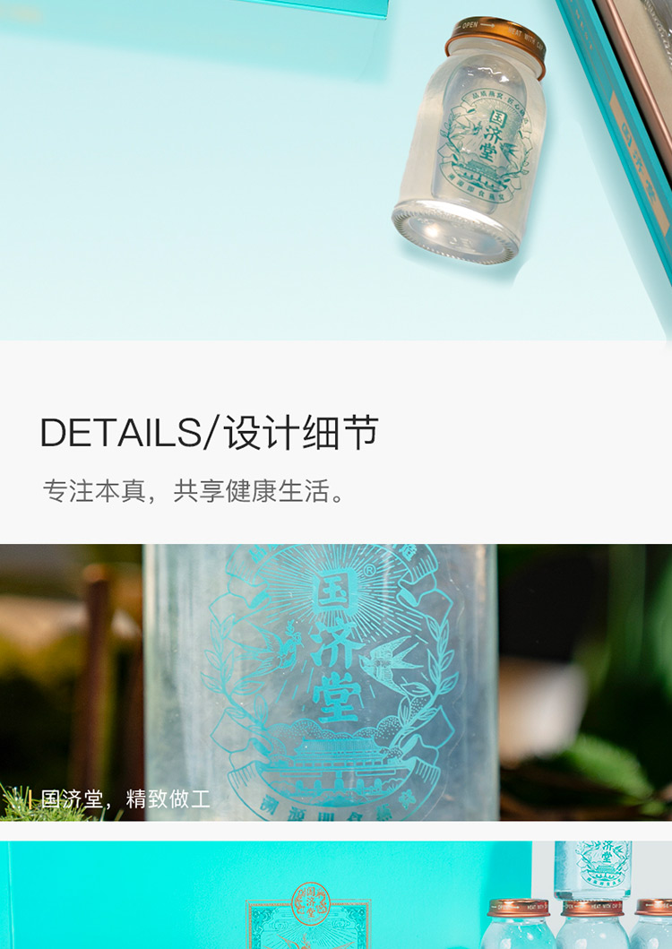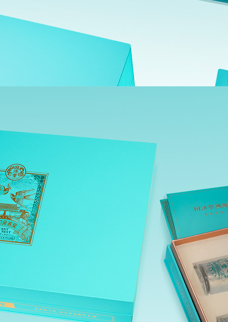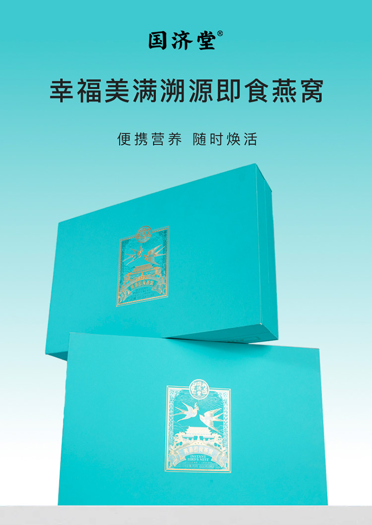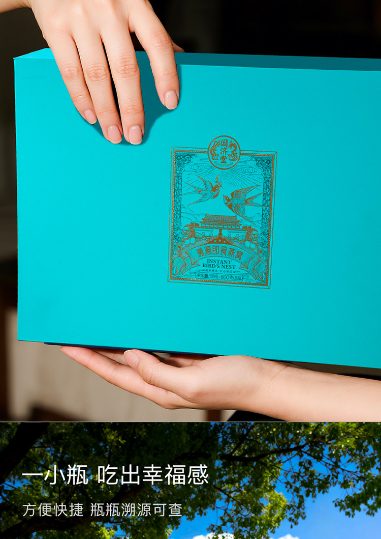 规格:内置8瓶即食燕窝, 75g/瓶,固形物含量≥35%。 配料:水、冰糖、燕窝 采用清新的靛蓝色, 令人耳目一新,包装较新颖。 礼盒设计图案融合国风和欧式风格, 并将国济堂logo融入其中