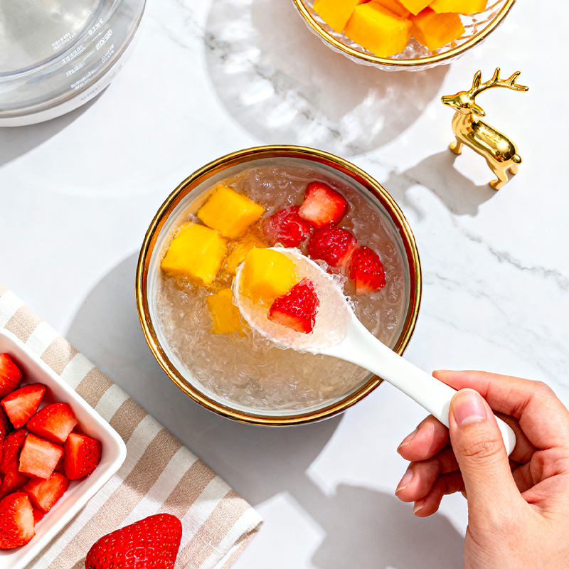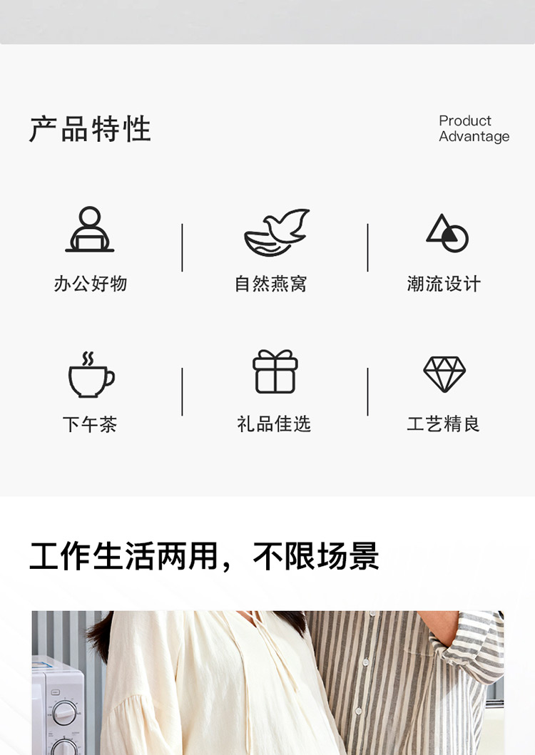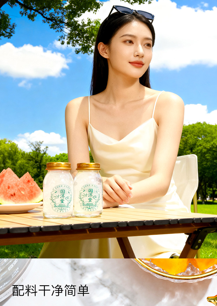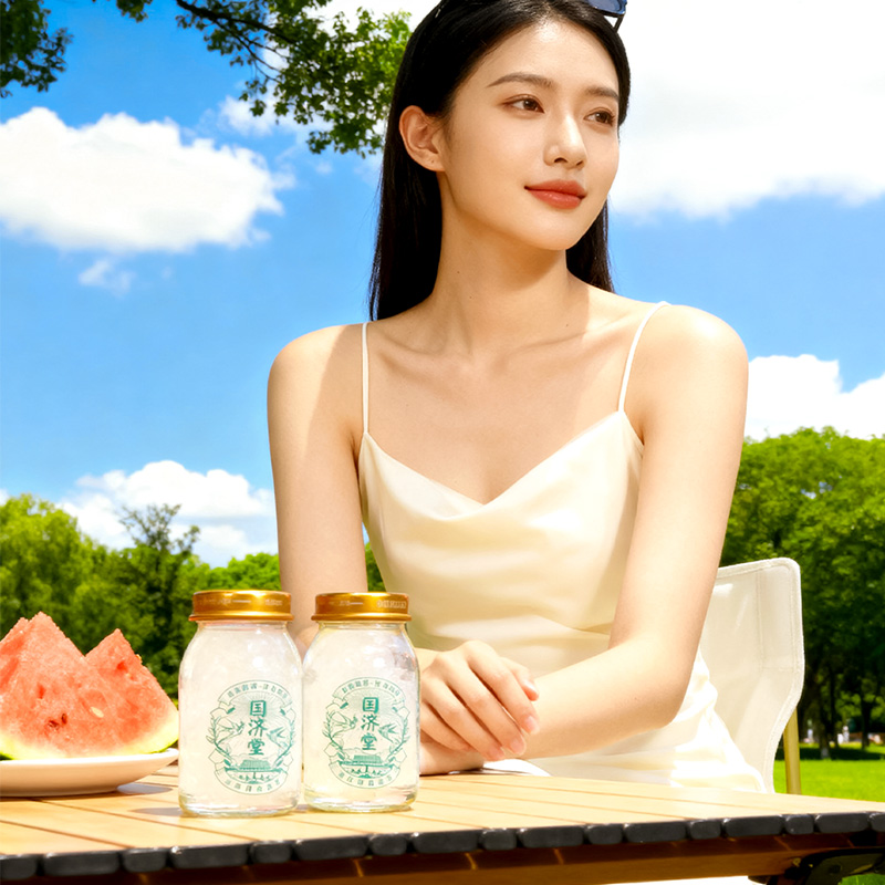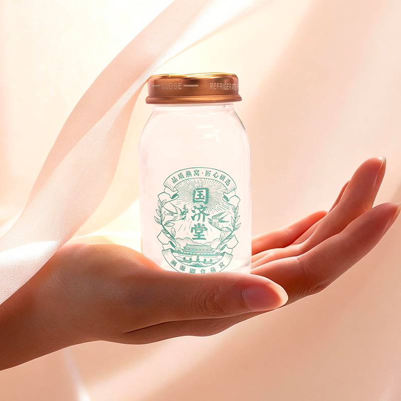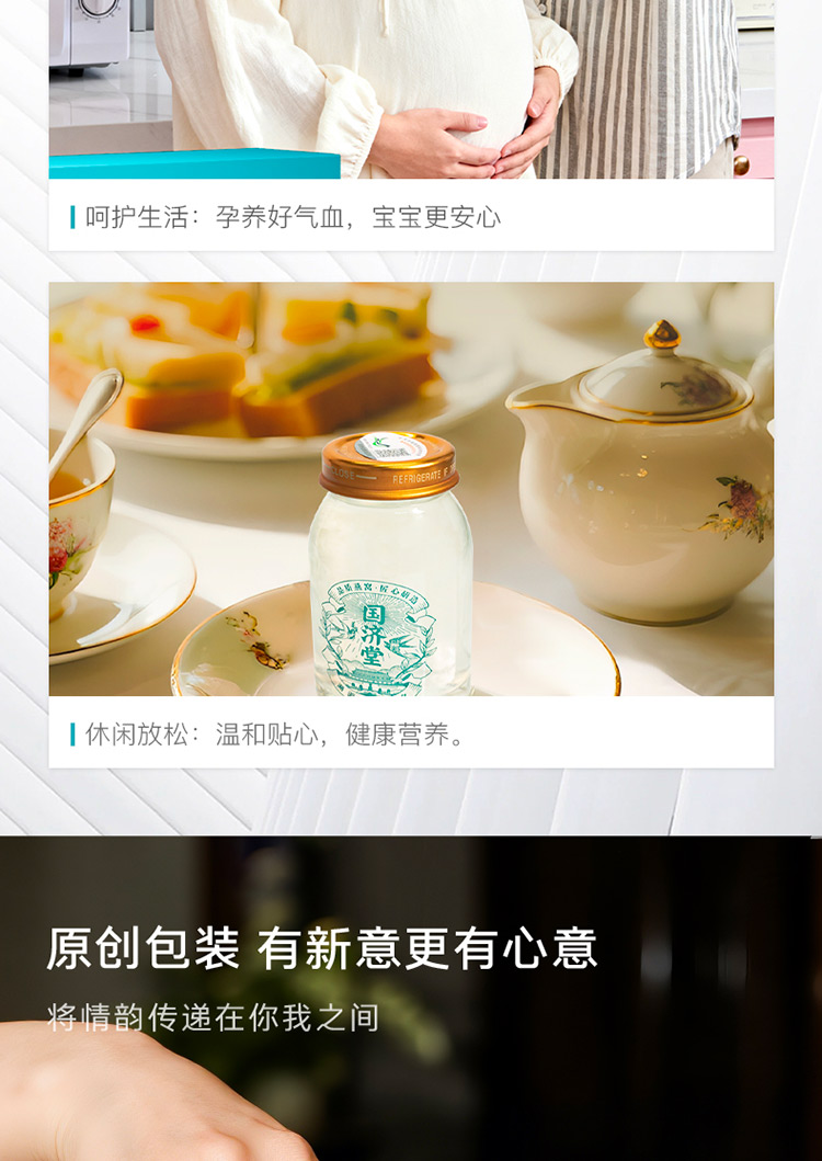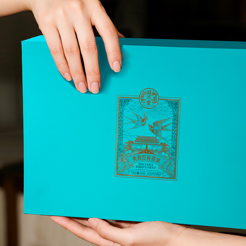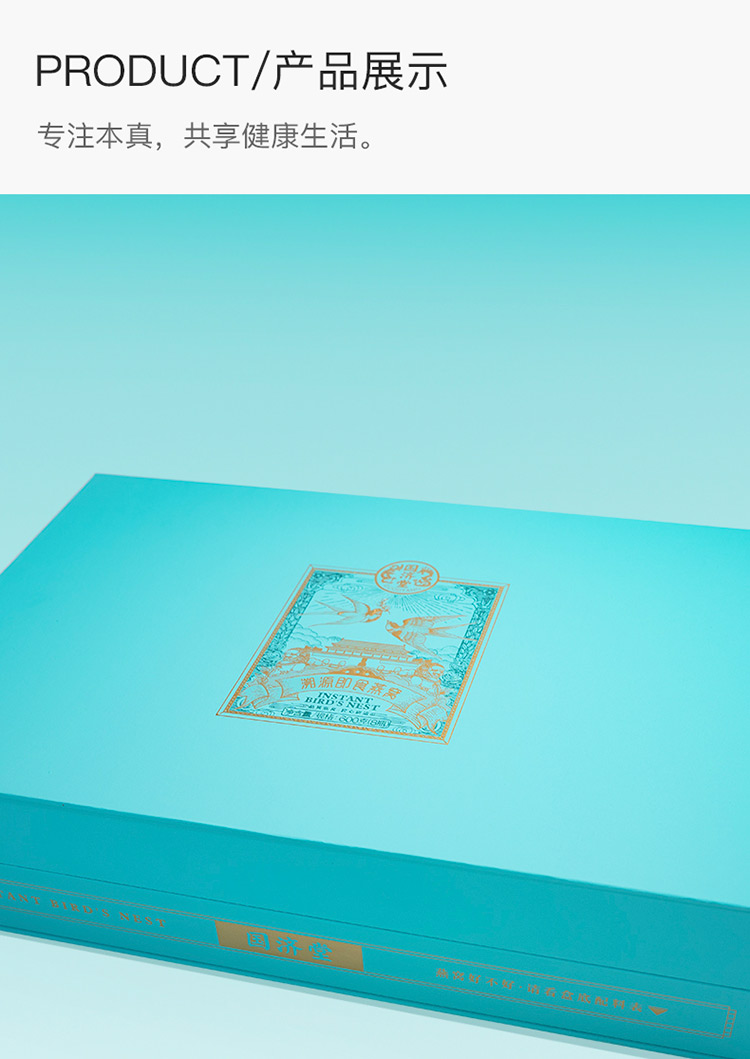 规格:内置8瓶即食燕窝, 75g/瓶,固形物含量≥35%。 配料:水、冰糖、燕窝 采用清新的靛蓝色, 令人耳目一新,包装较新颖。 礼盒设计图案融合国风和欧式风格, 并将国济堂logo融入其中