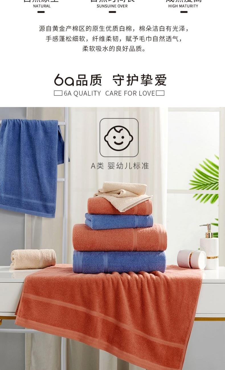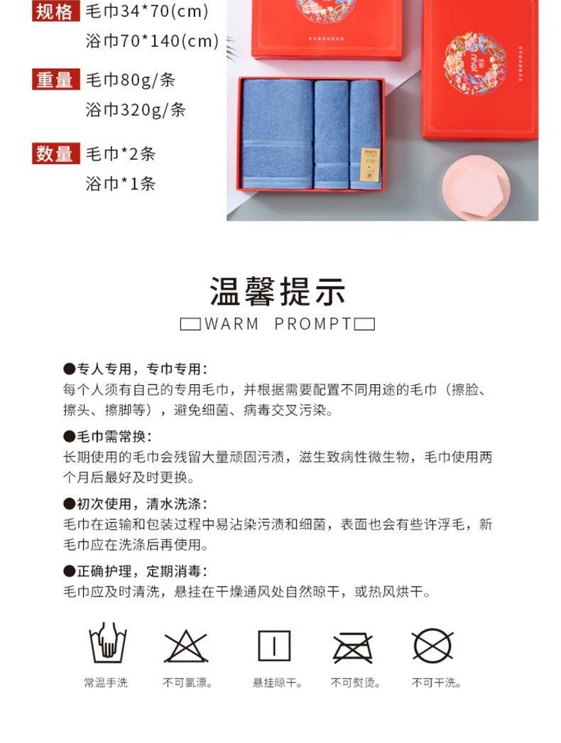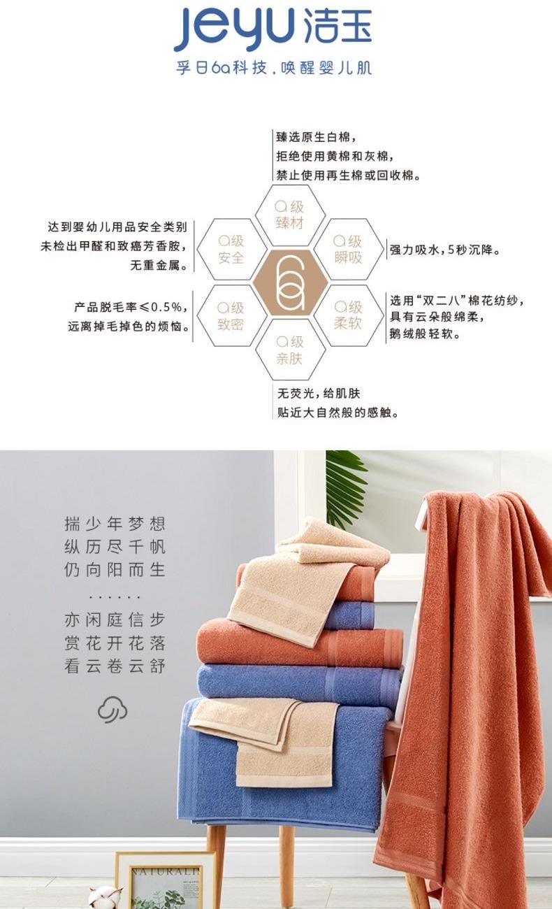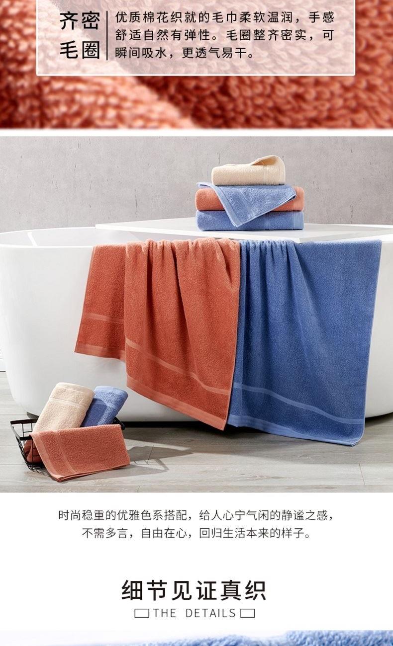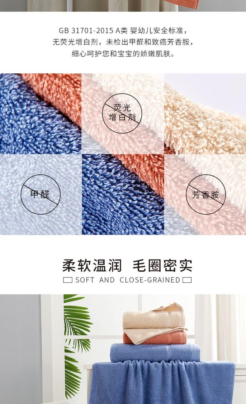 材质:纯棉 规格:34*70(cm)、70*140(cm) 重量:80g、320g 组合:毛巾2条、浴巾1条 1、选用优质纱线,重量轻且柔软,迅速吸水,毛巾轻轻按在肌肤上,无需擦拭,即可吸干水分。 2、缎档简约,呈现出与众不同的素雅之美,巾面色彩柔和、清新