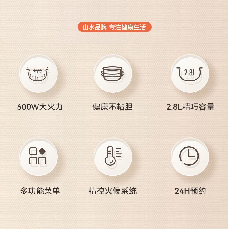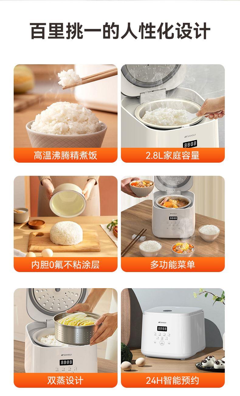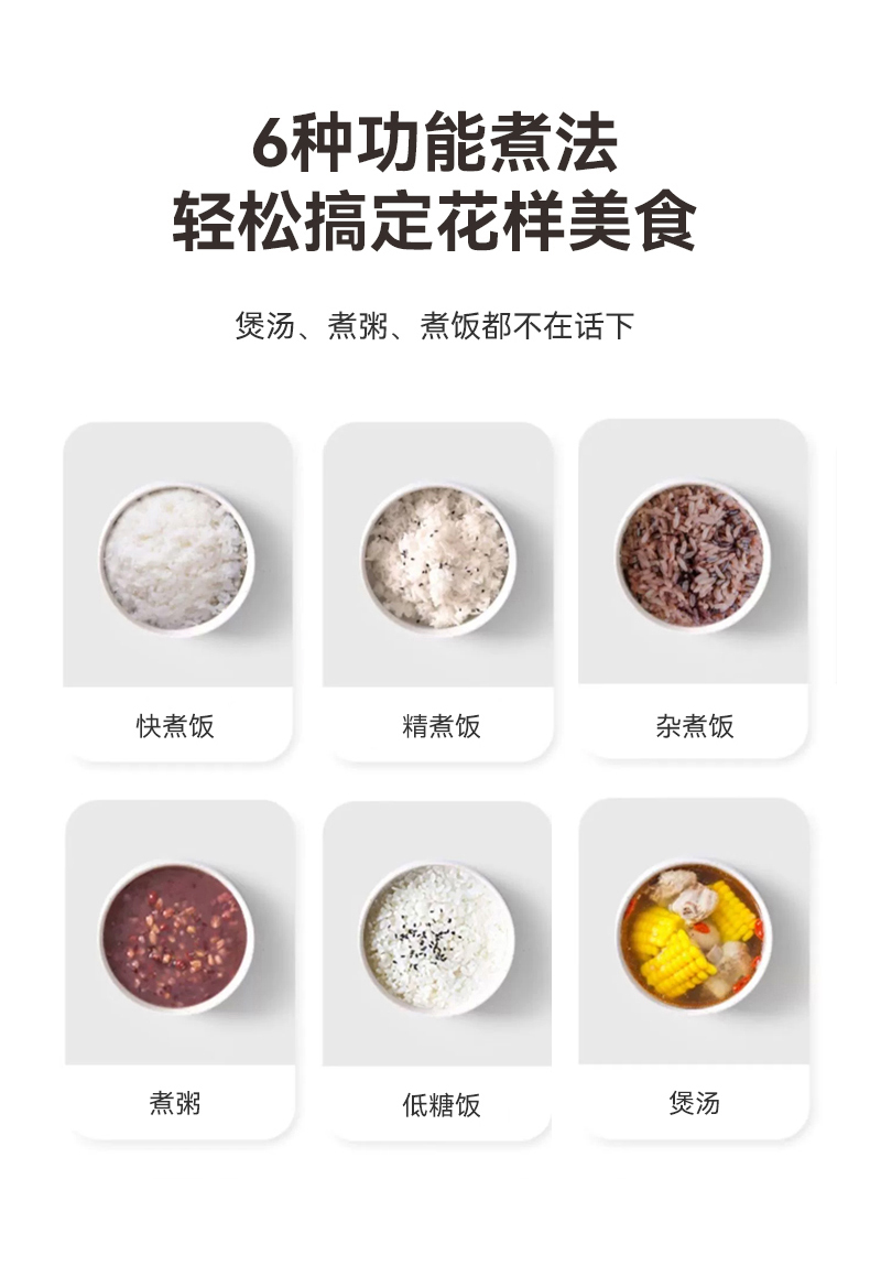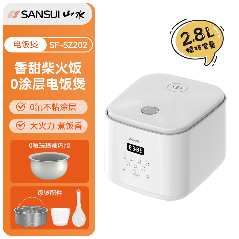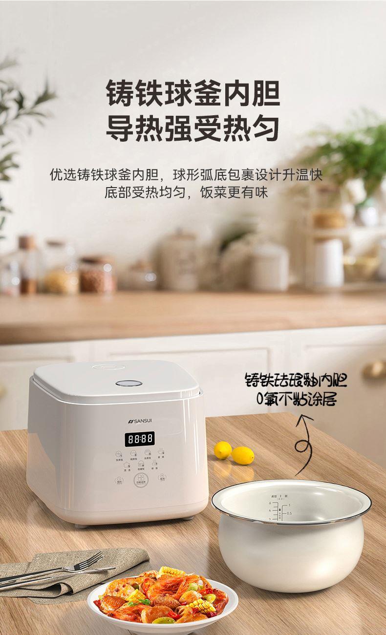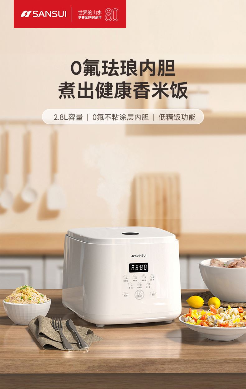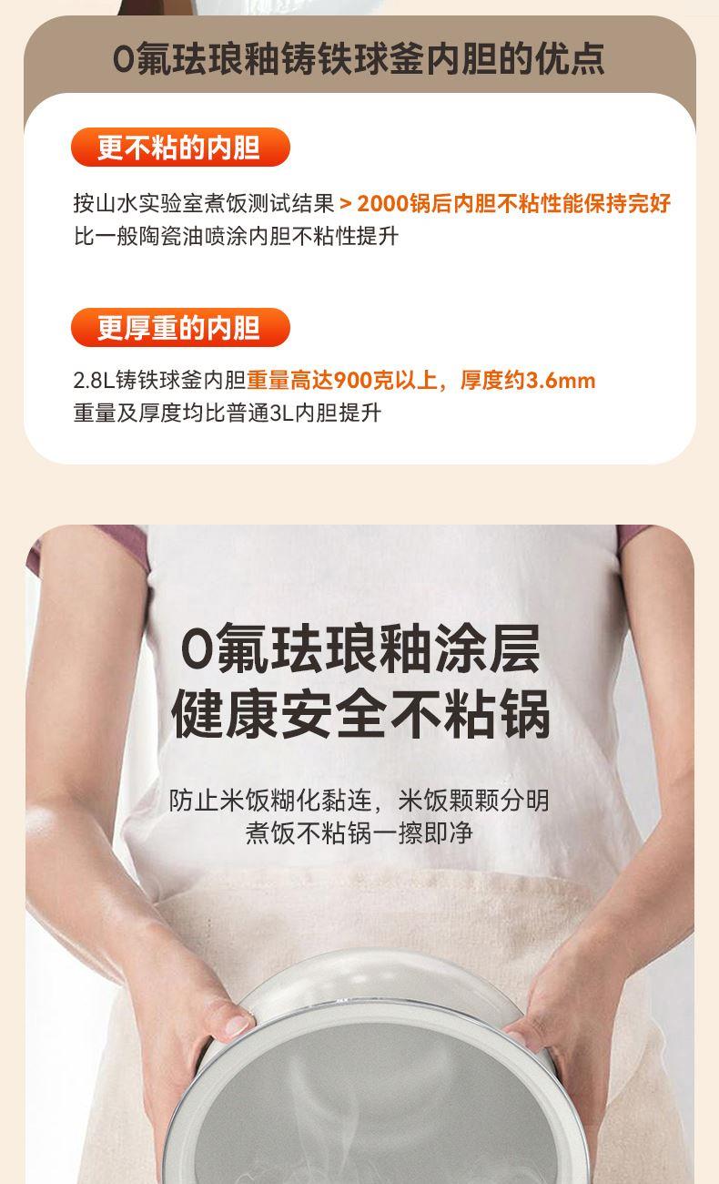 额定功率:600W 额定容量:2.8L 铸铁球釜内胆 0氟珐琅不粘涂层 24小时智能预约、 糖饭功能(配304不锈钢沥水篮) 八大智能菜单 包装方式:彩包+邮购箱