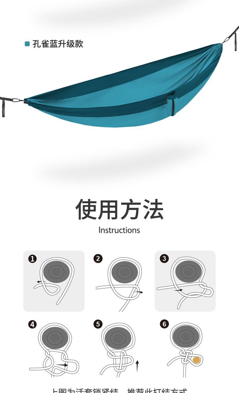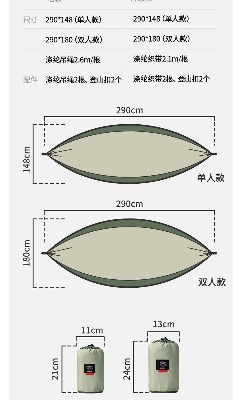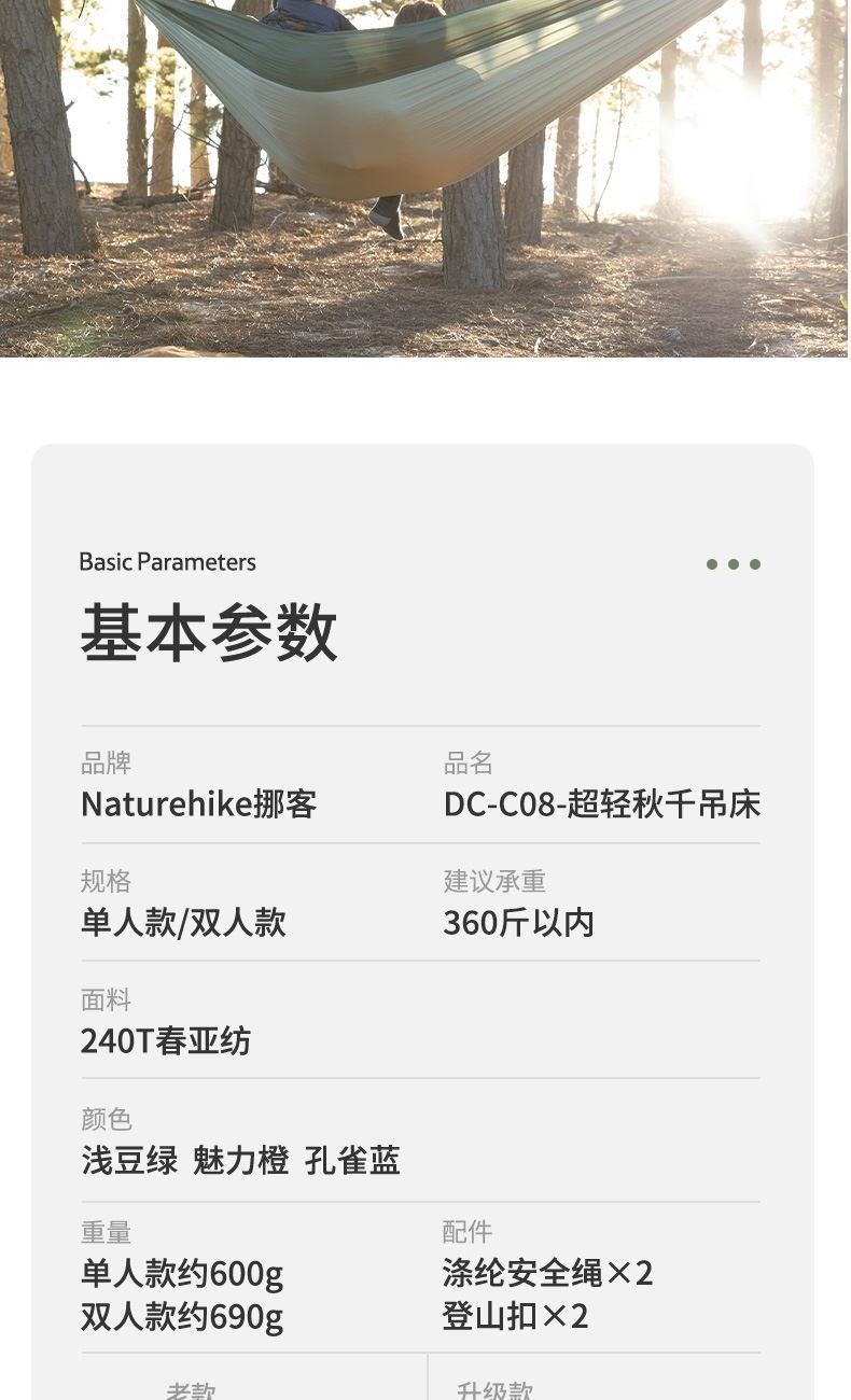 挪客DC-C08-超轻秋千吊床 建议承重:400斤以内 面料:340T春亚纺 颜色:浅豆绿 魅力橙 孔雀蓝 重量:单人约600g双人约690g 升级款 290*148(单人) 290*180(双人) 涤纶织带2.1m/根 涤纶织带2根、登山扣2个