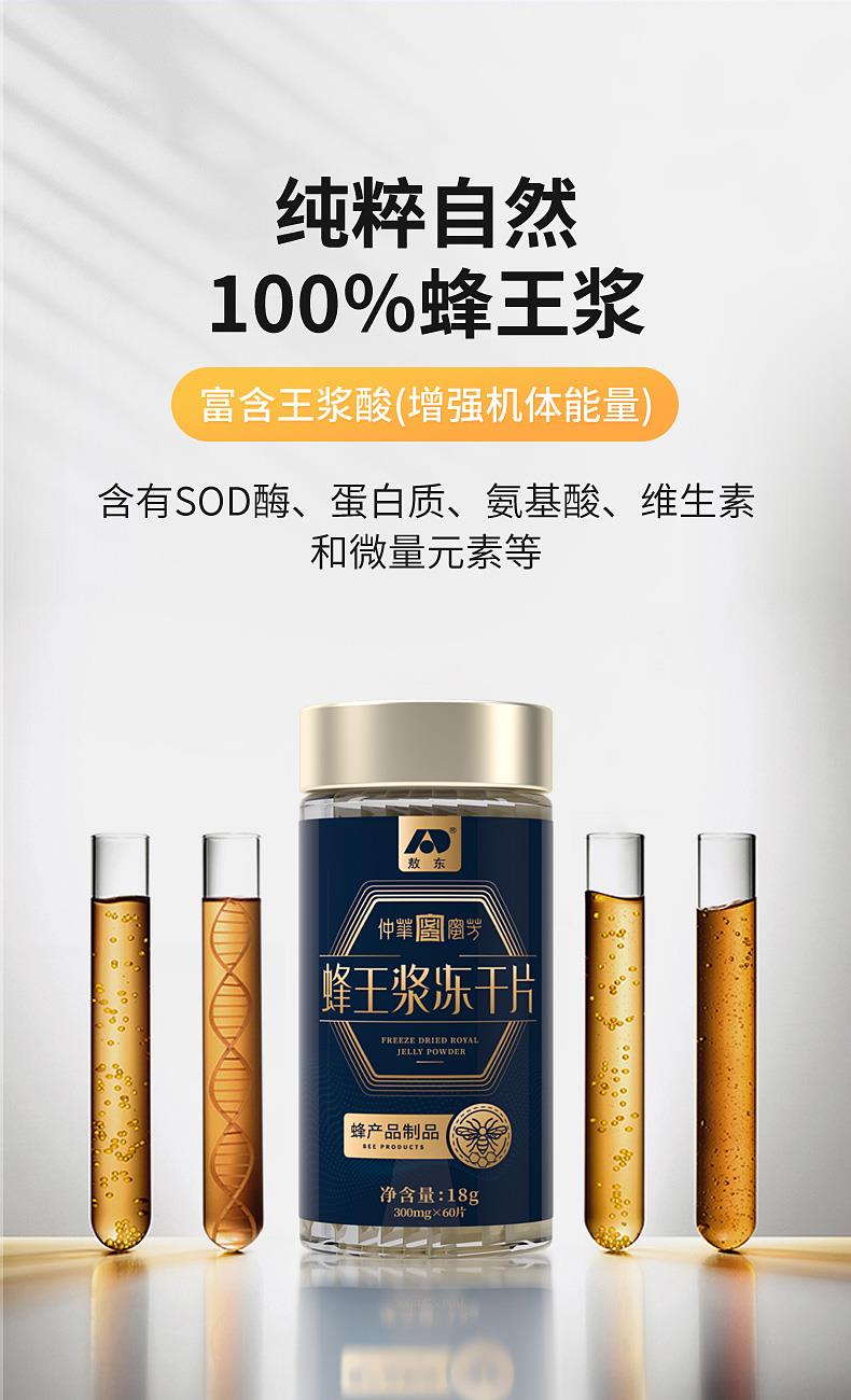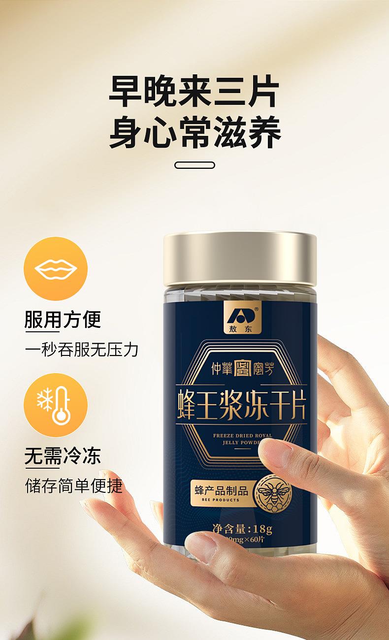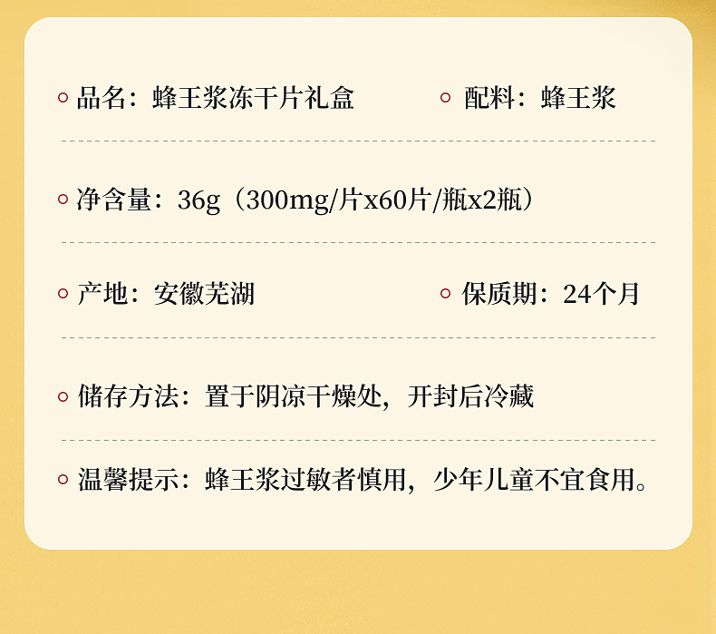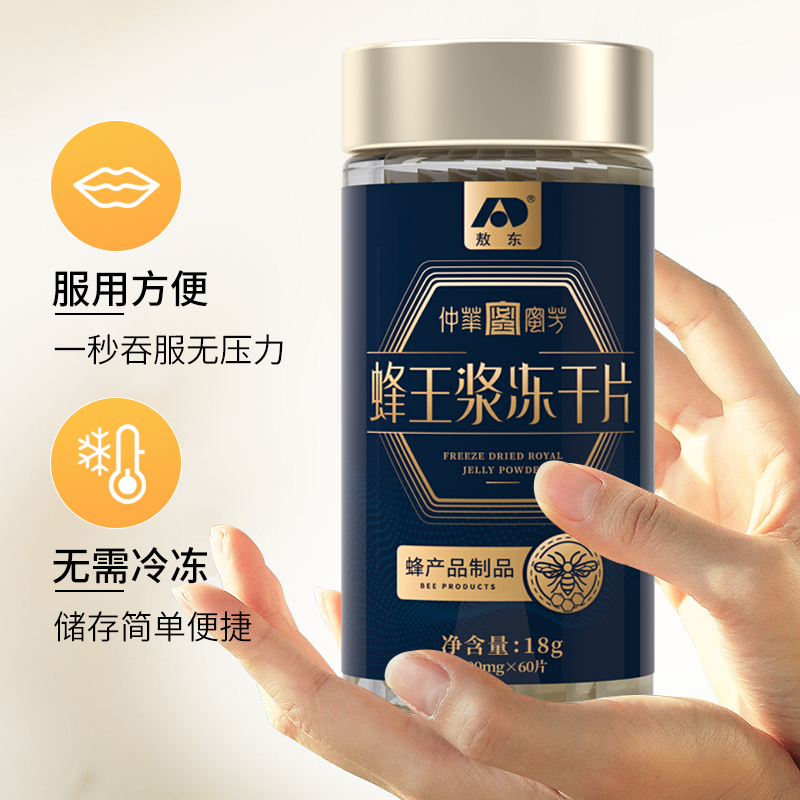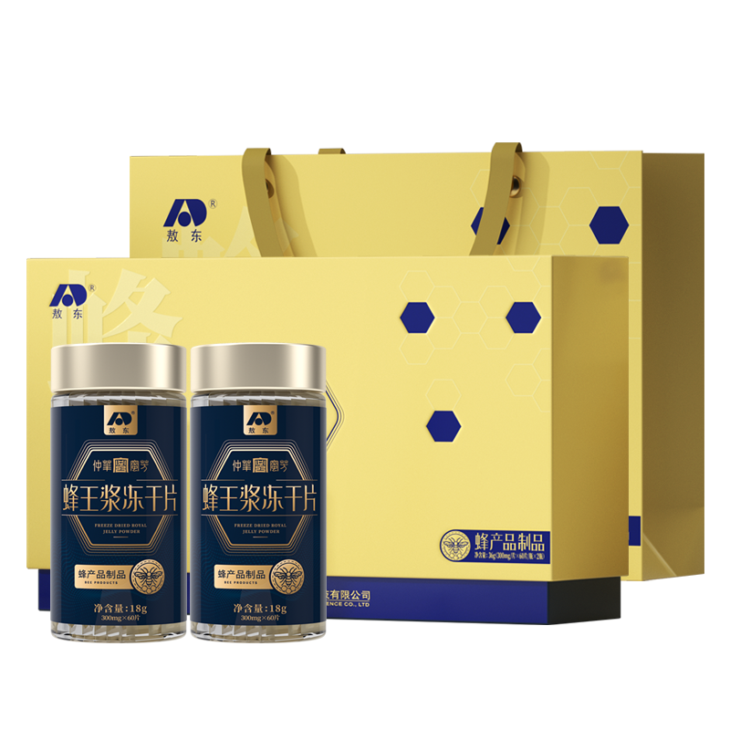 产品:敖东蜂王浆冻干片礼盒 净含量: 36克(300mg/片*60片*2瓶) 真空独立包装,干净卫生,携带方便 外观和口感俱佳,温补 内调 外养 健康好礼,包装非常精美,送给珍视之人