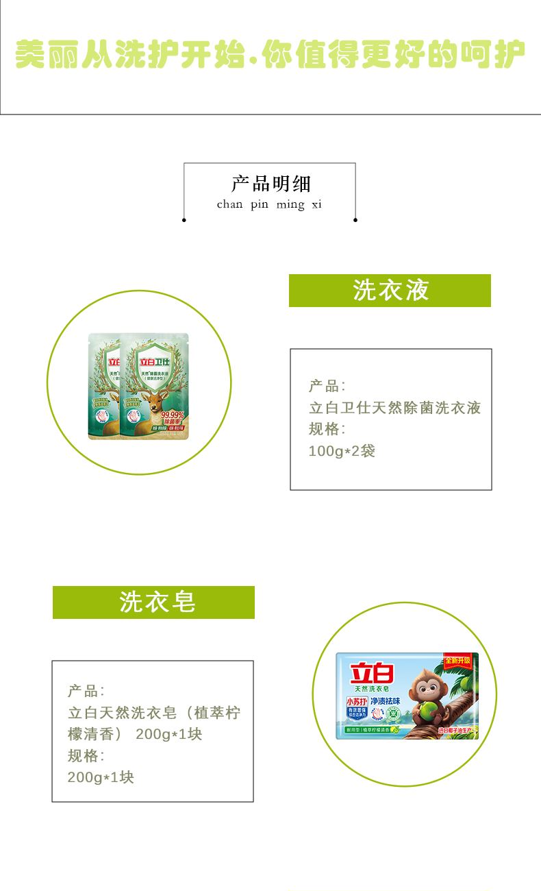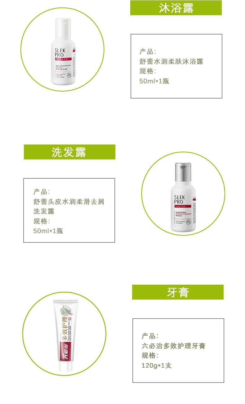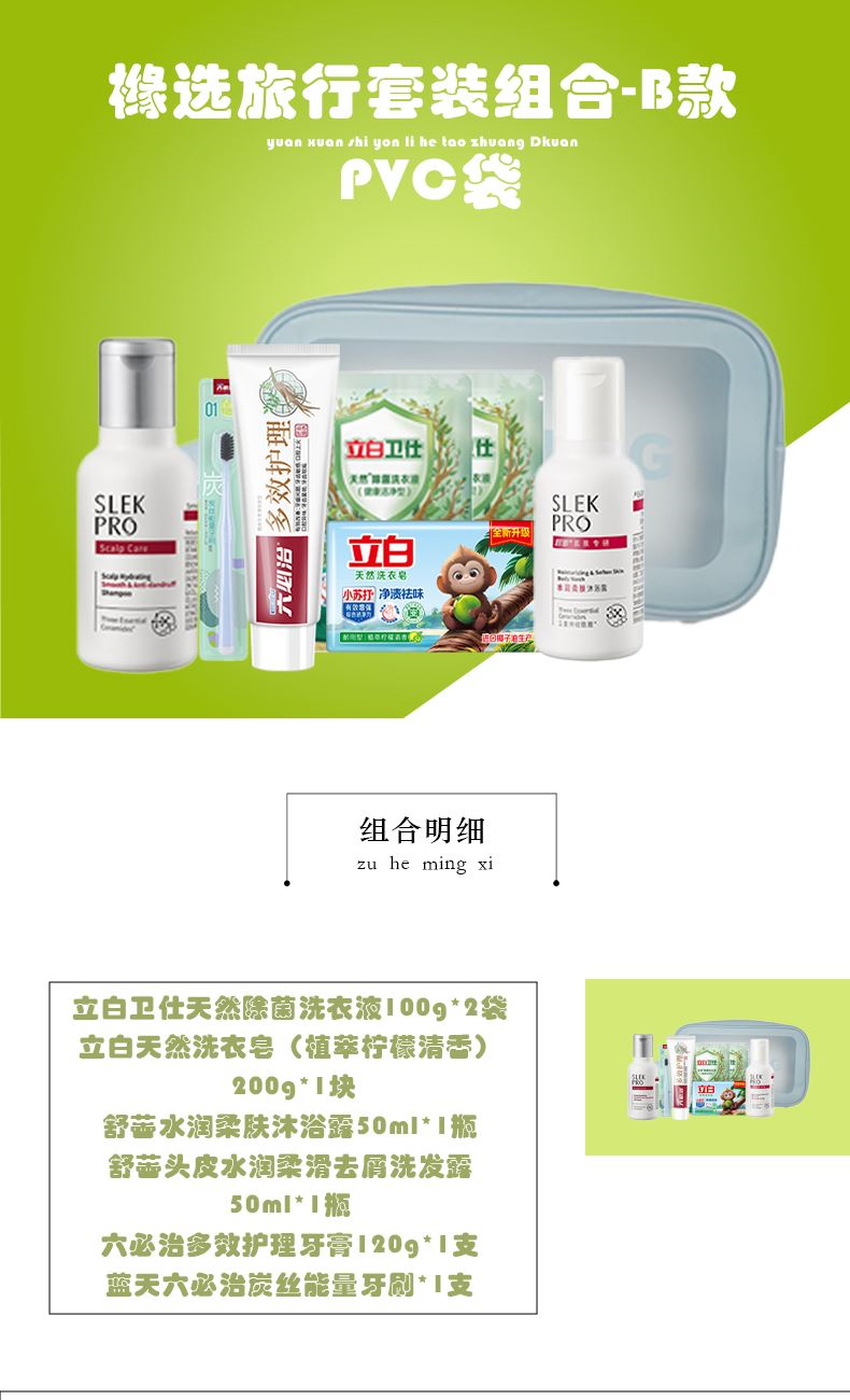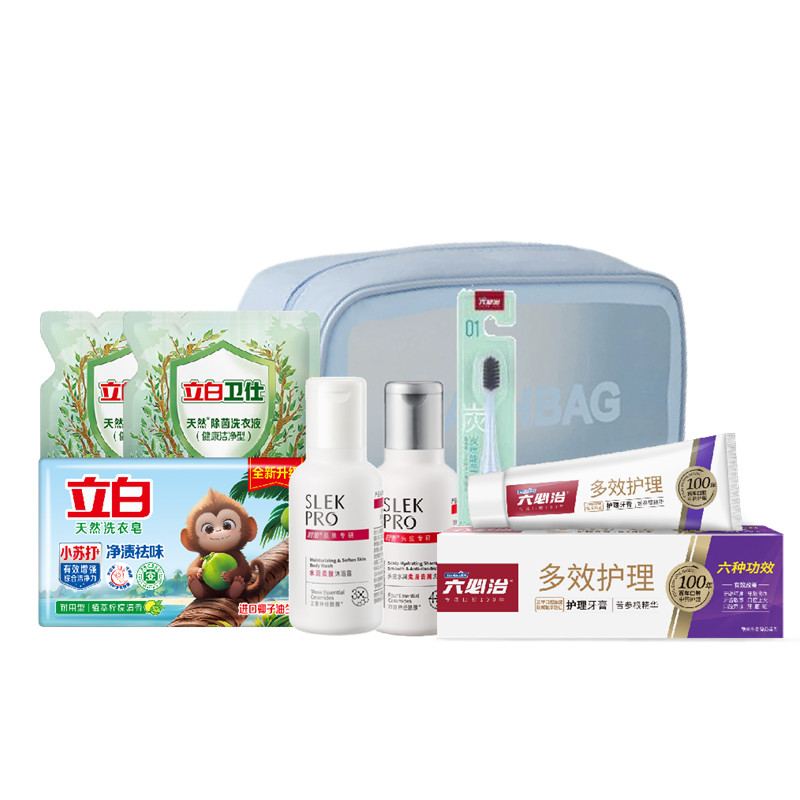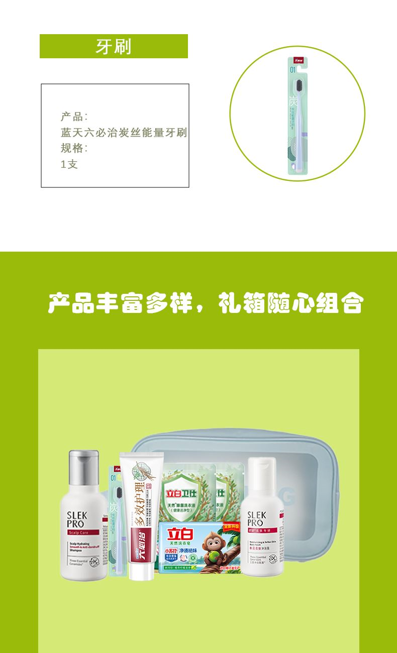 配置: 立白卫仕天然洗衣液100g*2袋 立白天然洗衣皂(植萃柠檬清香) 200g*1块 舒蕾水润柔肤沐浴露50ml*1瓶 舒蕾头皮水润柔滑去屑洗发露50ml*1瓶 六必治多效护理牙膏120g*1支 蓝天六必治炭丝能量牙刷*1支 卖点: 可选产品丰富多样,礼箱随心组合,多种价位因需而定,充分满足各种送礼需求,是商务送礼、单位福利的用心之选。