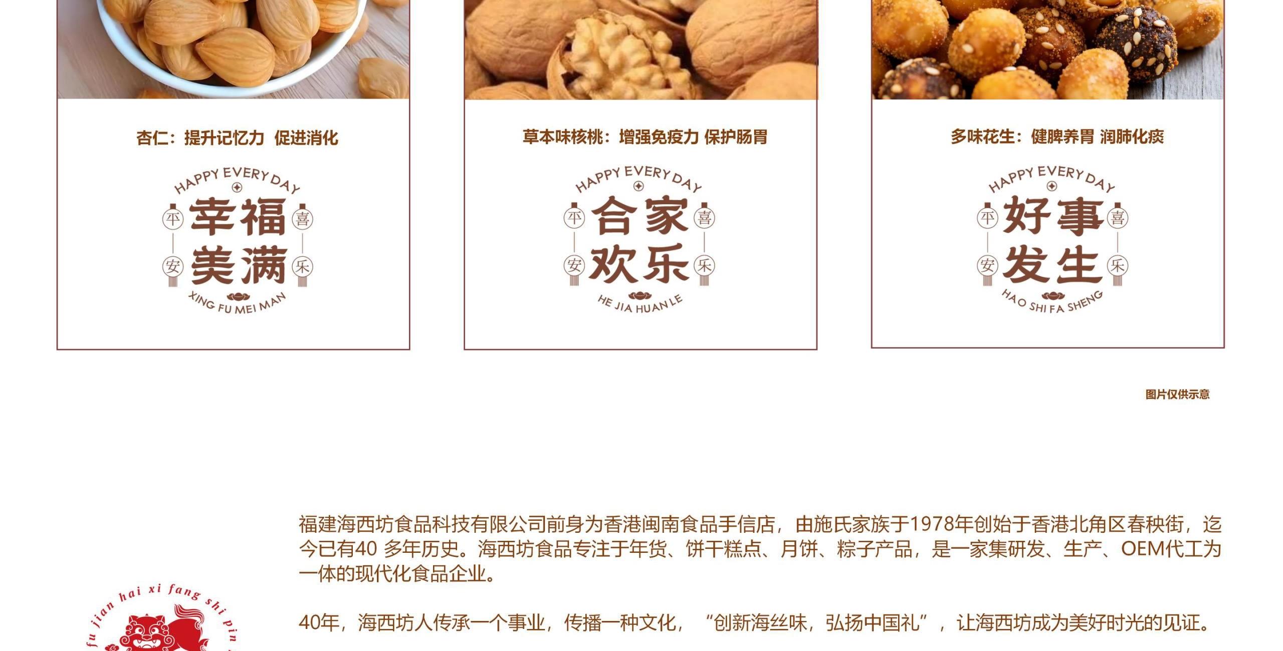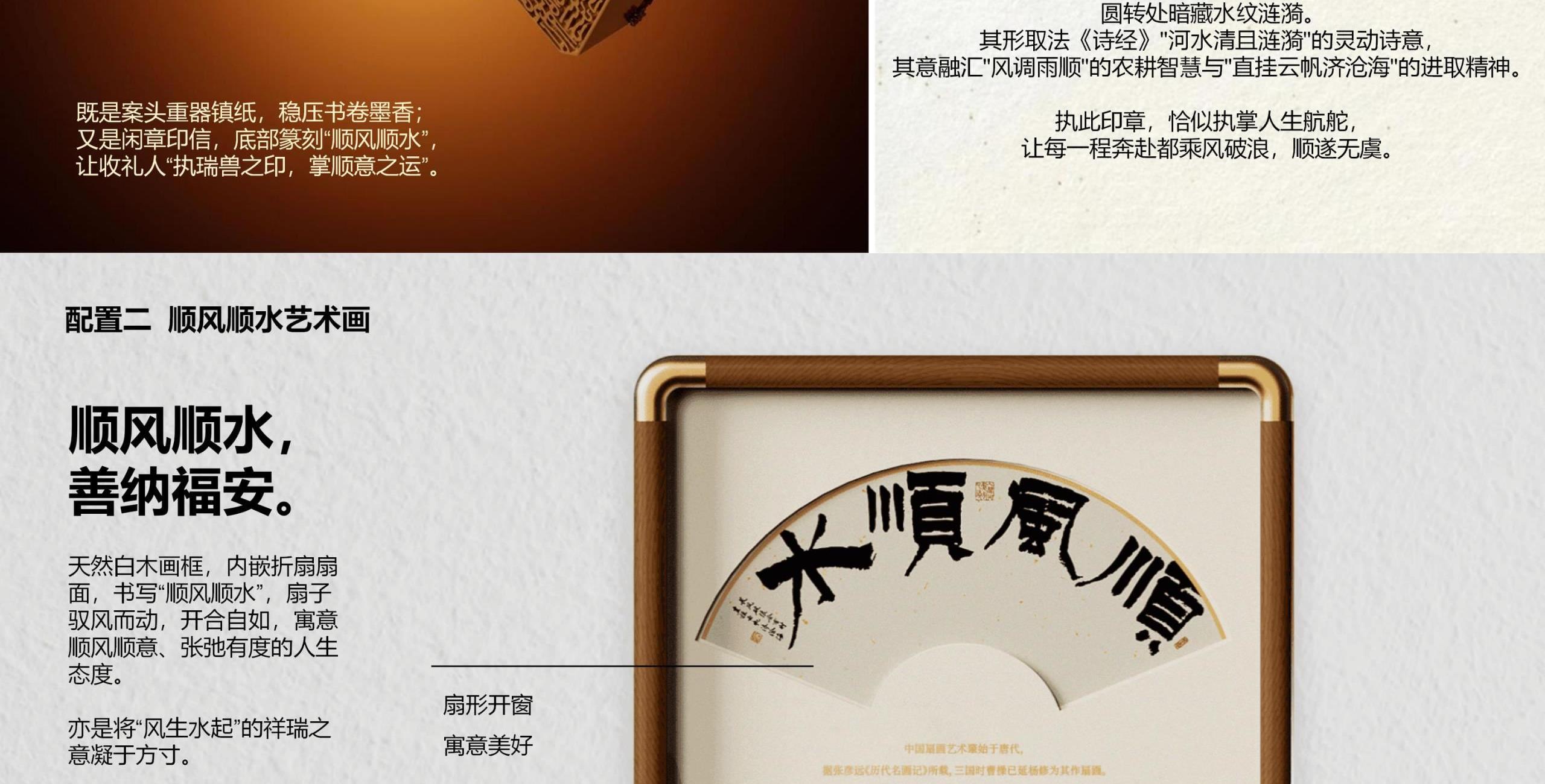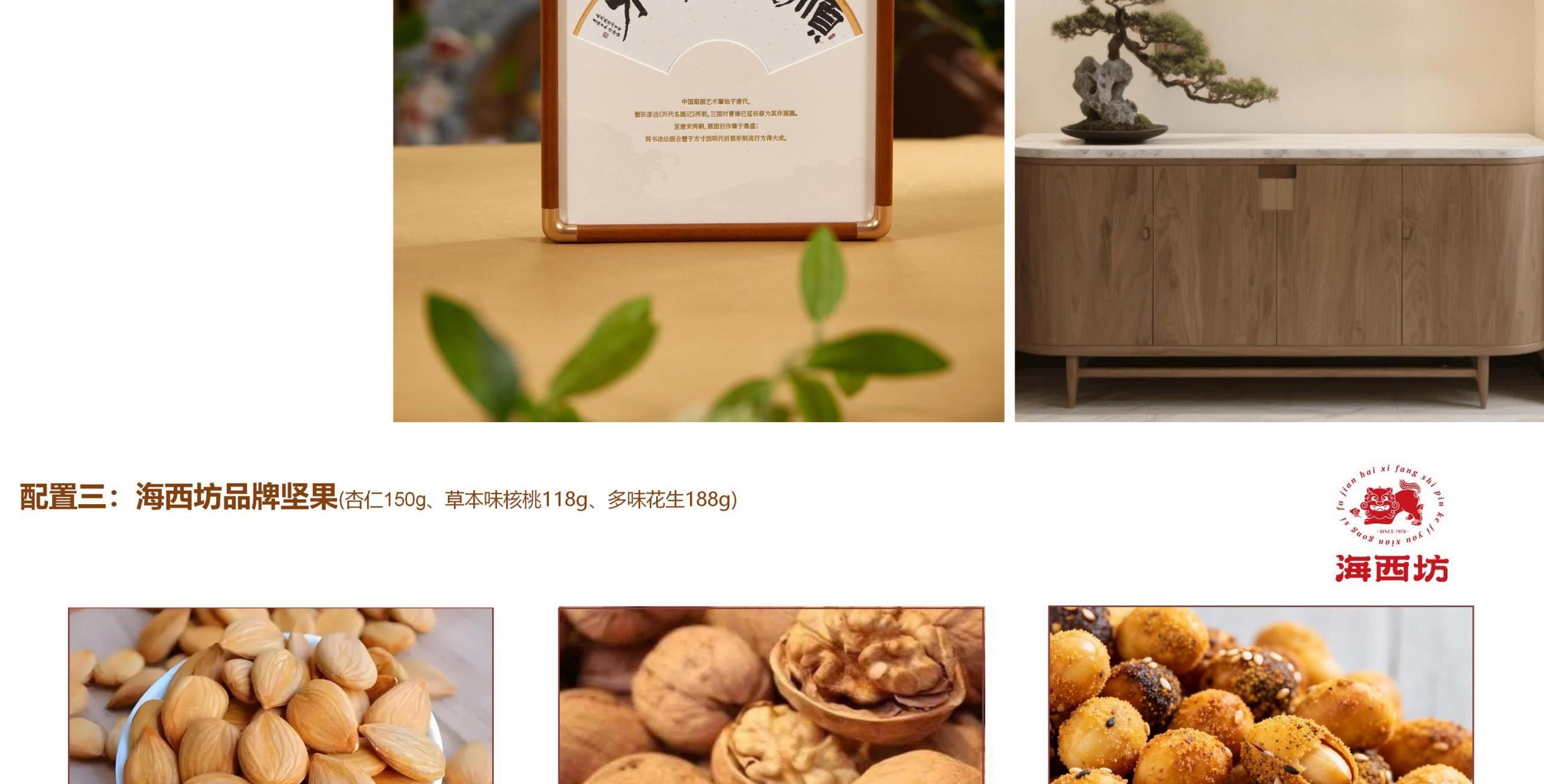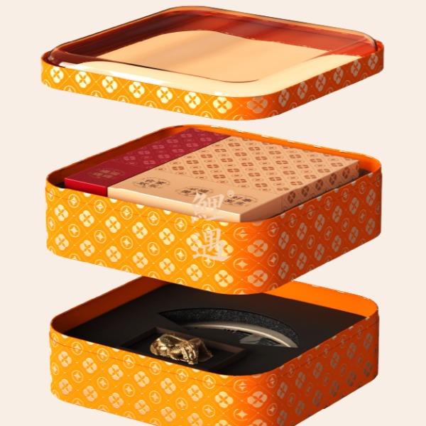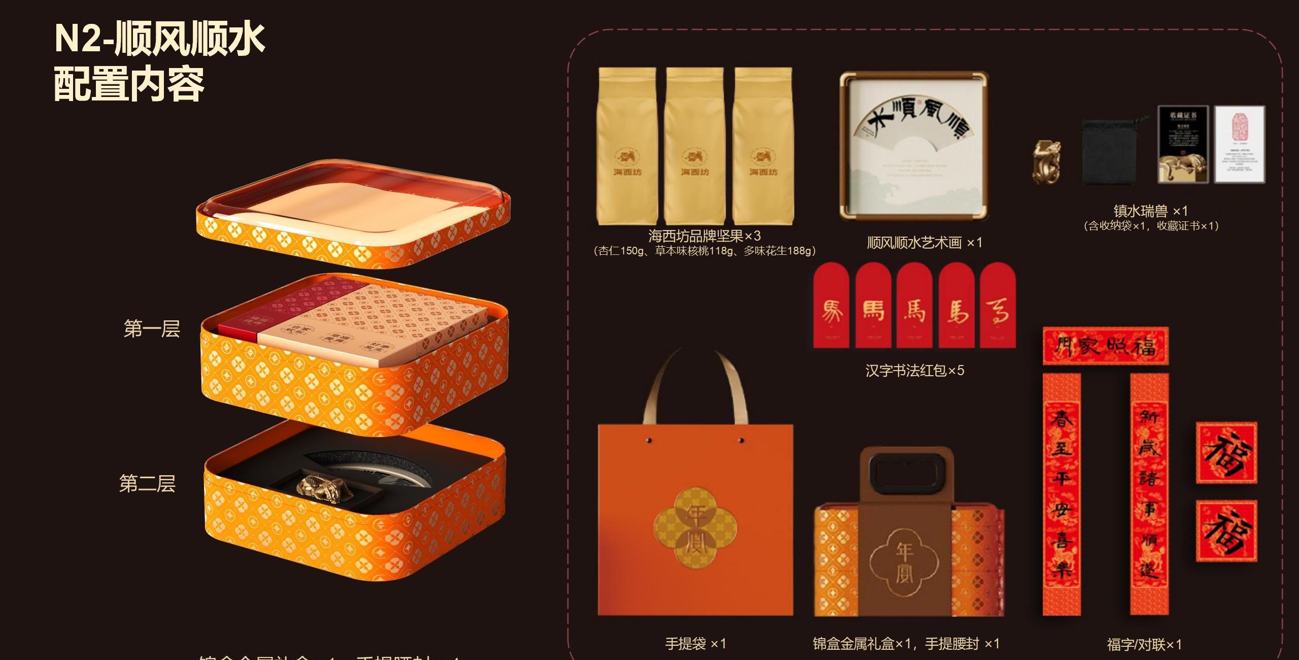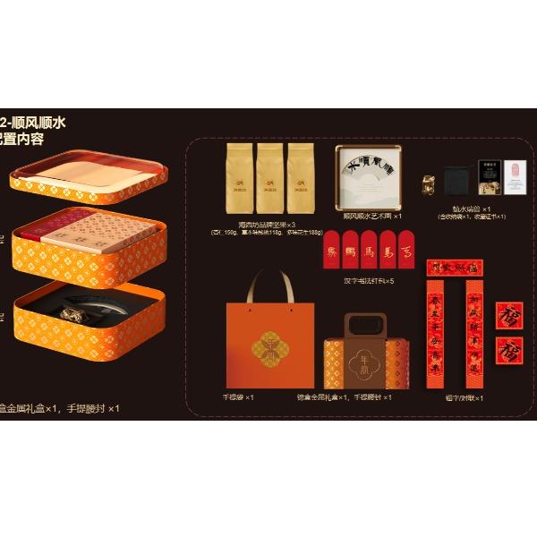 月宴礼盒尺寸:25*25*15.5cm 手提袋尺寸:27.5*27.5*17cm 相框尺寸:20*20*2cm 镇水兽尺寸:6*3*3cm 坚果克重:杏仁150g、核桃118g、多味花生188g 设计理念:《年宴》是一款还原云宫之宴场景的文化礼盒产品。将传统锦盒以现代马口铁+亚克力材质呈现,传统而不失现代感。 选用了铜钱纹、桂花纹、海棠纹,三纹交织。 铜钱纹藏福,桂花纹沁香,海棠纹叠韵。 以素雅宫廷纹样铺陈,重现年宴的千年风雅。 这一盒,盛的是仙家清贵,载的是人间团圆。 邀您细品云宫之宴走出的新年至味。