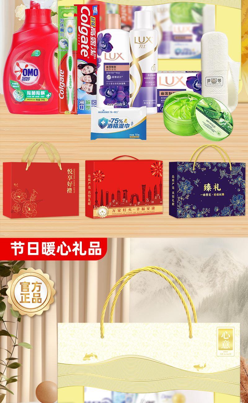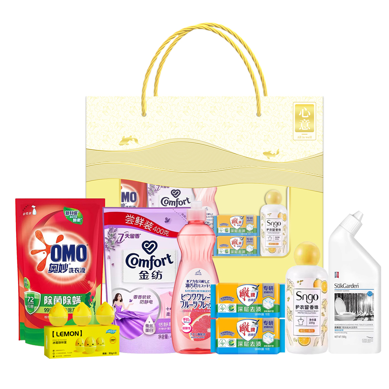 礼盒尺寸:40*13*28cm 包装尺寸:42*80*30cm 产品配置:(香型随机) 奥妙洗衣液480g 金纺柔顺剂400g SNGO留香珠220g 火箭洗洁精600ml 雕牌肥皂102g 雕牌肥皂102g 冰箱除味蛋30g*3/盒 蔬果园洁厕剂500g