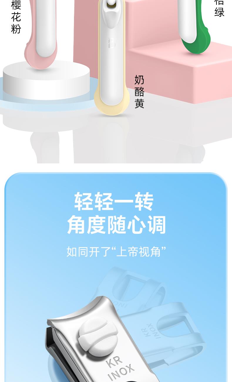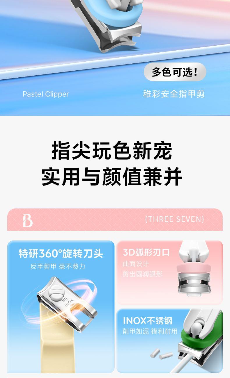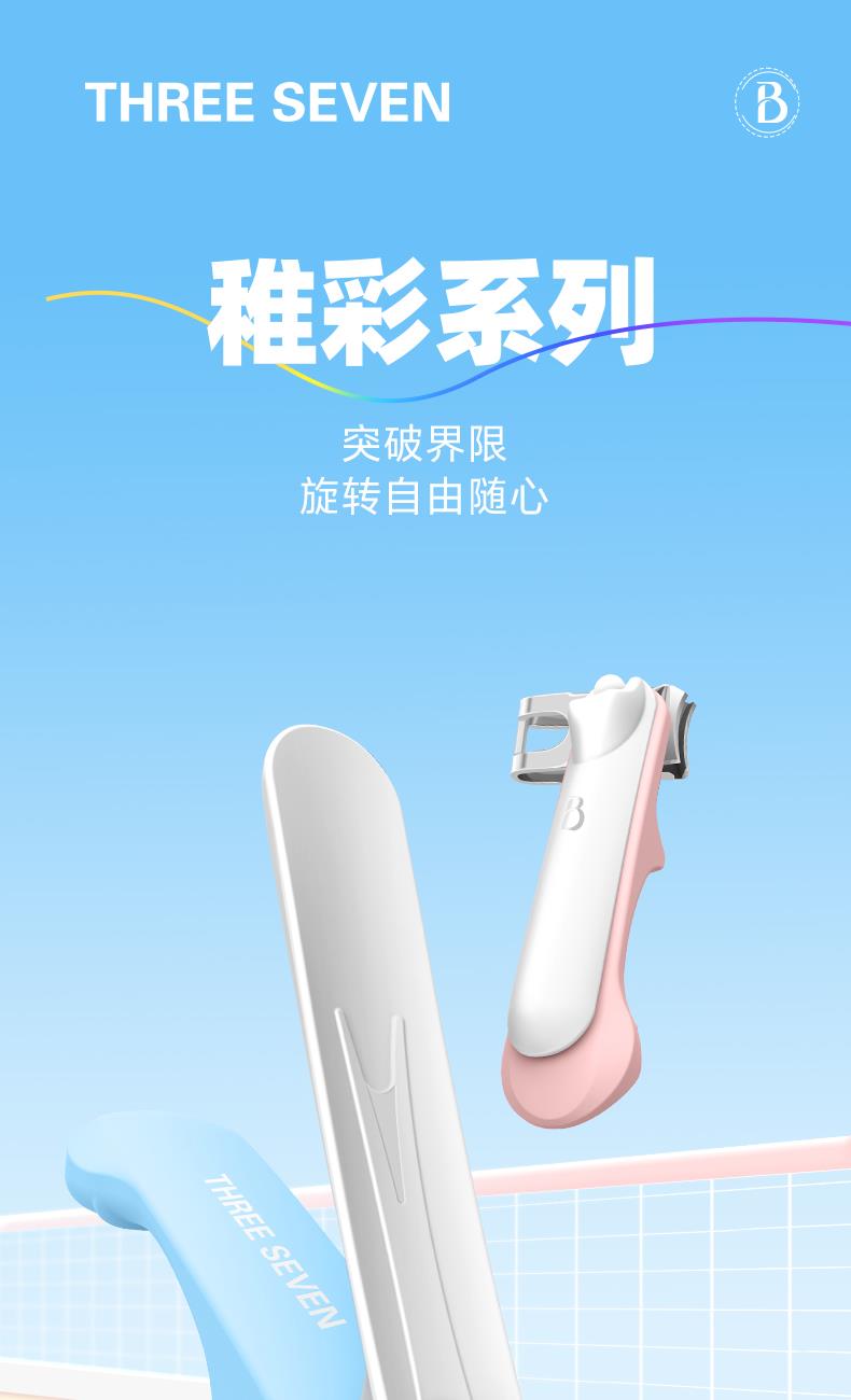 THREE SEVEN/777 360°旋转单个指甲剪塑胶DPL-N701 材质:优质不锈钢/PVC 规格:72.5*19.5mm/约15.9g 产品颜色:粉、米白、蓝 套装内容:单支 产品配件:弧口指甲刀 产品特色:3D弧口刀头,360度可旋转,炫彩指甲刀,小巧一支方便携带收纳