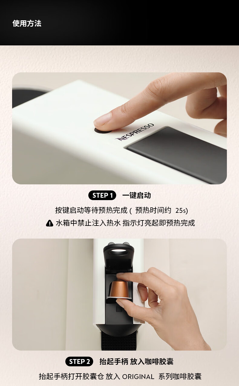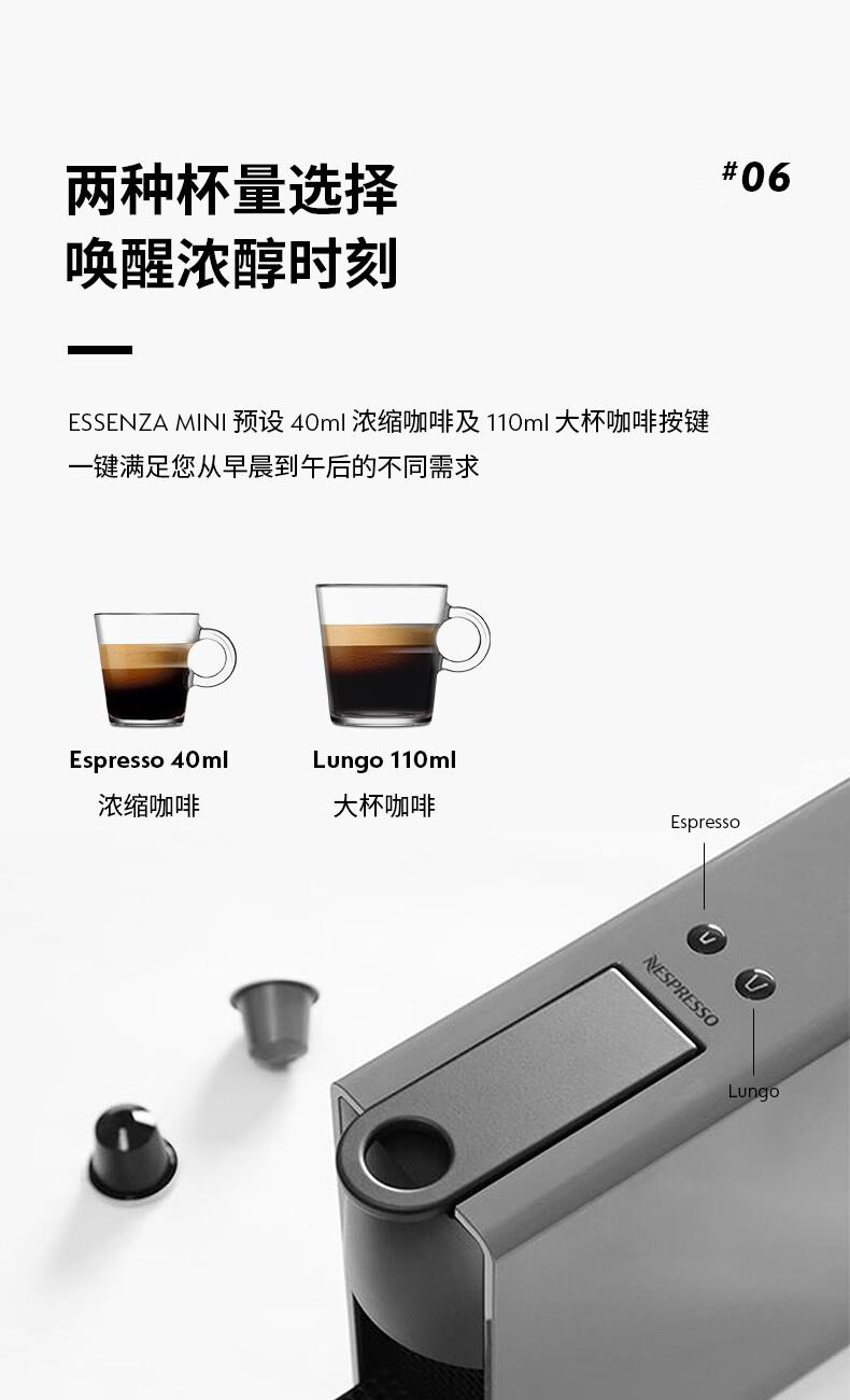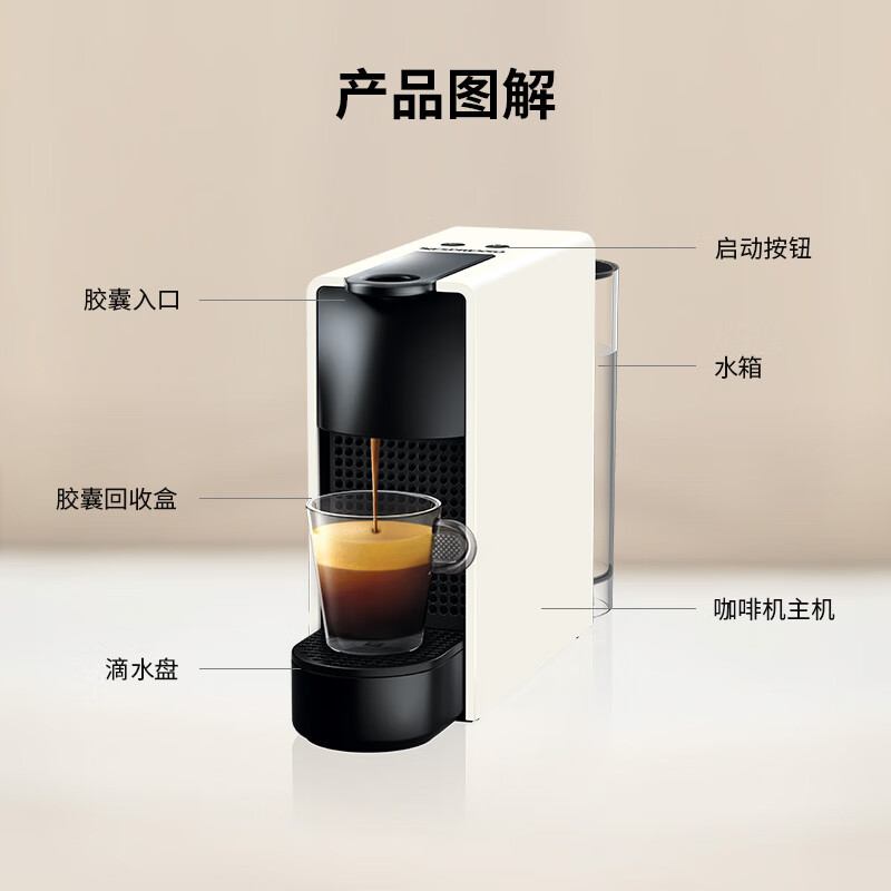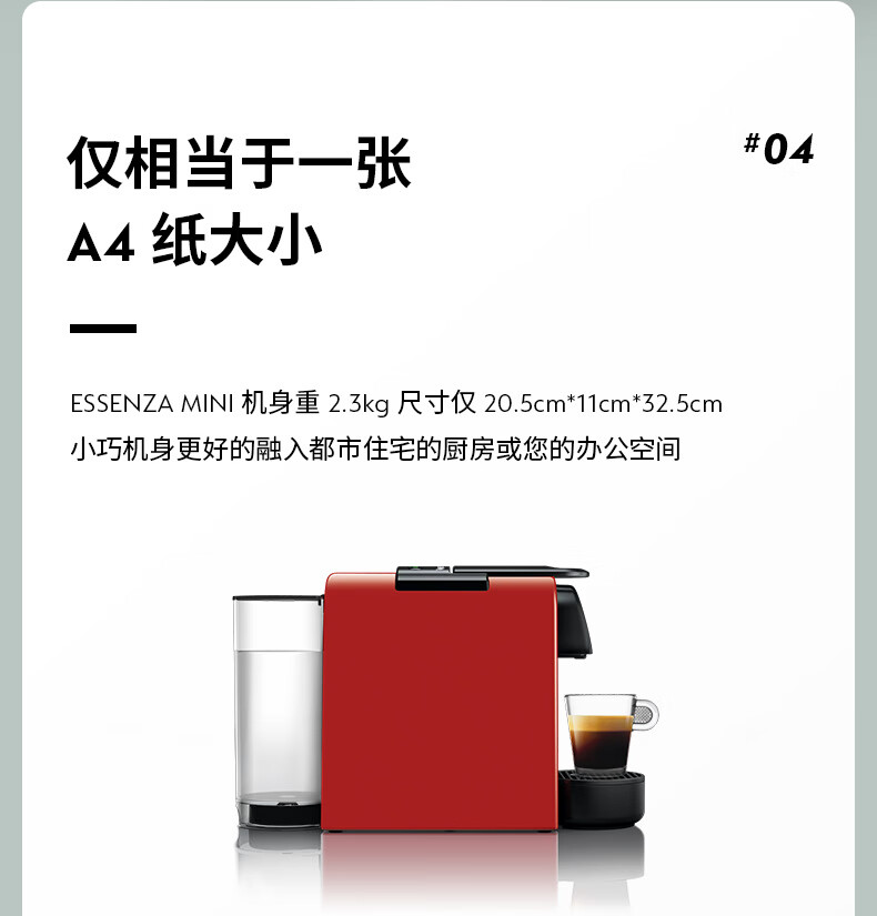 认证型号:C30 电源线长:0.78m 额定电压:220V 额定功率:1200W 产品尺寸:长330mm 宽84mm 高204mm 水箱容量:0.6-1.29L 制作口味:卡布奇诺 拿铁 意式浓缩 稳定高压萃取技术,充分释放香气;尺寸精巧体验不容妥协;汇集了 NESPRESSO的专业萃取技术能够完整释放每一杯咖啡的芬芳以及浓醇