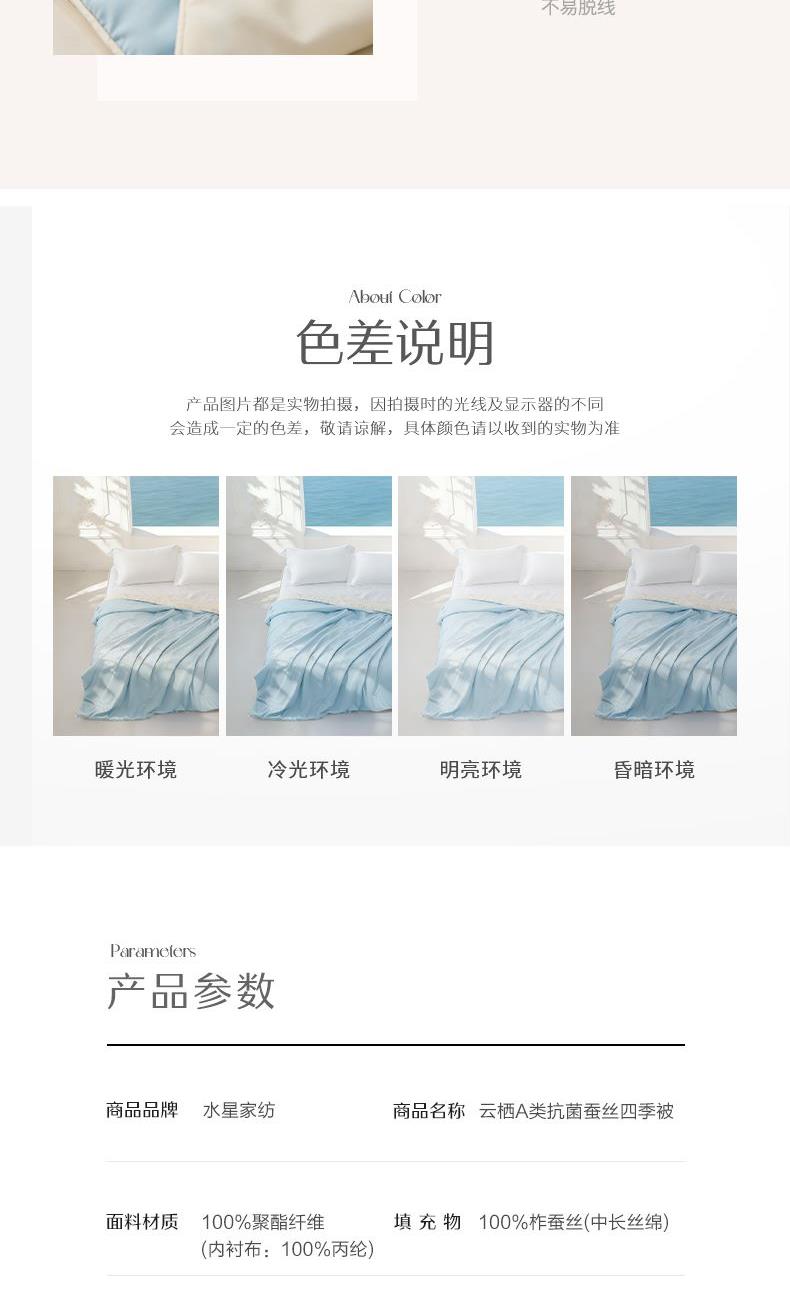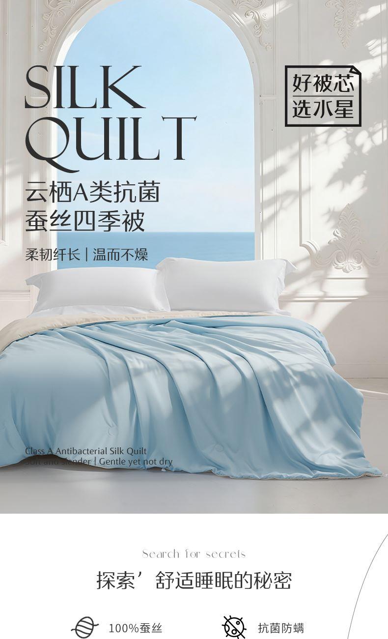 1.【A类安全标准】 A类安全标准,守护睡眠健康。 2.【柞蚕丝填充,自然有机,健康舒适】 柞蚕丝填充,轻盈透气、调温保暖。 3.【品质面料,柔软透气更亲肤】 高品质面料,触感柔软细腻,亲肤透气 4.【水星防螨科技,抑制细菌螨虫,健康舒适】 水星科技防螨,守护睡眠健康。