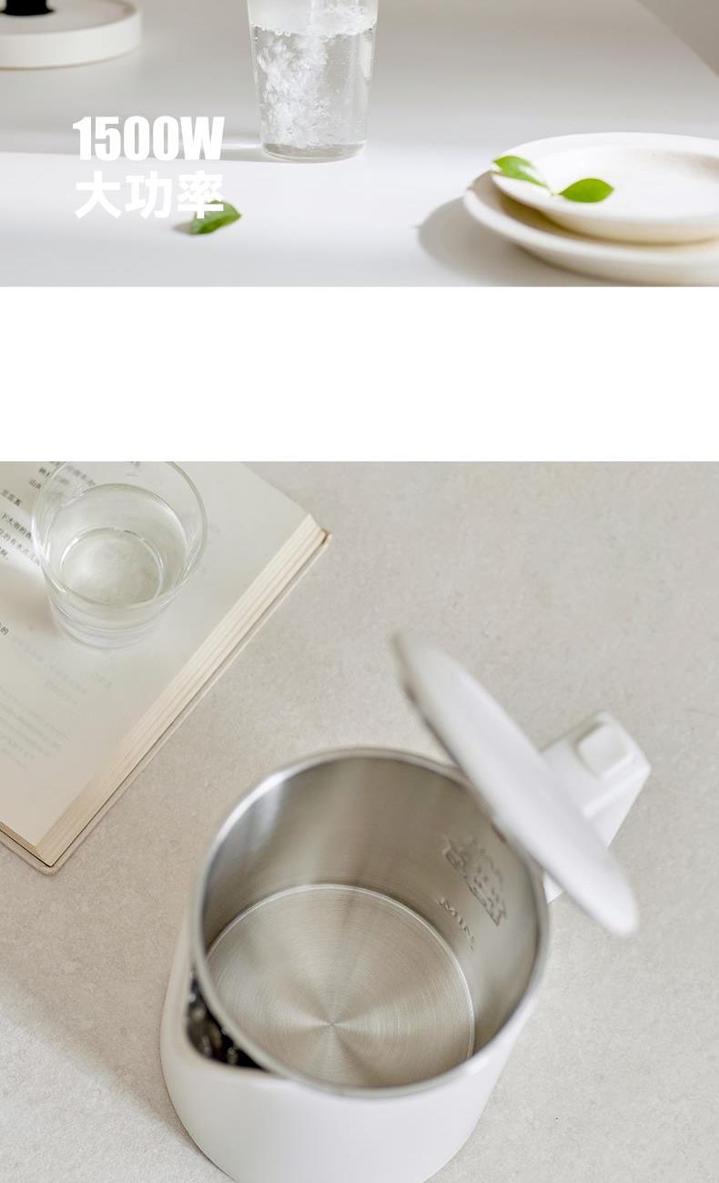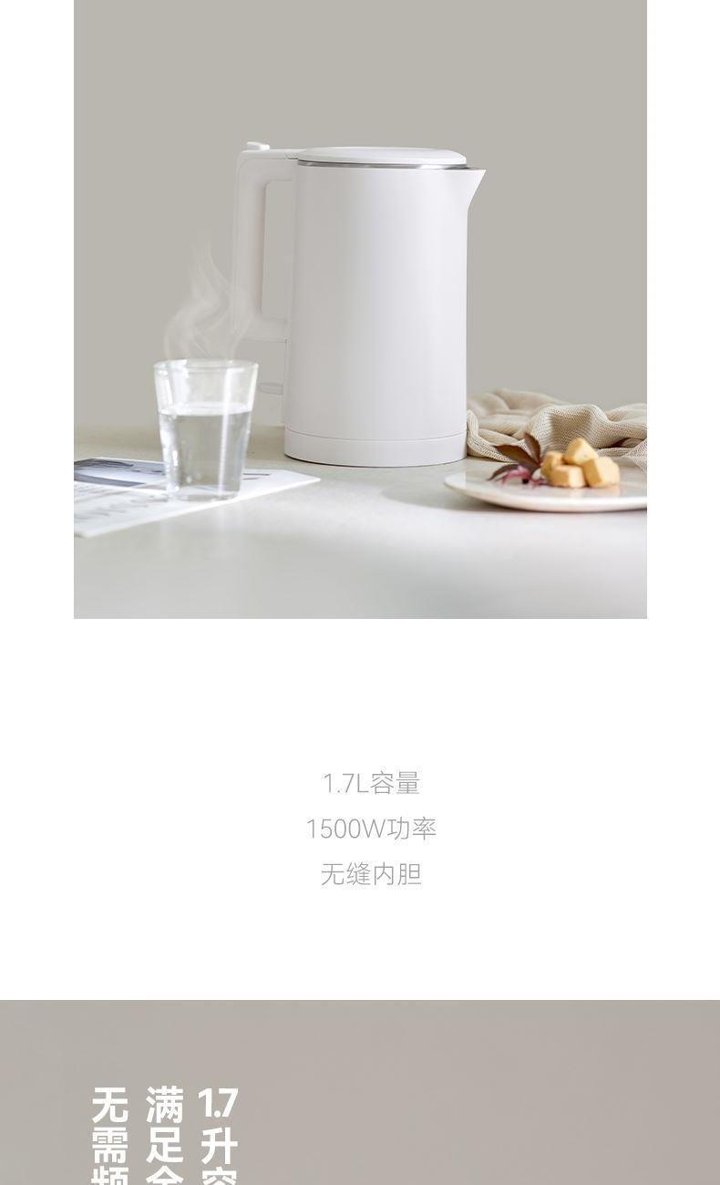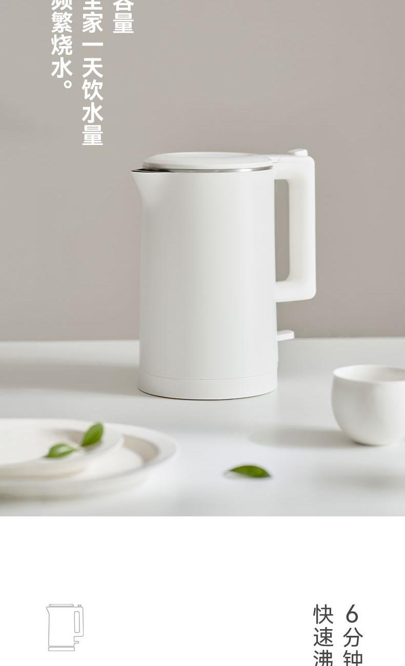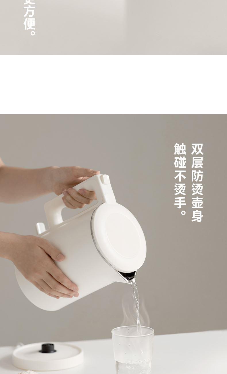 颜色:陶白色 容量:1.7L 额定功率:1500W 净重/毛重:1.3kg/1.58kg 产品尺寸:220*150*250mm 包装尺寸:207*207*320mm 条码 : 6941927410203 1. 1.7升容量,满足全天饮水量 2. 6分钟烧水时间 3. 通电即保温 4. 双层防烫壶身