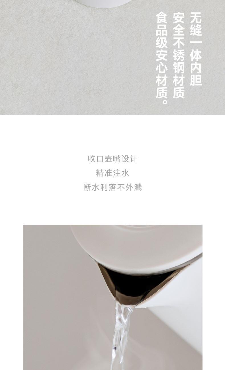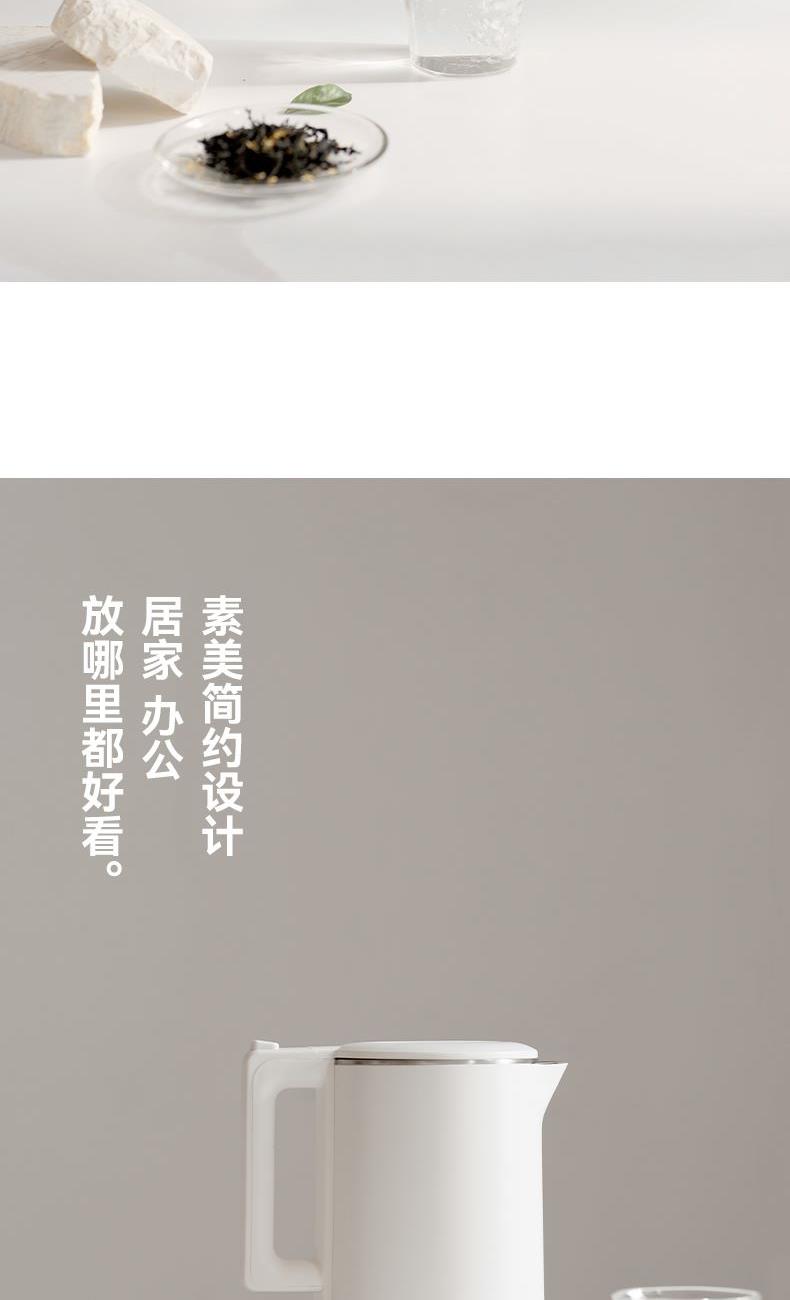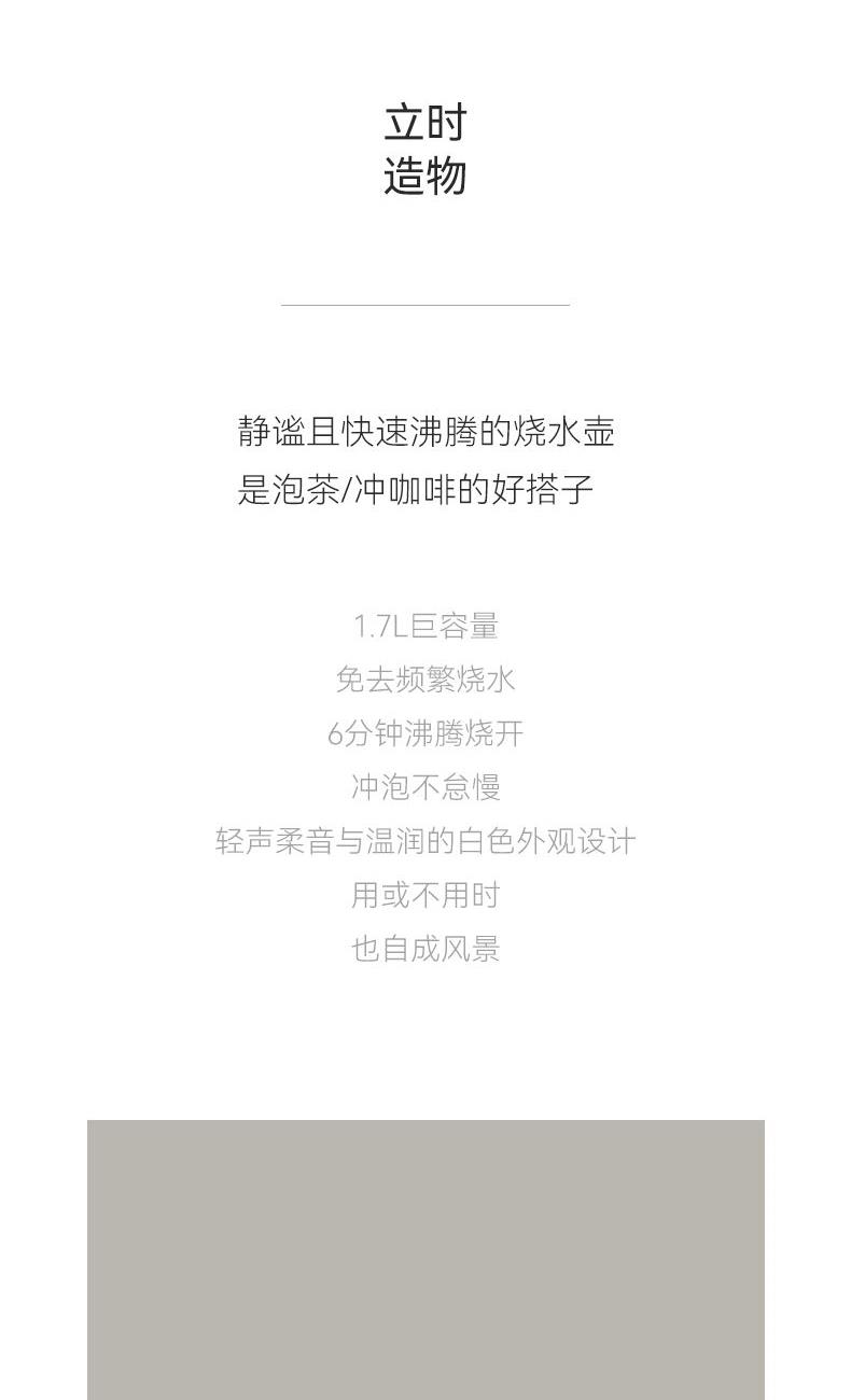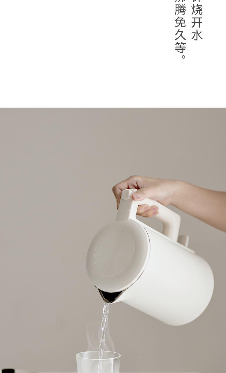 颜色:陶白色 容量:1.7L 额定功率:1500W 净重/毛重:1.3kg/1.58kg 产品尺寸:220*150*250mm 包装尺寸:207*207*320mm 条码 : 6941927410203 1. 1.7升容量,满足全天饮水量 2. 6分钟烧水时间 3. 通电即保温 4. 双层防烫壶身