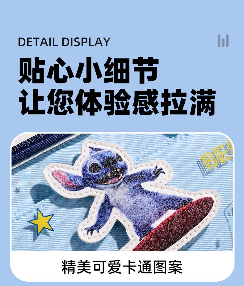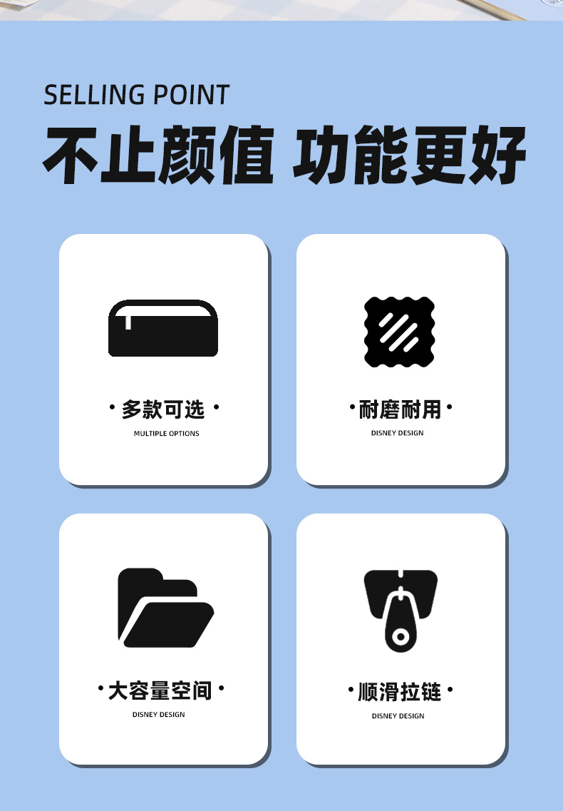 材质:聚酯纤维+高透TPU 尺寸:22*6.5*10.5CM 卖点: ①萌趣又实用双层多功能笔袋 ②两层大容量文具轻松收纳,分层设计,方便收纳 ③贴心小细节让您体验感拉满 ④精美可爱卡通图案、透明视窗设计、流畅顺滑拉链