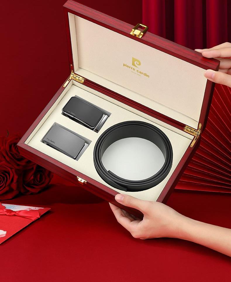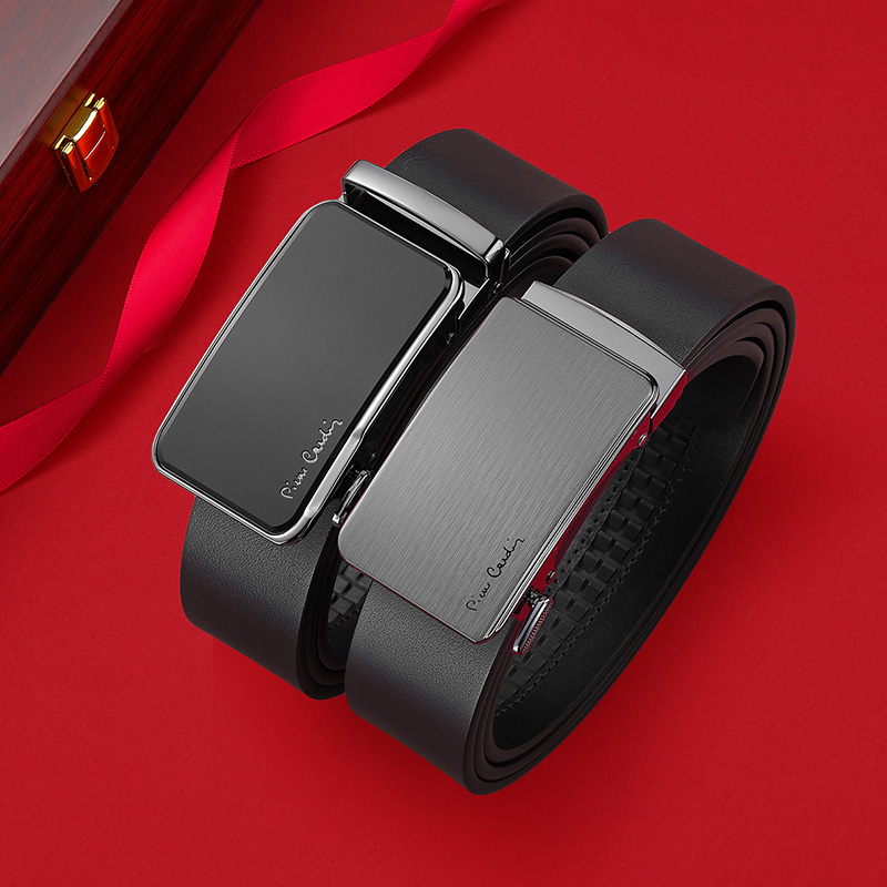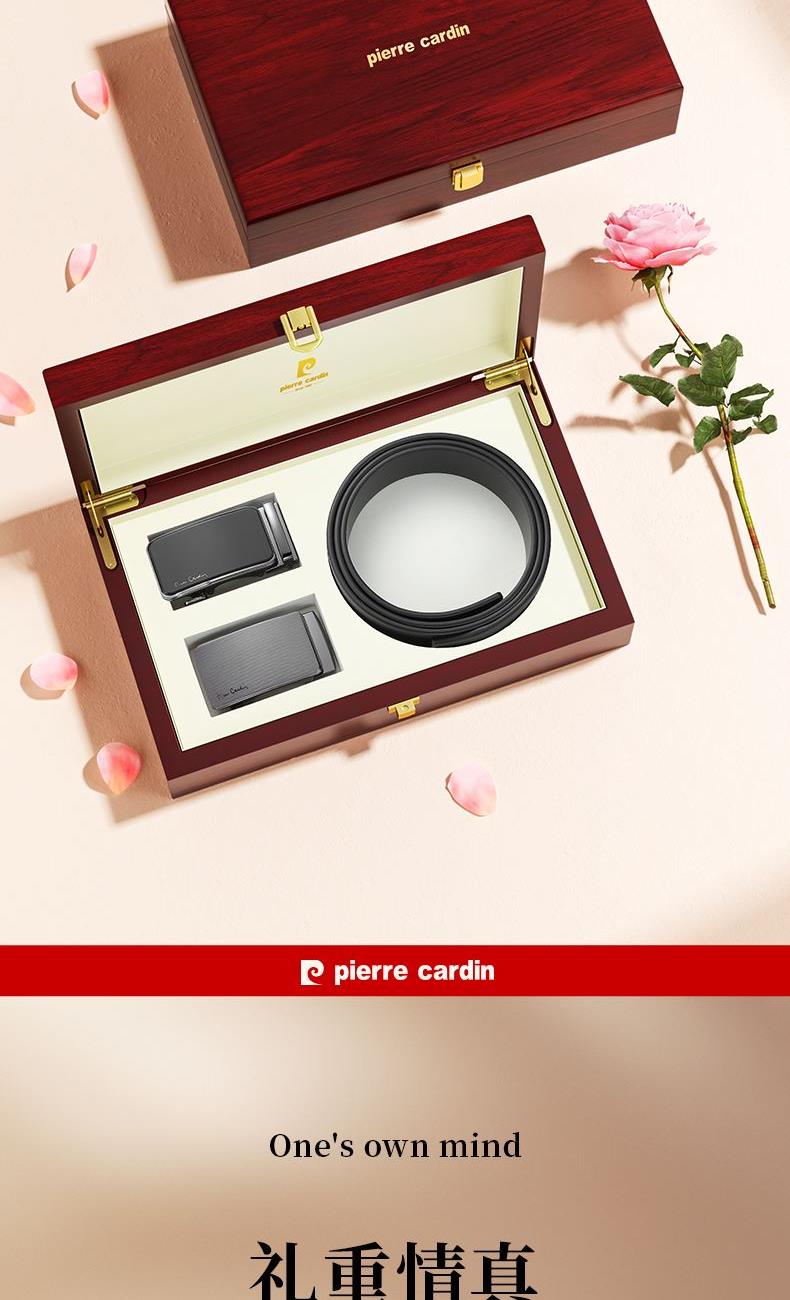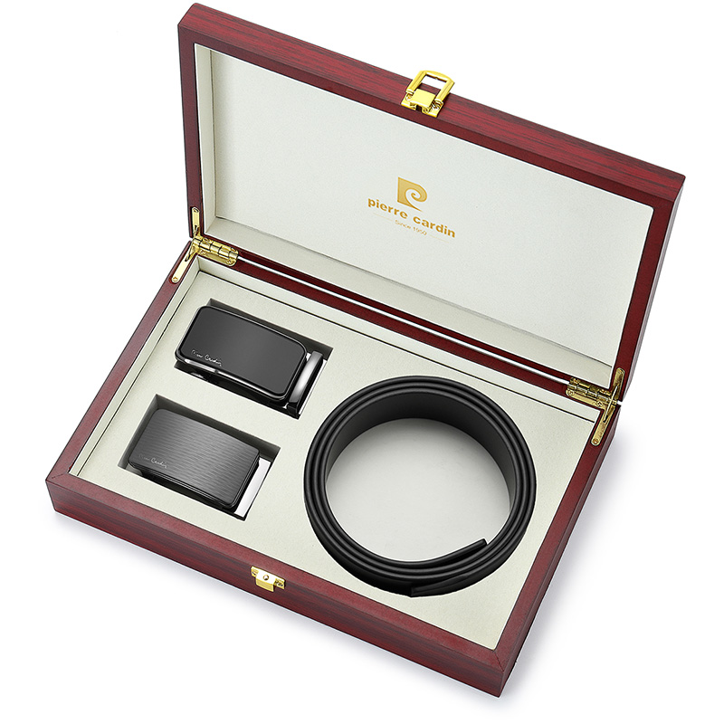 皮尔卡丹黑色双扣头皮带礼盒二件套