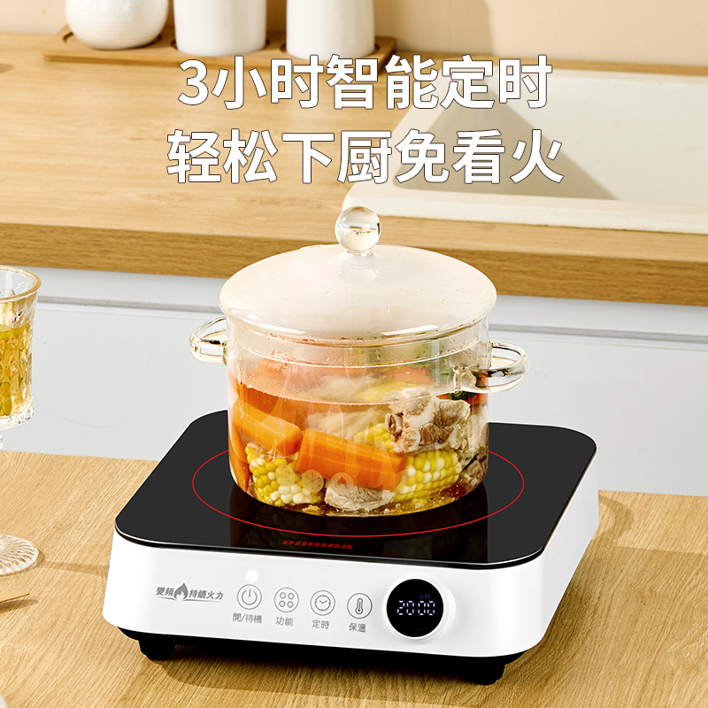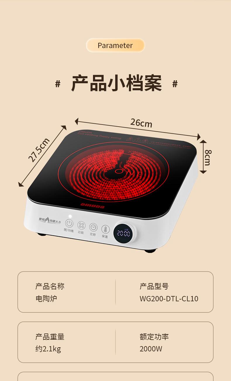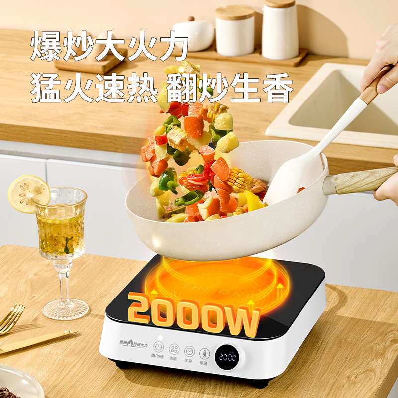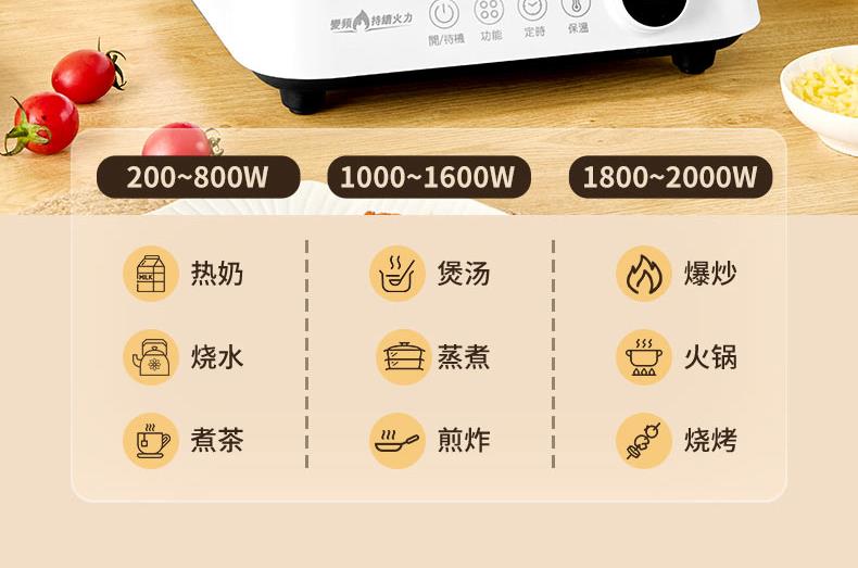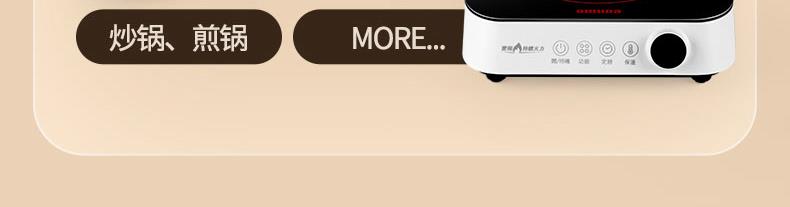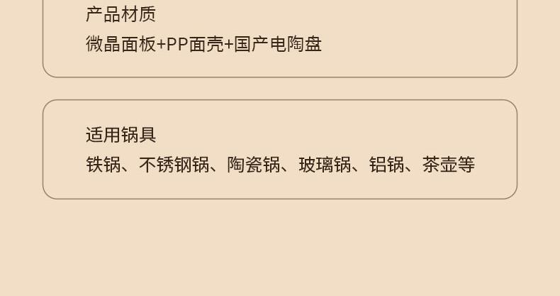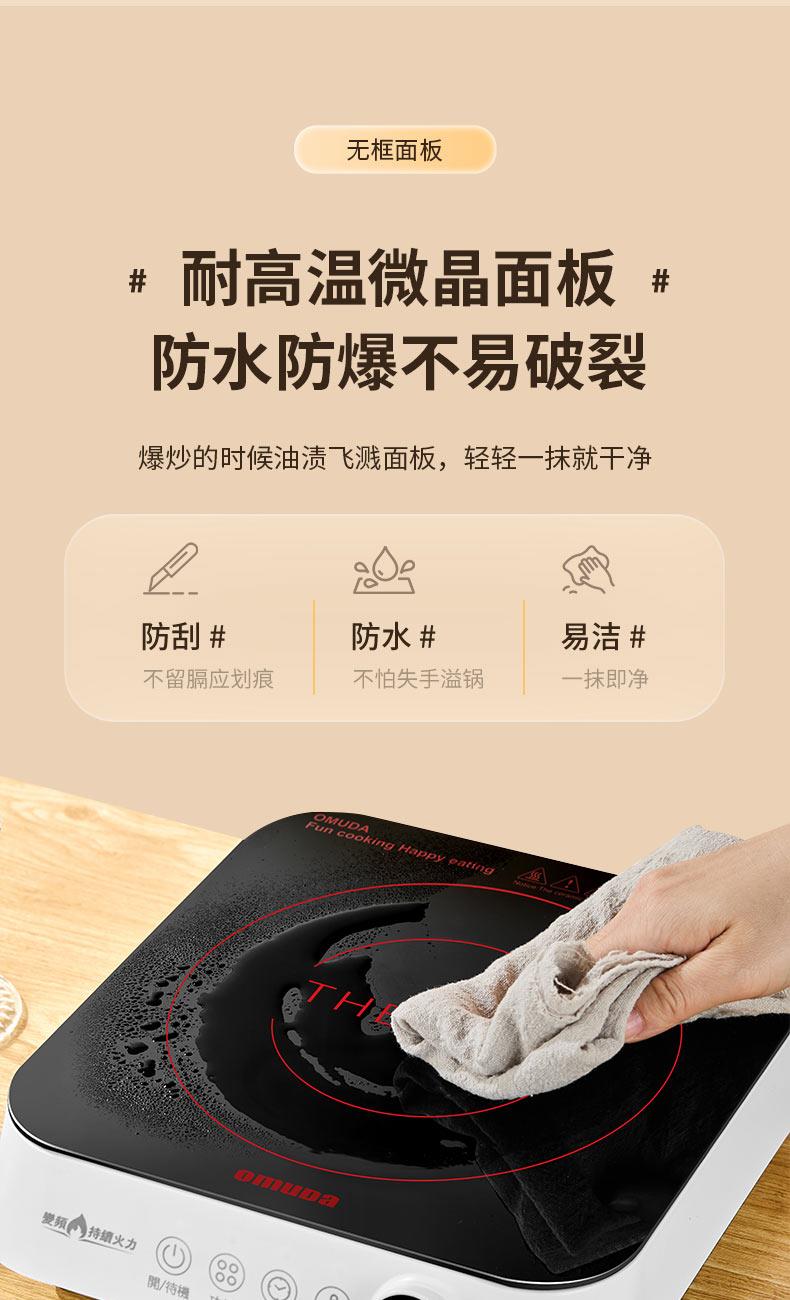 材质:微晶面板 功能:①2000W大功率猛火,炒菜火力超足,想怎么炒就怎么炒! ②静音没噪音、没辐射,孕妈用着超安心! ③8 档火力随便调,煎炒烹炸都能行 ④能定时 3 小时,定好时间就不用管,做饭超省心。 ⑤触控+旋钮双重操控方式 ⑥黑晶无框面板,耐高温还耐刮,久用如新一样。