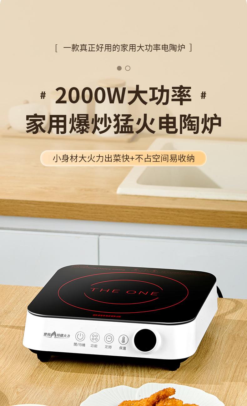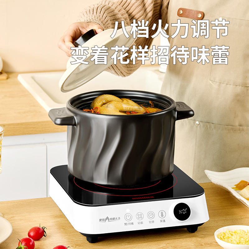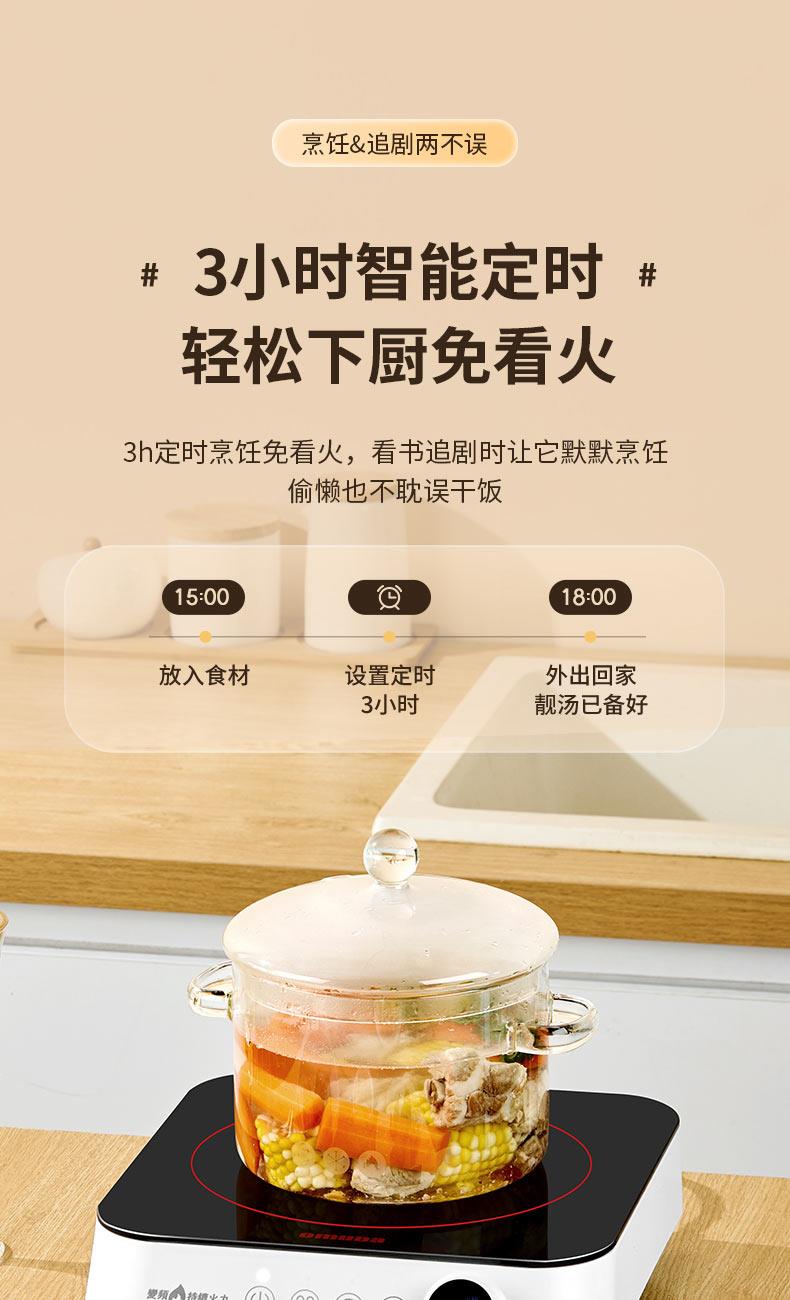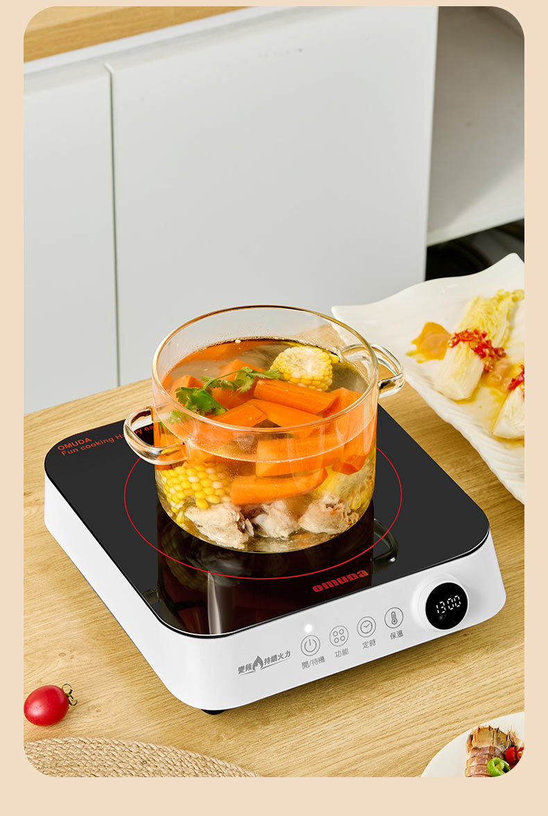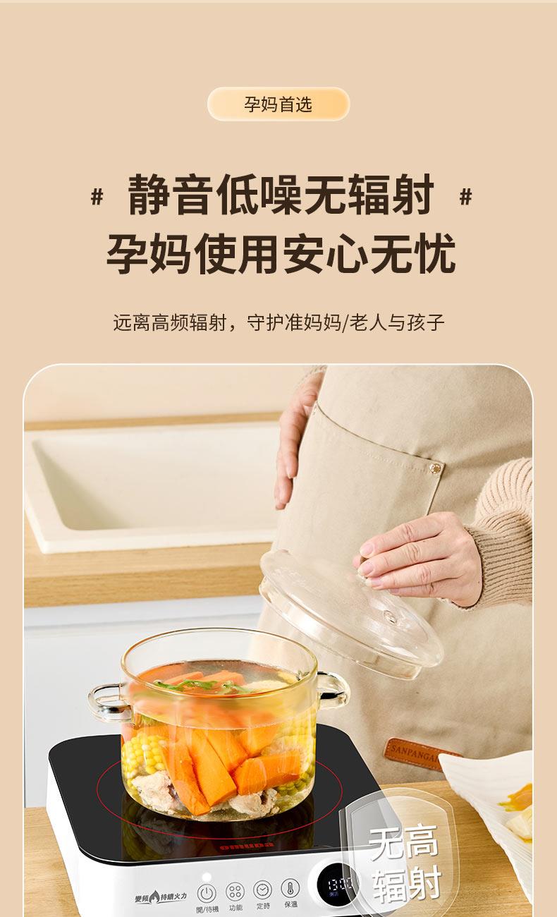 材质:微晶面板 功能:①2000W大功率猛火,炒菜火力超足,想怎么炒就怎么炒! ②静音没噪音、没辐射,孕妈用着超安心! ③8 档火力随便调,煎炒烹炸都能行 ④能定时 3 小时,定好时间就不用管,做饭超省心。 ⑤触控+旋钮双重操控方式 ⑥黑晶无框面板,耐高温还耐刮,久用如新一样。