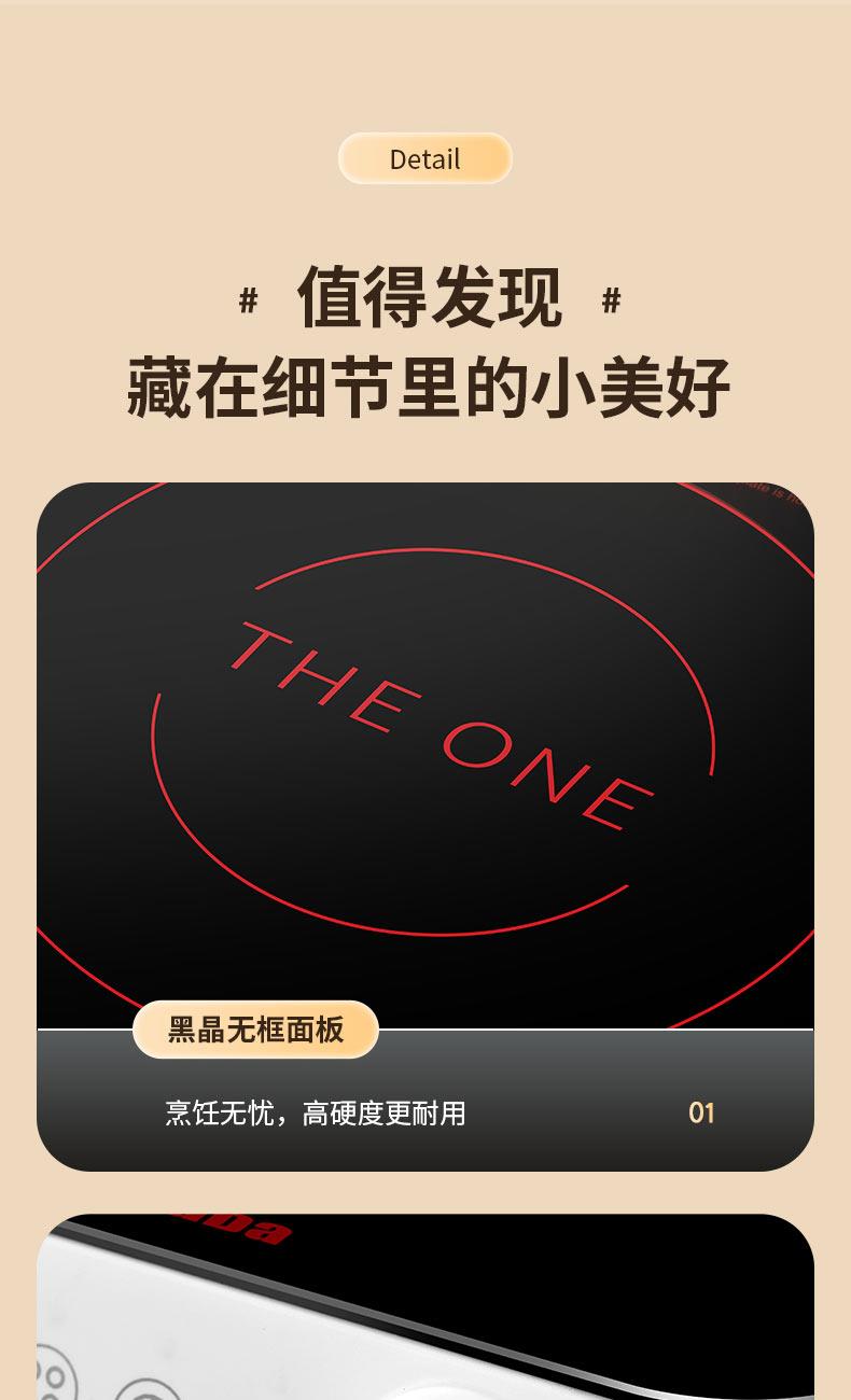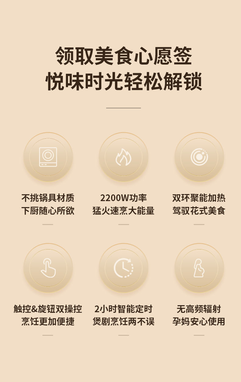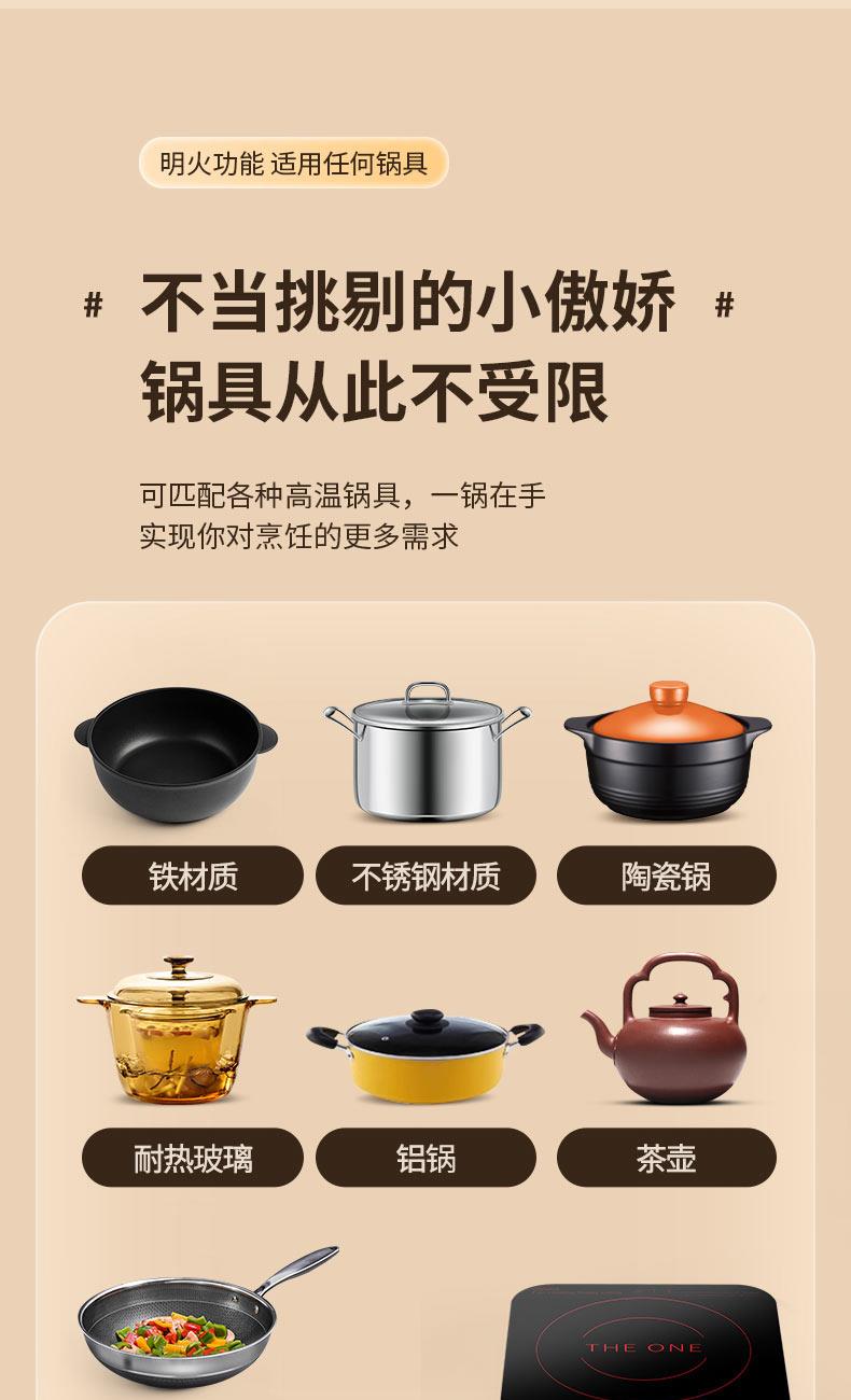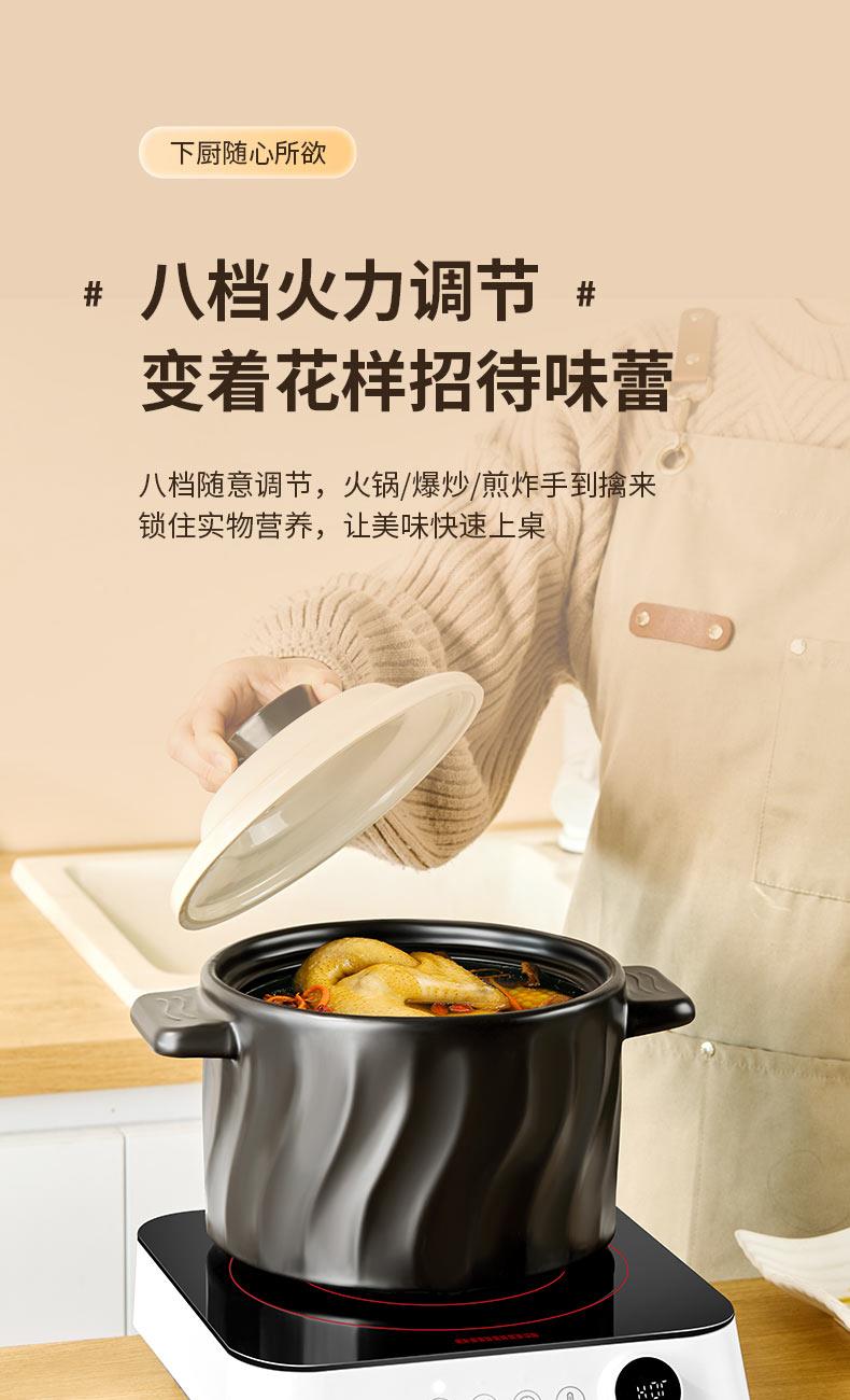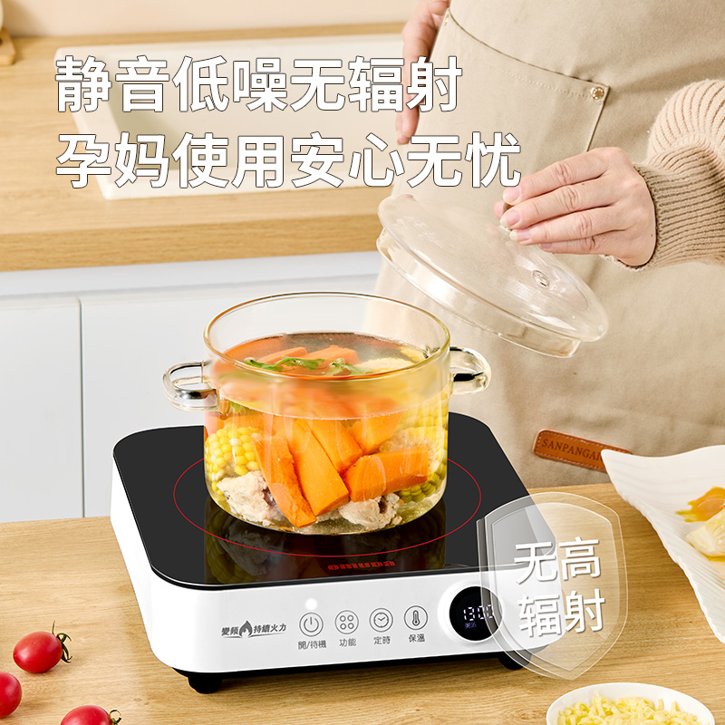 材质:微晶面板 功能:①2000W大功率猛火,炒菜火力超足,想怎么炒就怎么炒! ②静音没噪音、没辐射,孕妈用着超安心! ③8 档火力随便调,煎炒烹炸都能行 ④能定时 3 小时,定好时间就不用管,做饭超省心。 ⑤触控+旋钮双重操控方式 ⑥黑晶无框面板,耐高温还耐刮,久用如新一样。
