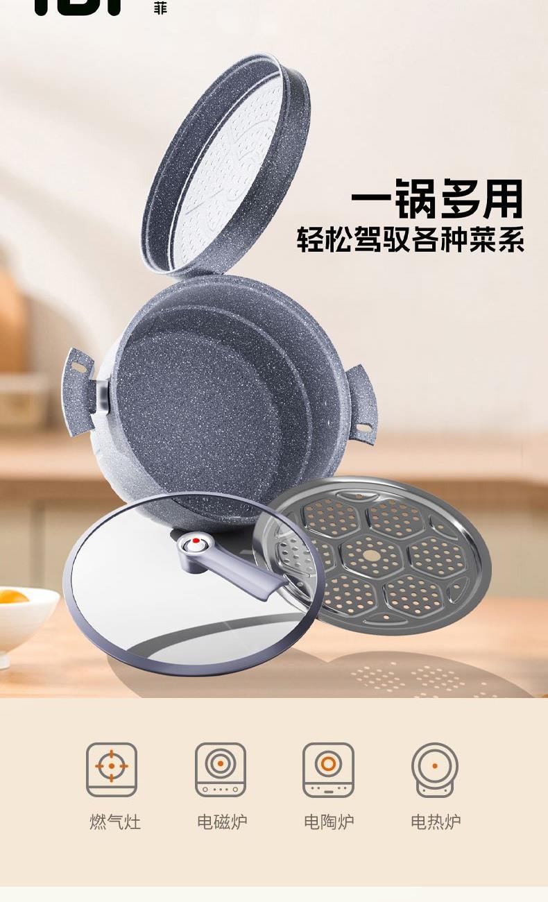 产品材质:食品接触用精铁 产品规格:340mm 执行标准:GB/T 32432-2015 GB 4806.10-2016 包装体积:45x13.x27cm 外箱尺寸:61x46x75cm 商品条码:6970070174137 适用灶具:燃气/电磁炉通用/电陶炉兼用 内装检验:一套(检验合格)一等品 产品颜色:麦饭石色 一套重量:4.2KG 专为家庭聚餐、餐饮商用设计的大容量蒸汤锅,集蒸、煮、炖、煲多功能于一体,满足多人用餐需求。采用优质材质,受热均匀,高效节能,是熬制高汤、蒸制海鲜、炖煮滋补食材的理想工具。 超大容量:轻松应对家庭聚会、餐厅后厨等场景。 深锅设计:适合整鸡、猪骨等大块食材,保留原汁原味。 适用多种热源:燃气灶、电磁炉、电陶炉等。 蒸炖两用:配备多层蒸笼,可同时蒸制面点、海鲜,下层熬汤,一锅出多菜。 汤锅+蒸格组合:自由拆卸,方便清洗。 人性化细节:防烫手柄:隔热防滑,操作安全。