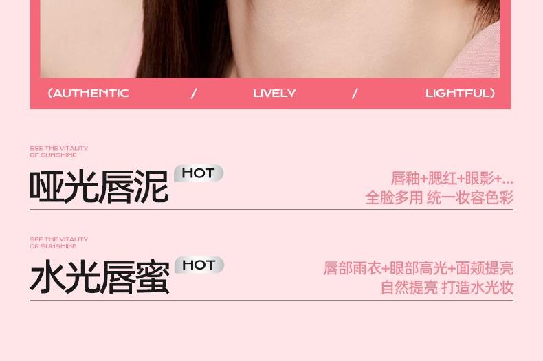 一,一支多用 氛围感妆容 哑光头:偏唇泥质地,顺滑柔焦隐匿唇纹效果好,和底妆不打架能够作为腮红泥和眼影打造全脸妆容 水光头:眼腮唇高光叠加,一键打造水光肌;料体薄亮贴唇贴肤,降低粘度。 二,哑而不干 柔雾妆效 1. 哑而不干,轻纱柔雾妆效 绵柔好延展不拔干不堆积,服帖不移位 打造出柔雾妆效 吸油缓慢,可保证哑而不干的妆效 2.舒适柔软肤感,打造持色嘟嘟唇 空气包裹般的丝滑触感 自带水光雨衣 三,微挥发弹性体 “持妆不易沾杯” 添加精华成分, 饱满透亮,轻盈锁色不黏腻 四,养护安全配方 添加乳木果油+白池花籽油,深层滋润,锁水保湿 添加多重植萃,唇部轻负担 精心调制配方,持妆亦好卸