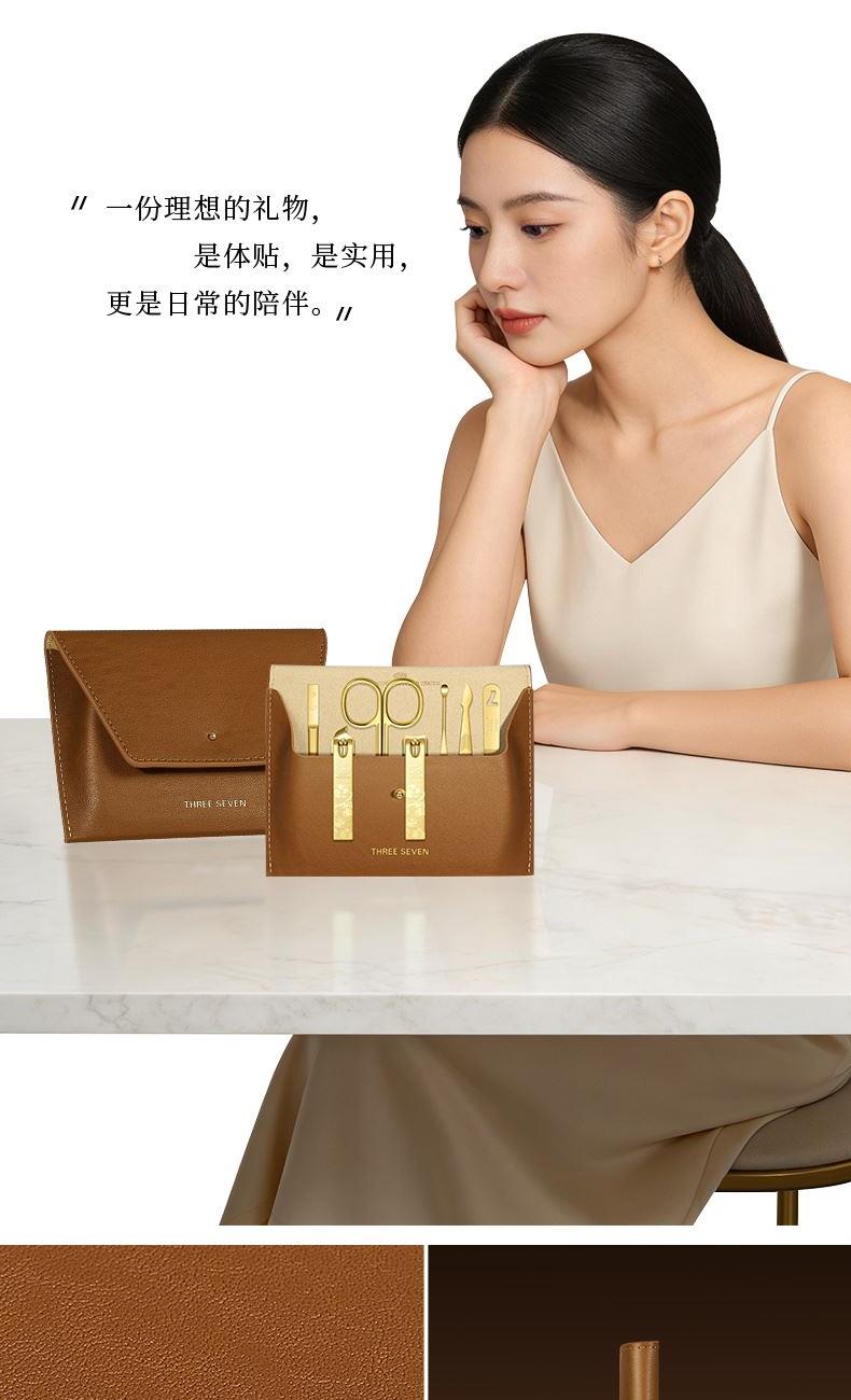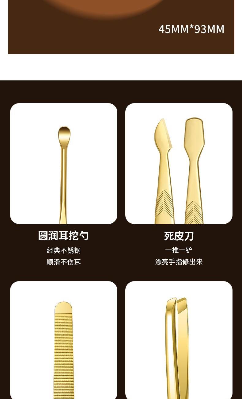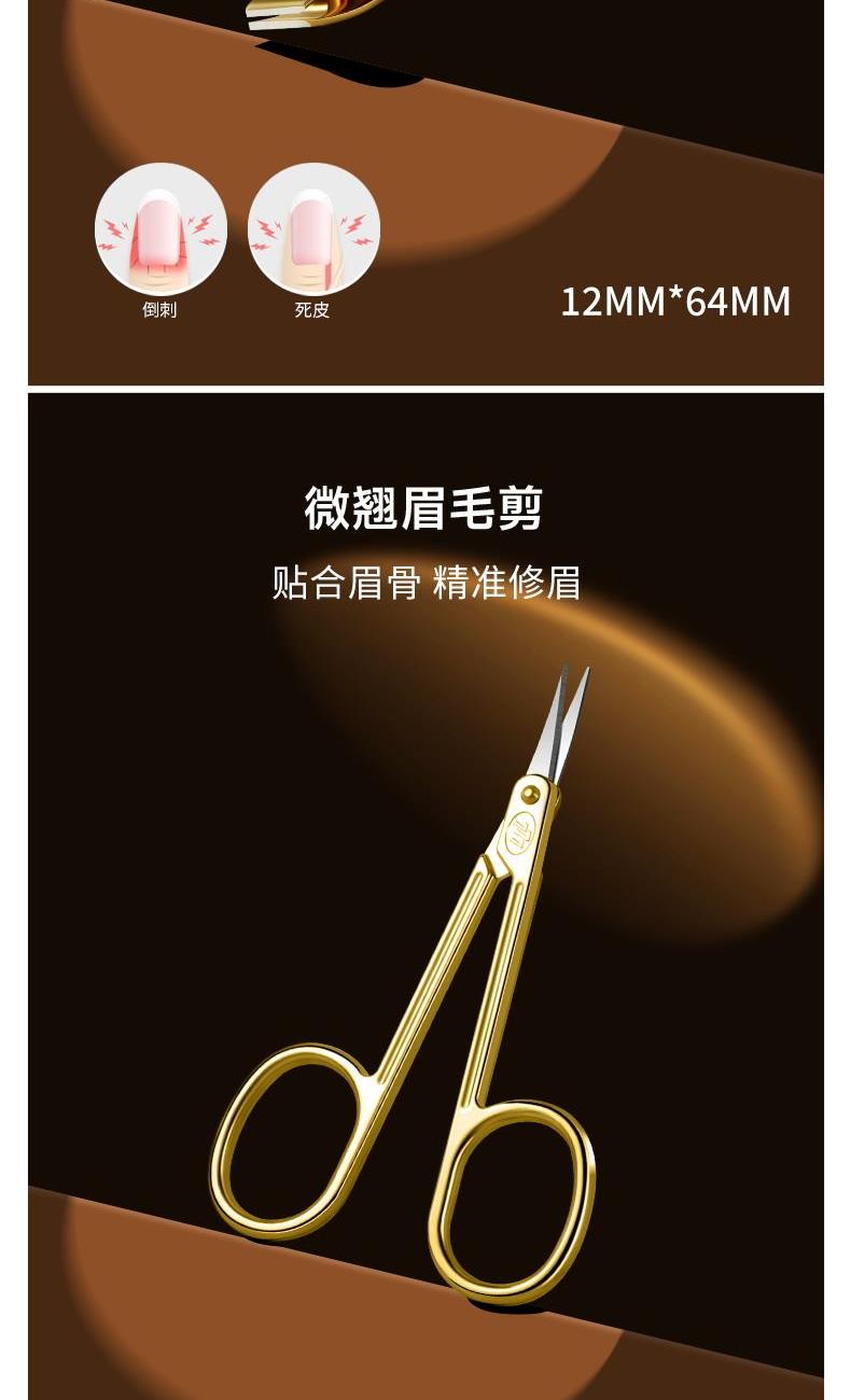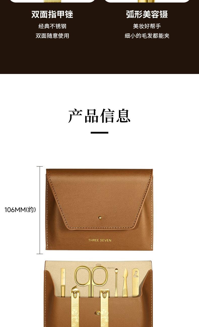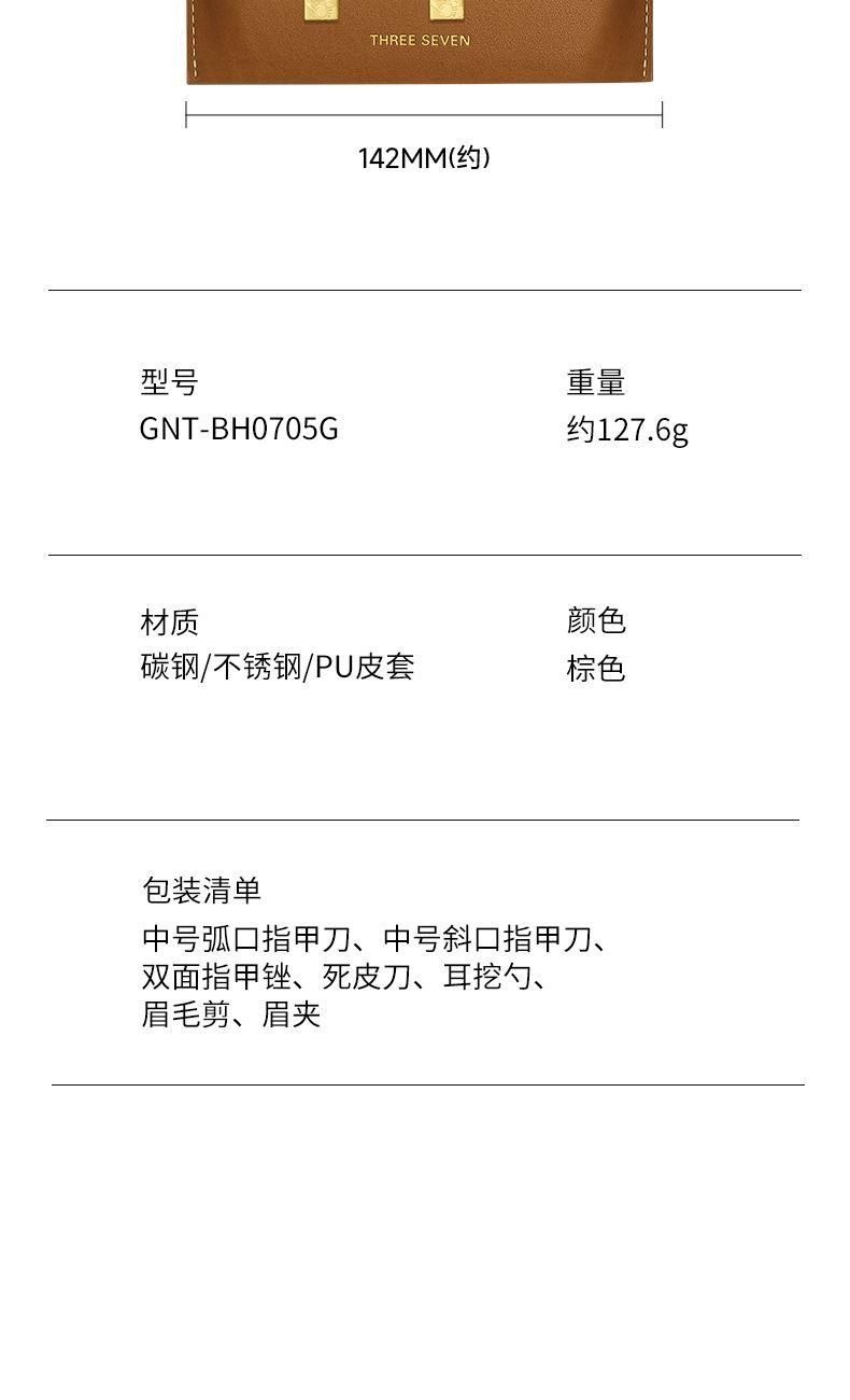 型号:GNT-BH0705G/棕/套装 材质:优质碳钢+PU皮套 规格:106*142mm/146g 产品颜色:棕色 套装内容:7件套(眉夹、中号平口、中号斜、眉剪、耳挖、锉片、死皮推)