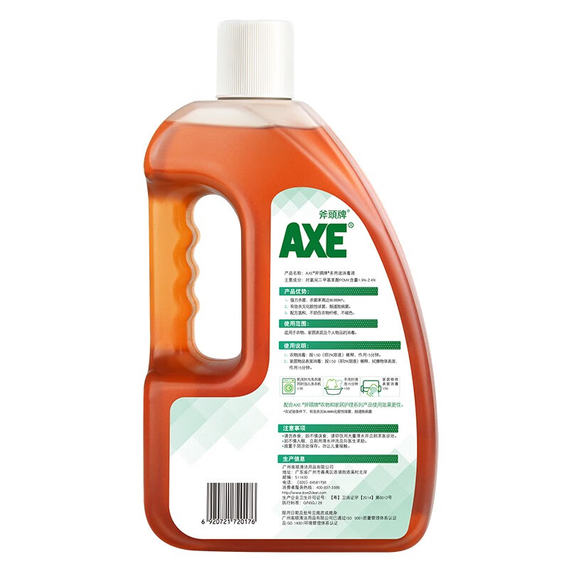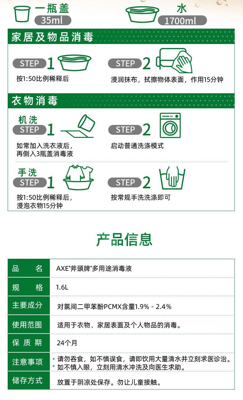 AXE多用途消毒液1.6L 使用范围: 适用于衣物、家居表面及个人物品的消毒。 保质期:24个月 注意事项: 请勿吞食,如不慎误食,请即饮用大量清水并立刻求医诊治。 如不慎入眼,立刻用清水冲洗及向医生求助。 储存方式 放置于阴凉处保存。勿让儿童接触。