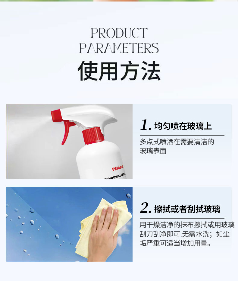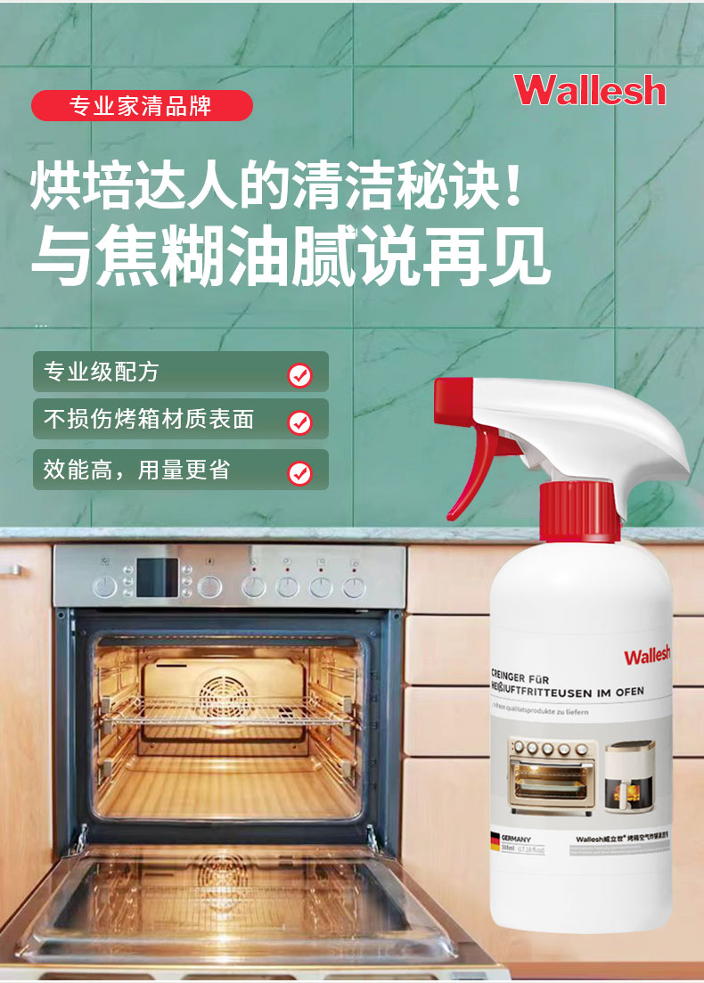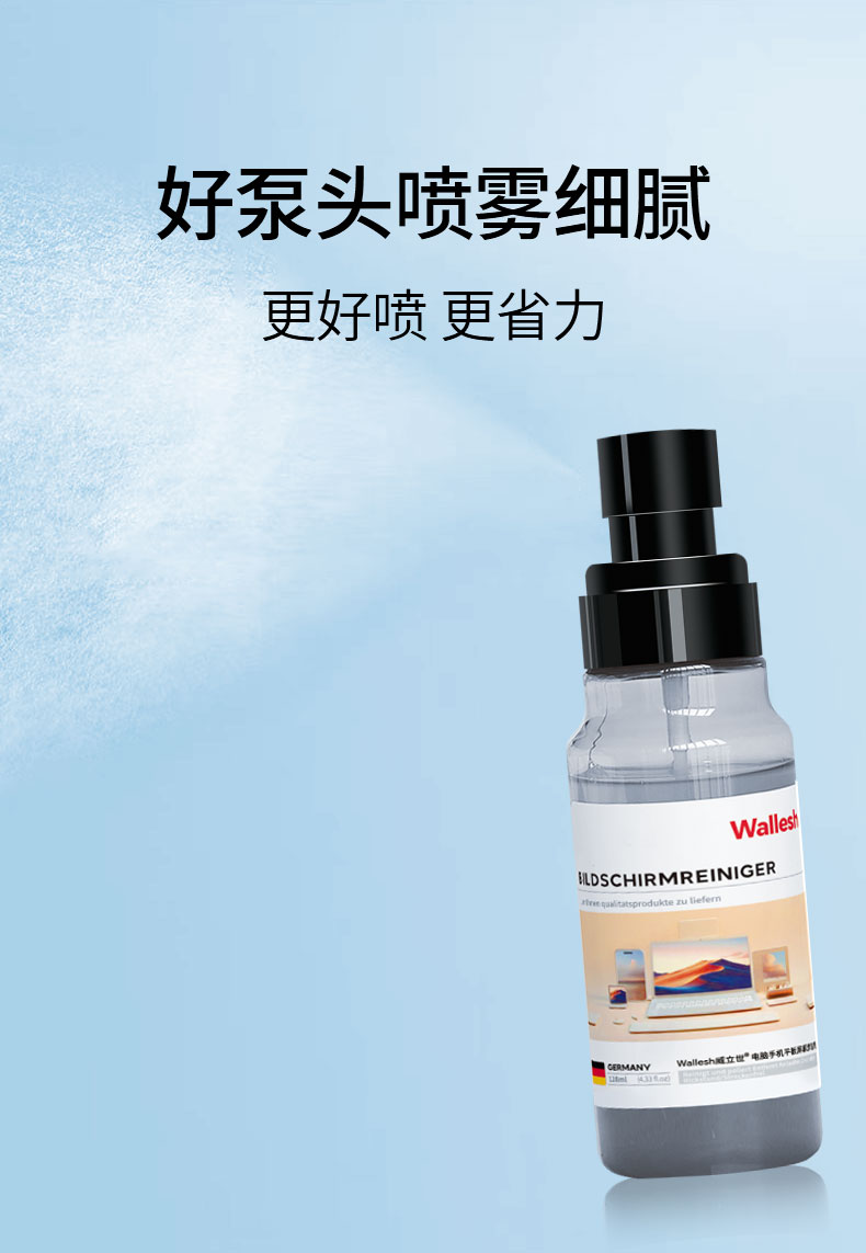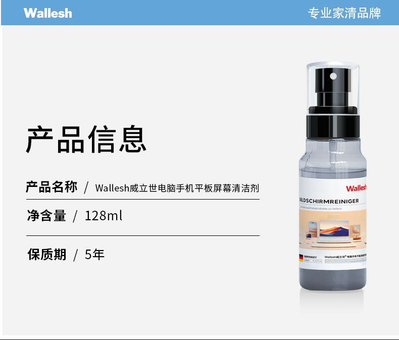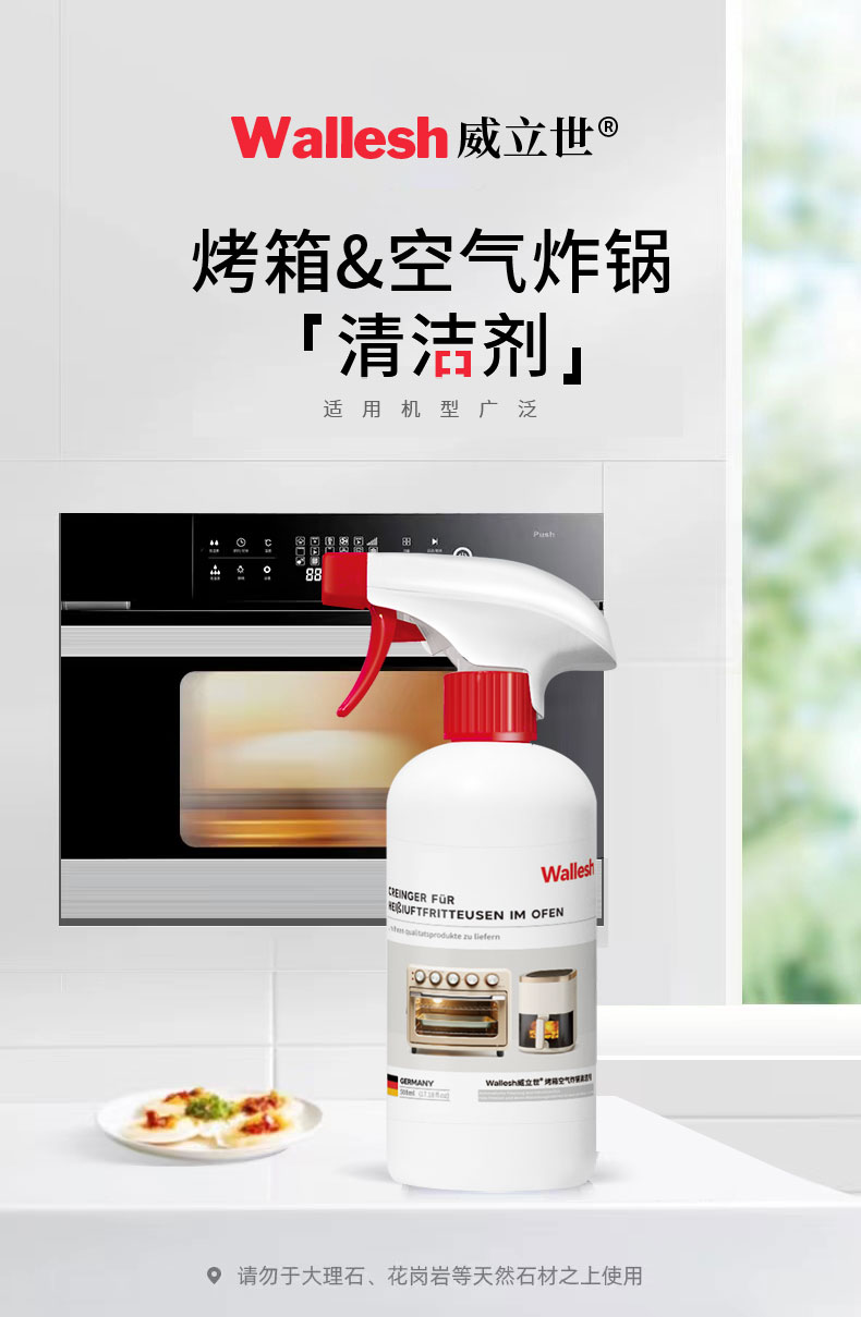 威立世Wallesh电脑手机平板屏幕清洁剂 规格:128ml 产品特点:屏幕清晰、焕新无痕、速干配方;1:1配超细纤维清洁布;使用后光洁顺滑防静电,如焕新机 威立世Wallesh玻璃门窗清洁剂规格:508ml 产品特点:可有效清洁玻璃门窗,保持玻璃干净闪亮。迅速瓦解玻璃水洗表面污垢,不留水痕,更能有效防尘 威立世Wallesh去油污清洁剂规格:508ml 产品特点:强效去油污,软化瓦解油烟机、煤气灶、壁面等处的粘腻油垢、油渍和油层,保持厨房环境清洁 威立世Wallesh烤箱空气炸锅清洁剂规格:508ml 产品特点:能快速清除各类油污油垢及焦糊物残留,适用于烤箱、空气炸锅、微波炉、烤架、灶台、油烟机等 威立世Wallesh地板清洁剂 规格:508ml 产品特点:有效清洁地板灰尘、污渍,使地板洁净靓丽。添加增亮成分,光亮如新。速干配方,不留水痕,干爽不粘脚。茉莉花香,散发舒适清香 威立世Wallesh薰衣草柔顺香氛洗衣液规格:1kg 产品特点:99.98%除螨,进口香精香氛,72小时持久留香,深层去污,柔软护衣;无甲醛、无磷、无荧光剂