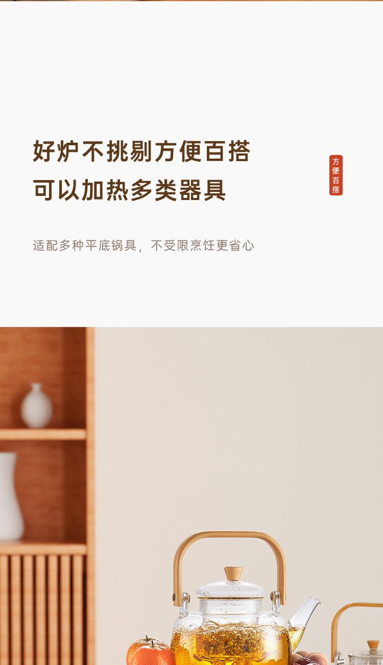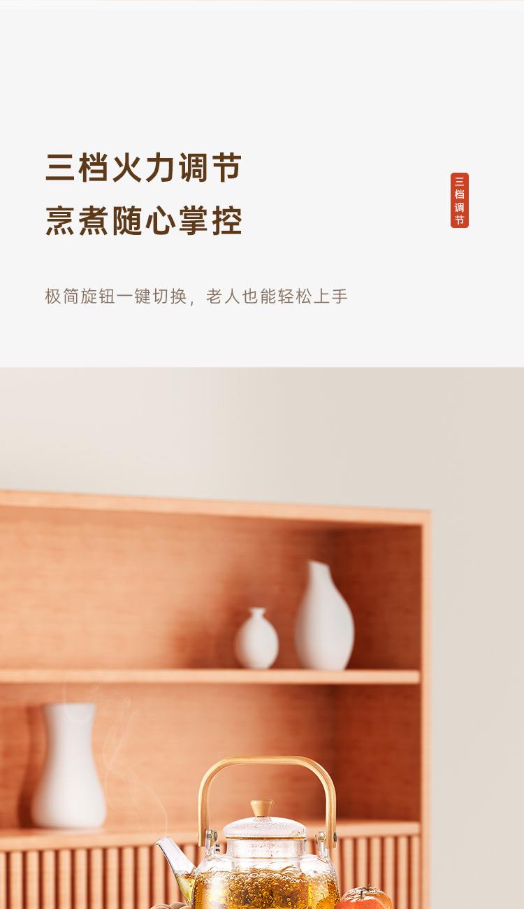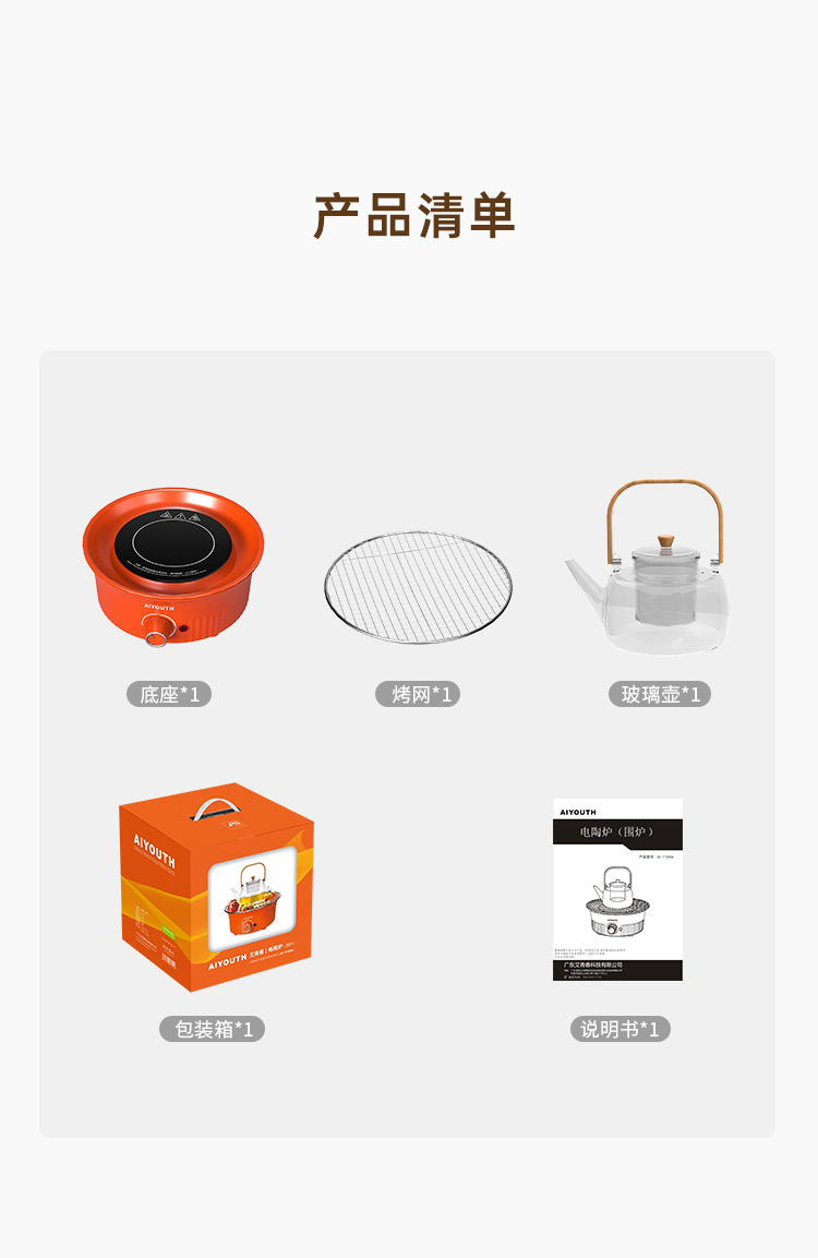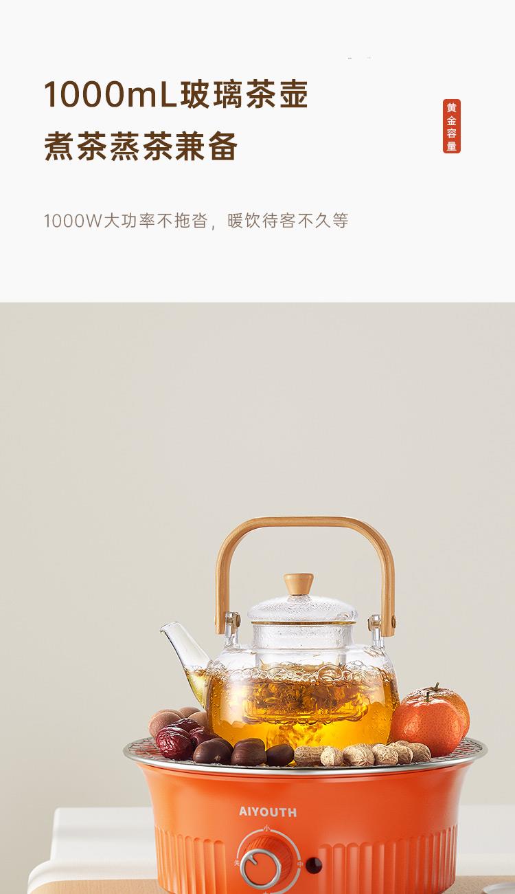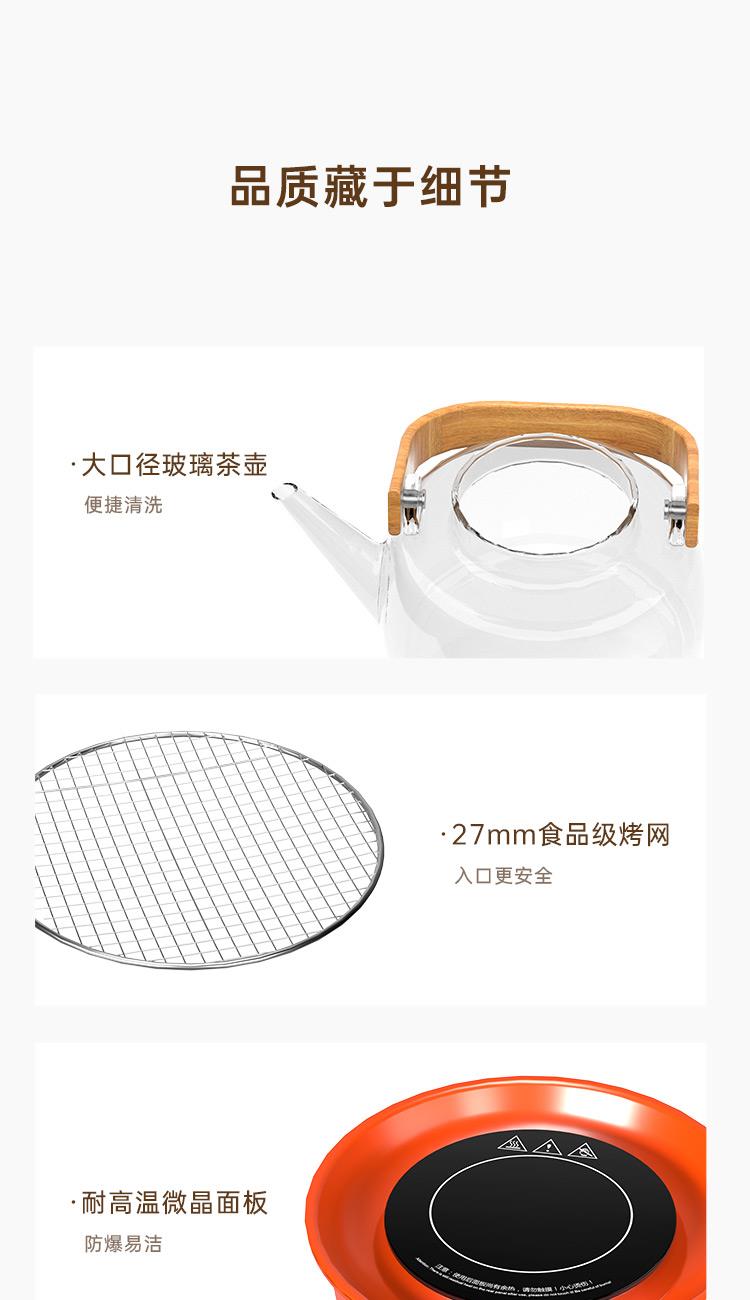 额定电压:220V~ 额定频率:50HZ 额定功率:1000W 产品毛重: 2.5kg 产品颜色:橙色 包装尺寸:315*315*171mm 包装清单:实机、玻璃壶,烤网 、说明书 主要材质:微晶板 1.红外聚能,垂直加热 2. 适配耐高温茶壶,适合多种常见壶具 3. 可蒸煮多种茶叶,不串味,茶味更醇 4. 三档火力调节,旋钮操控,控温更贴心 5. 黑晶面板,防水抗压,抗高温,易清洁