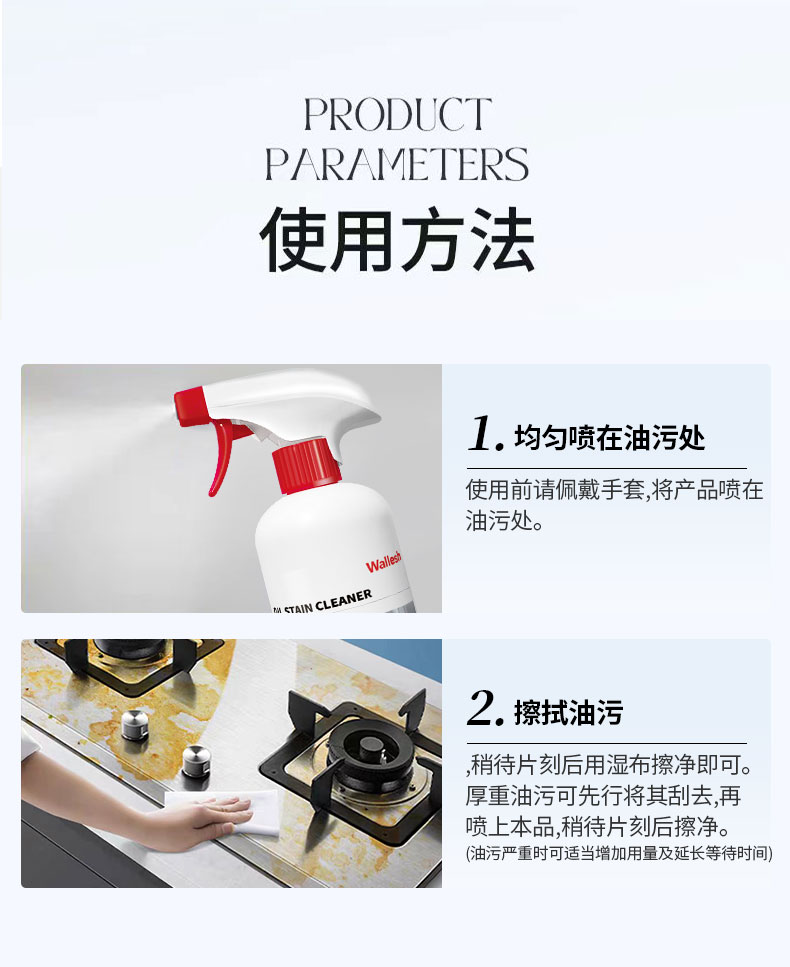 产品特点:强效去油污,软化瓦解油烟机、煤气灶、壁面等处的粘腻油垢、油渍和油层,保持厨房环境清洁