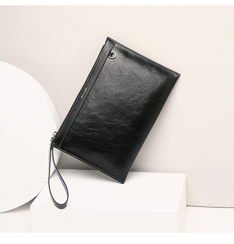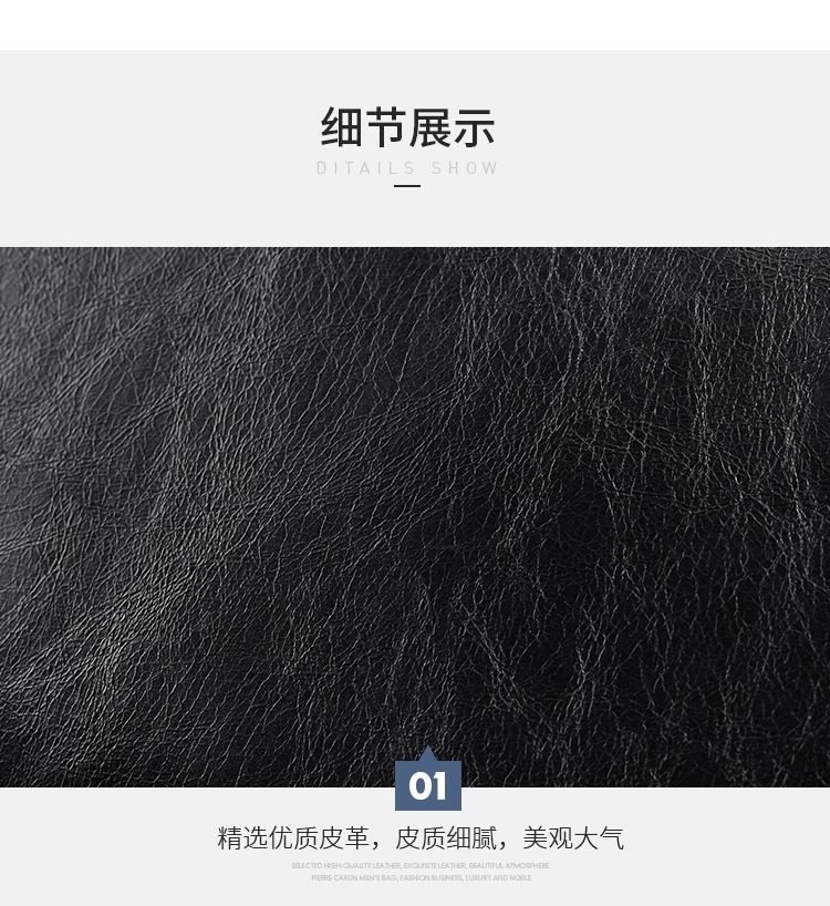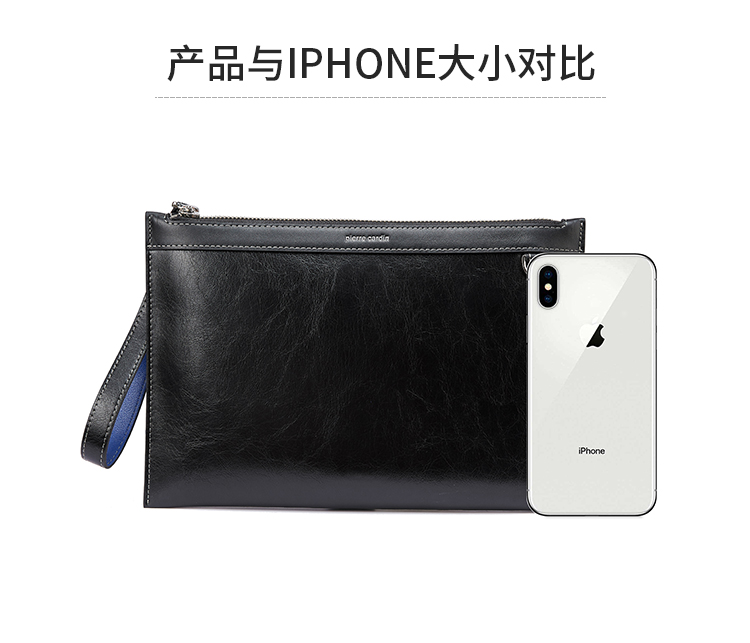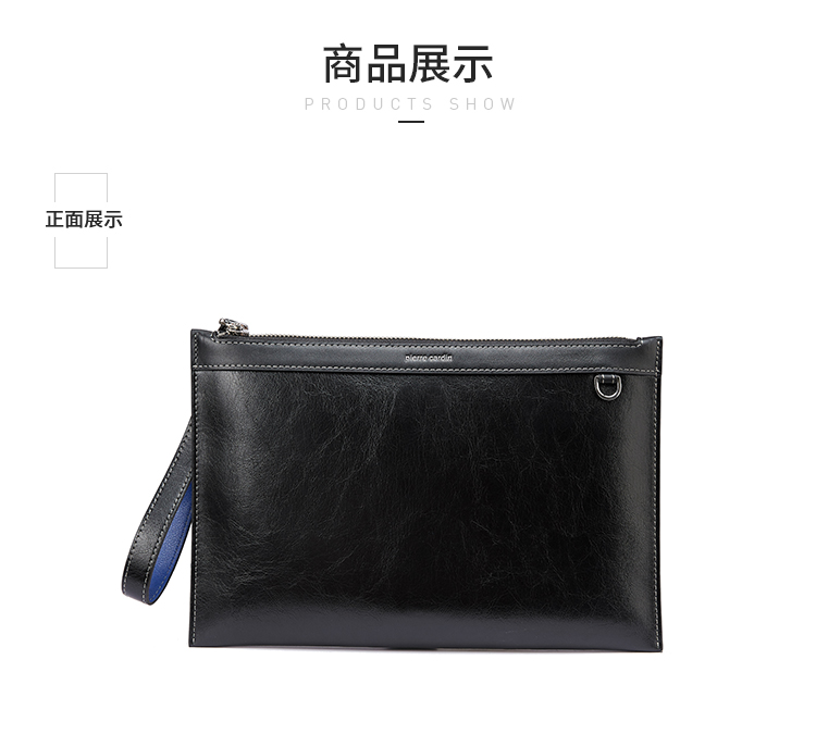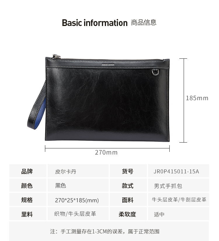 货号:JR0P415011-15A 颜色:黑色 款式:男式手拿包 规格:270*25*185mm 面料:牛头层皮革/牛剖层皮革 里料:织物/牛头层皮革